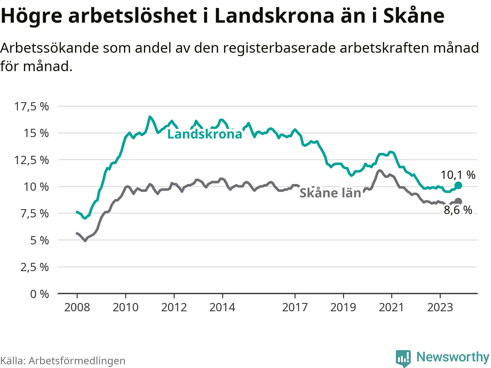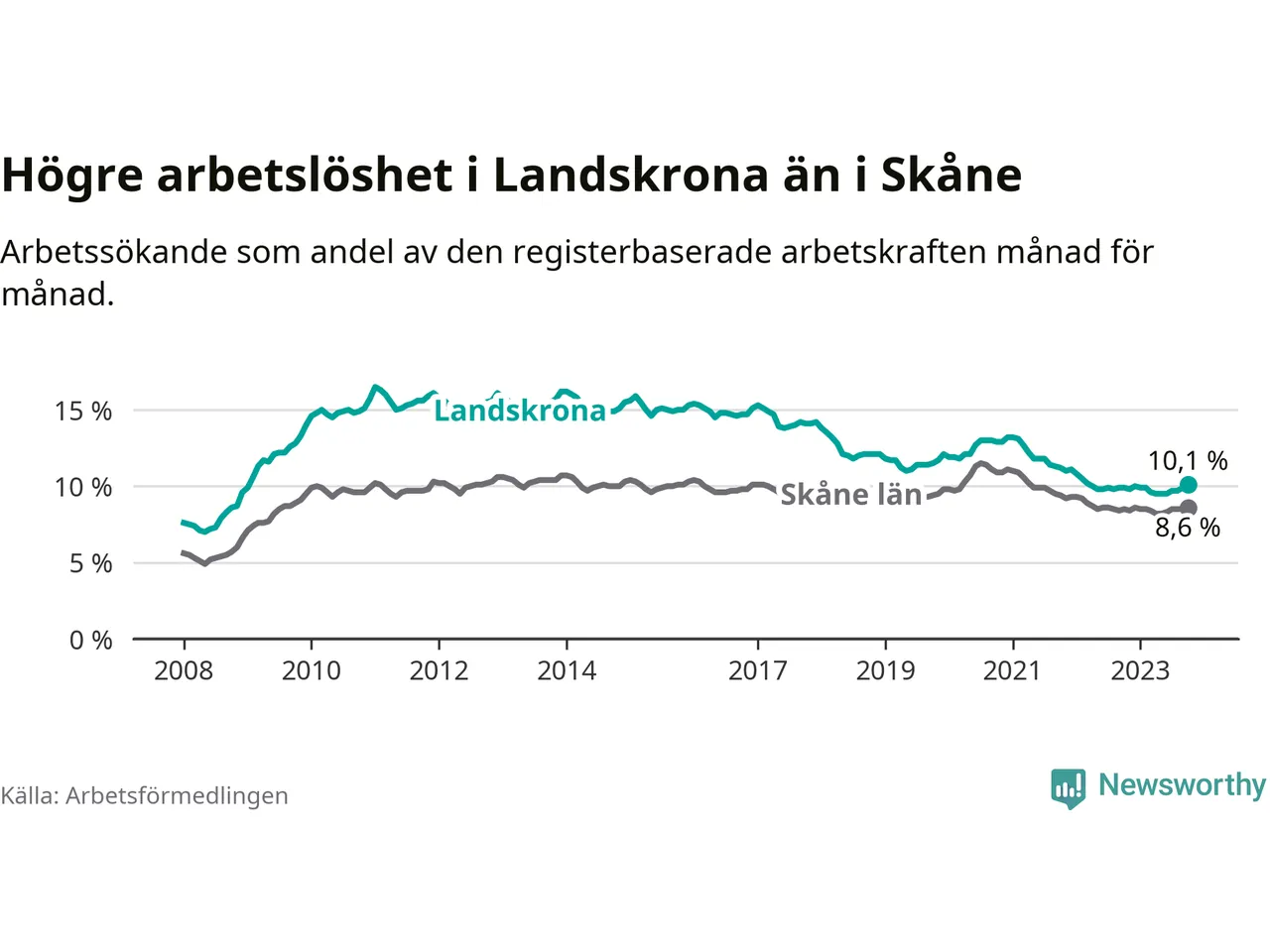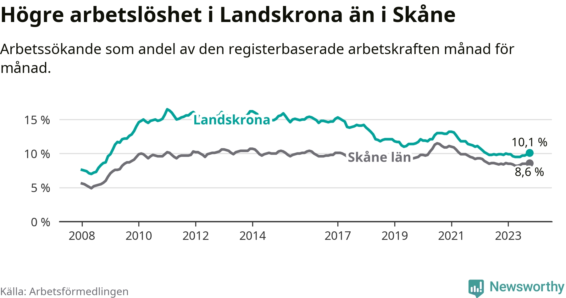 Landskrona hade redan tidigare högre arbetslöshet än snittet i hela Skåne län och nu växer klyftan (10,1 procent i kommunen, jämfört med 8,6 procent i hela länet). Vellinge har den lägsta arbetslösheten i länet (3,3 procent), medan Malmö har den högsta (12,3 procent). För att Landskrona skulle komma ner i samma arbetslöshetsnivå som Vellinge skulle 1 501 personer behöva sysselsättas.