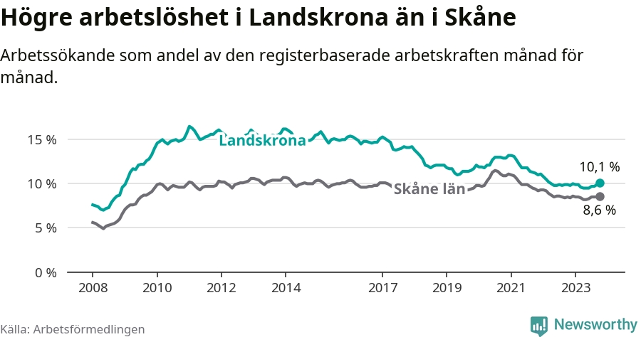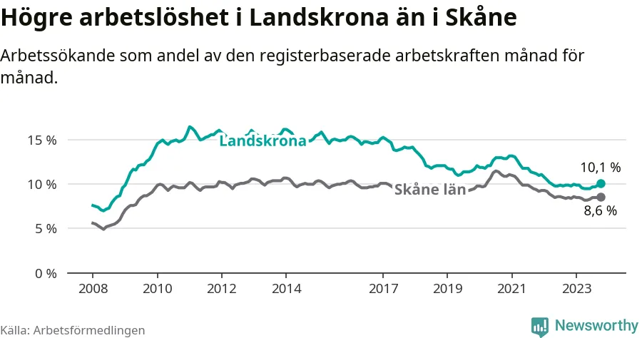 Under oktober månad rapporterade Landskrona kommun en total arbetslöshet på 10,1 procent. Det är en ökning jämfört med samma tidpunkt i fjol (+0,2 procentenheter). Även i Skåne län stiger arbetslösheten något.
