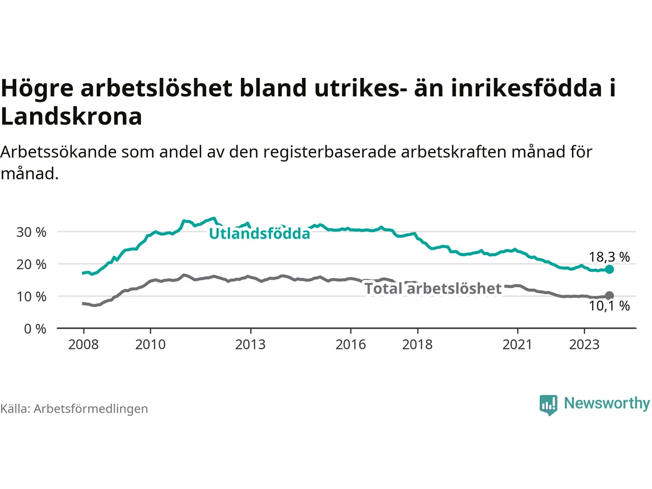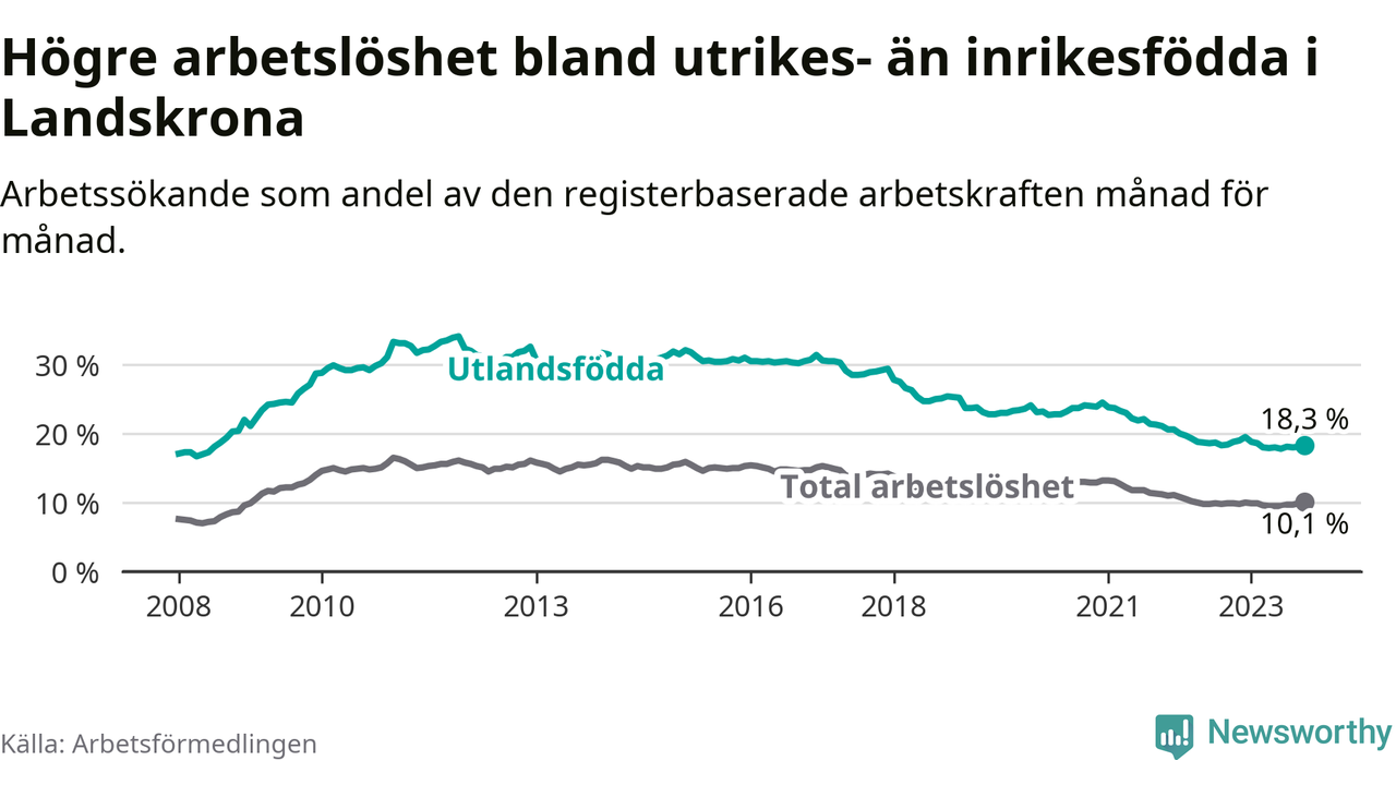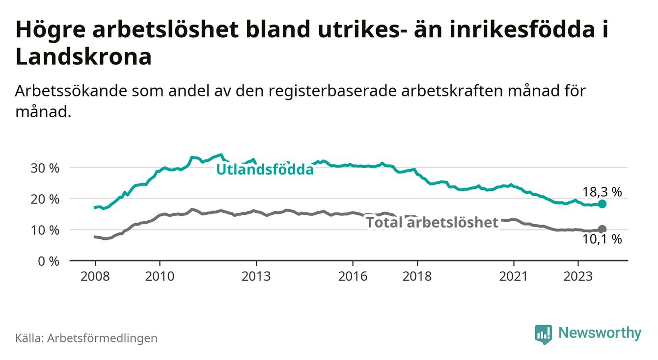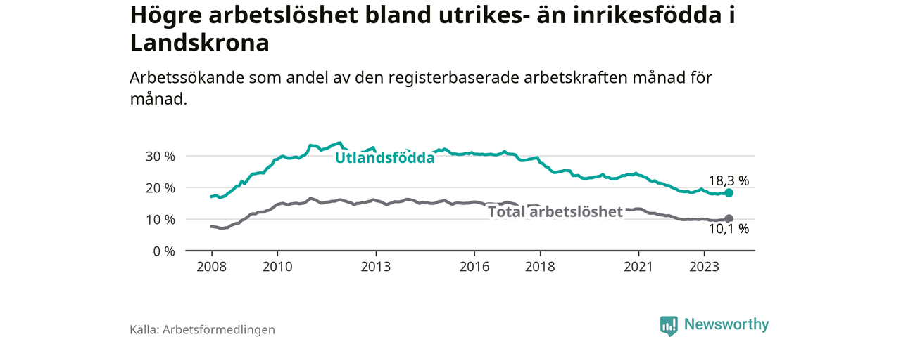 Skillnaden i arbetslöshet mellan utrikesfödda och hela befolkningen är 8,2 procentenheter i Landskrona. Det är en mindre skillnad än för ett år sedan (−0,7 procentenheter).