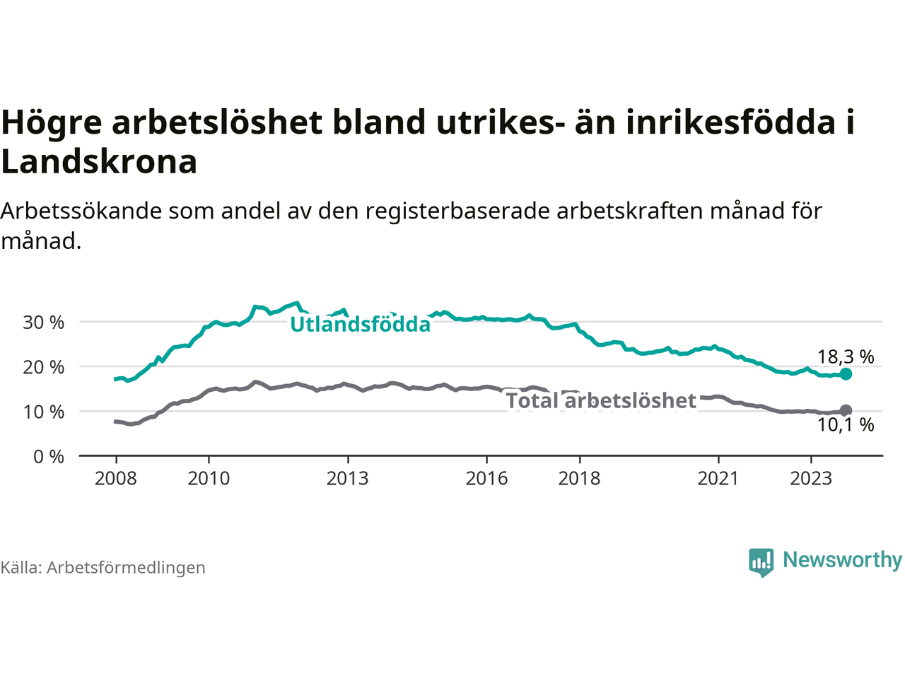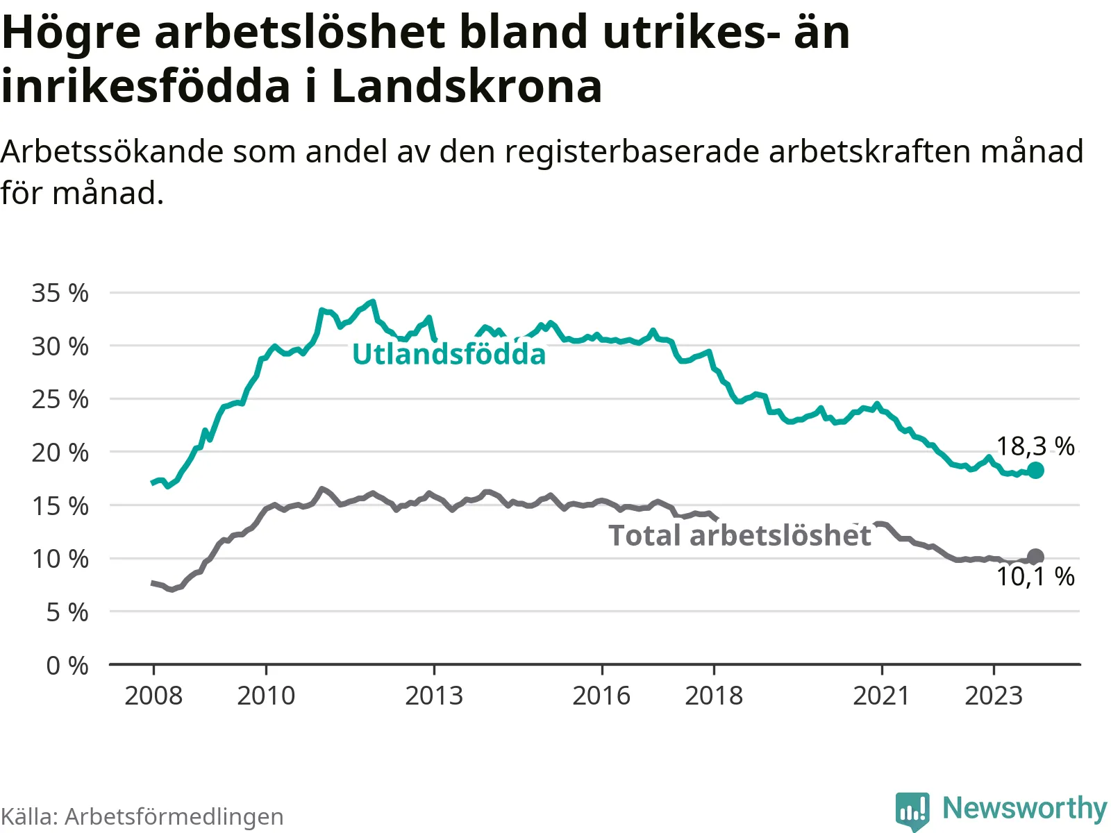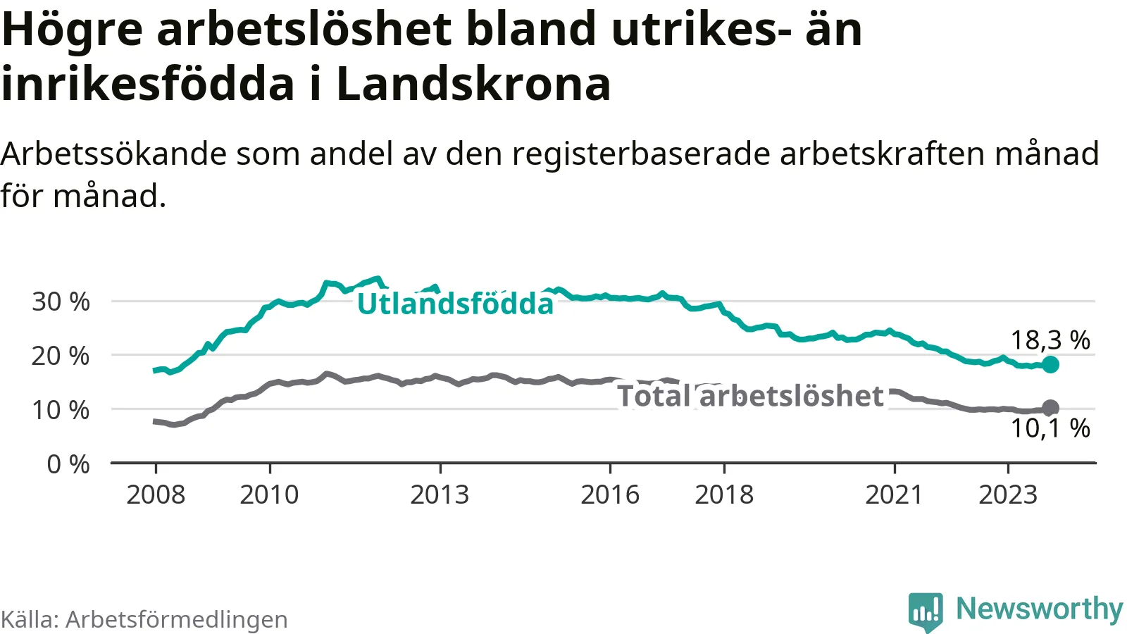 Skillnaden i arbetslöshet mellan utrikesfödda och hela befolkningen är 8,2 procentenheter i Landskrona. Det är en mindre skillnad än för ett år sedan (−0,7 procentenheter).