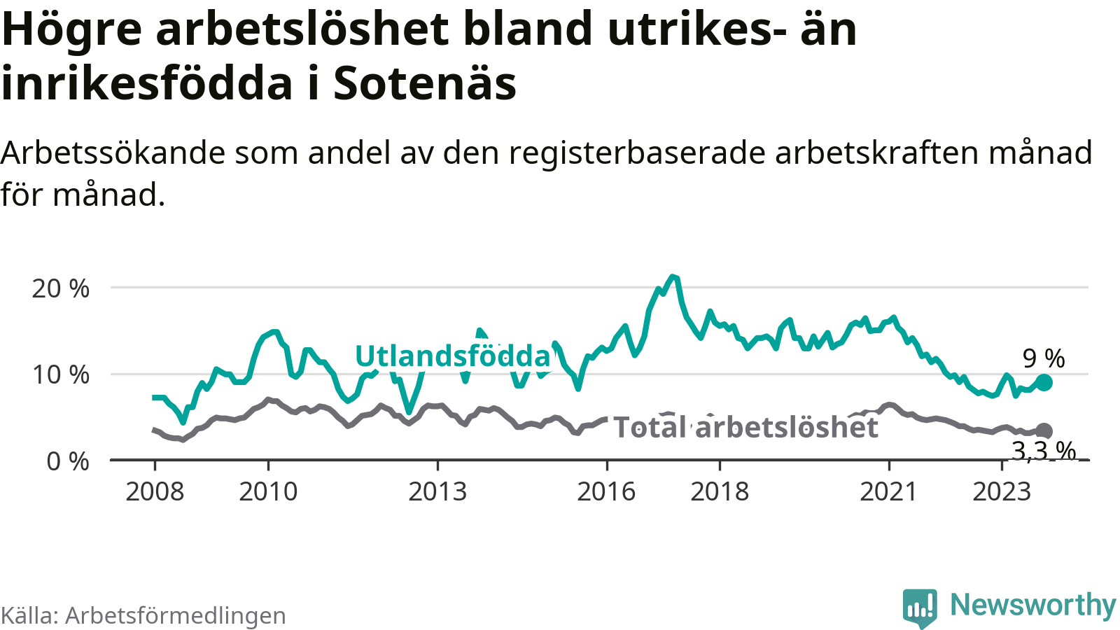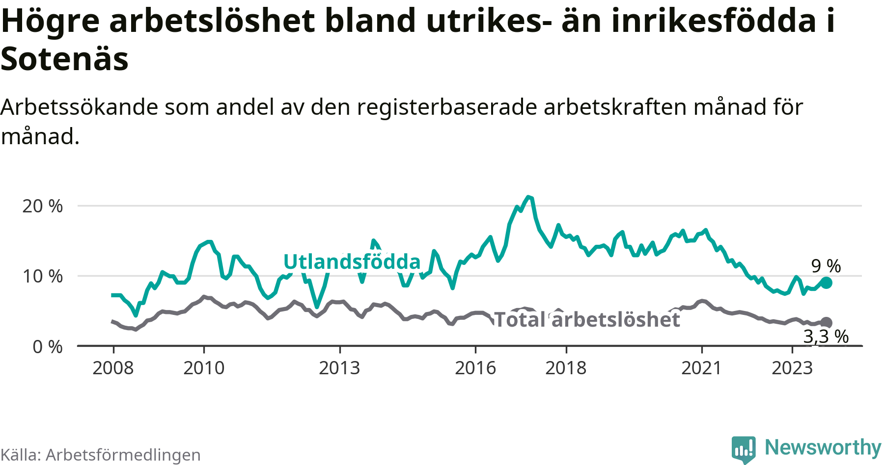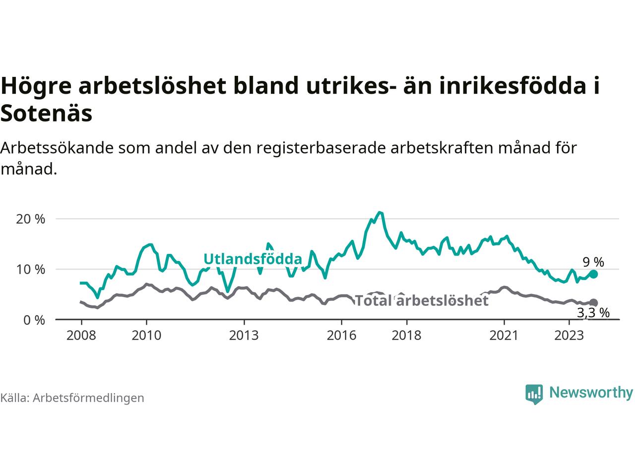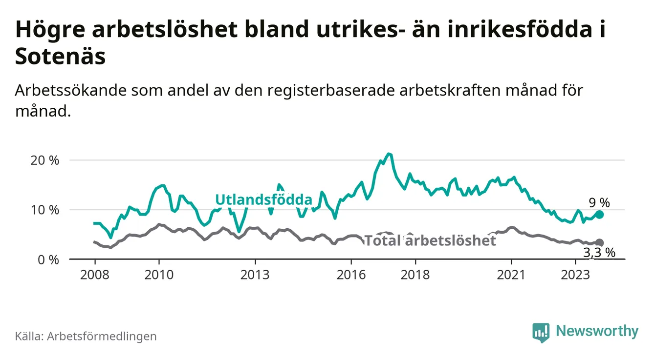Läs mer om arbetslösheten bland utlandsfödda längre ner i den här texten.