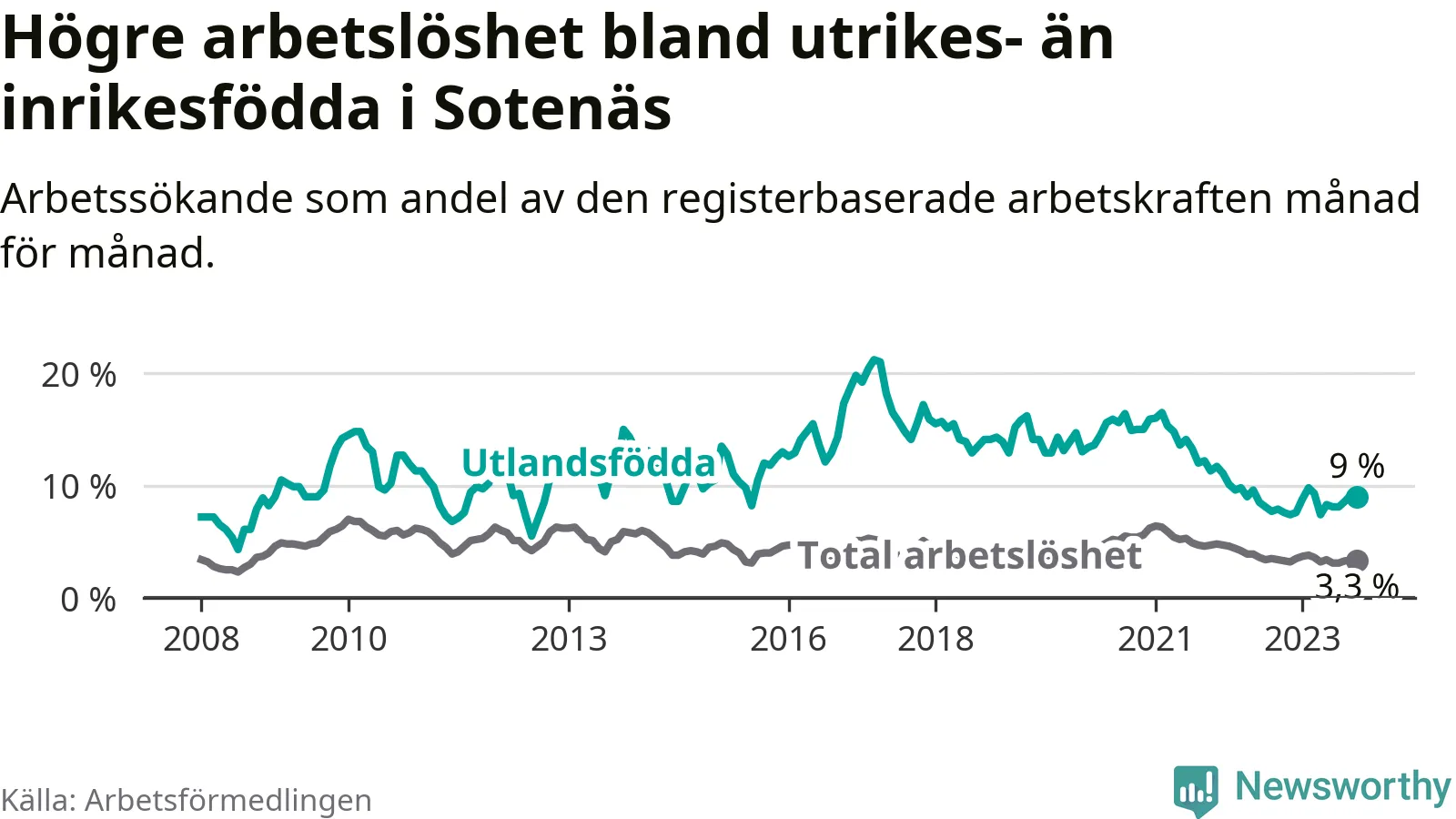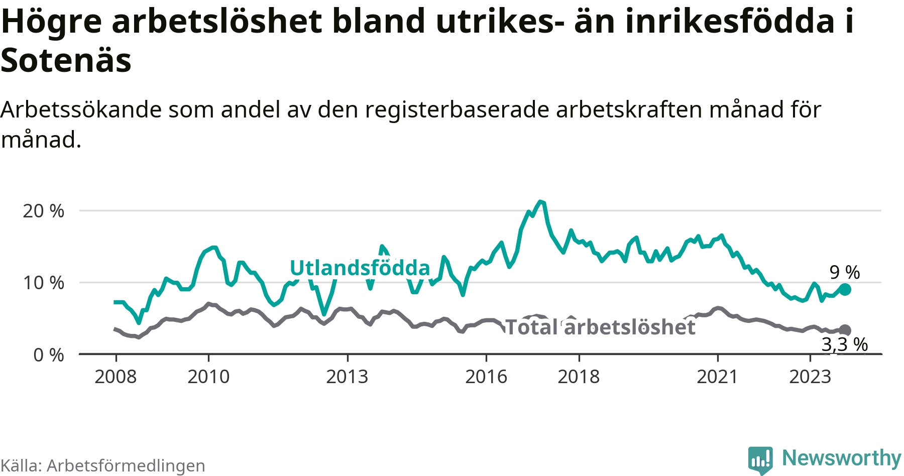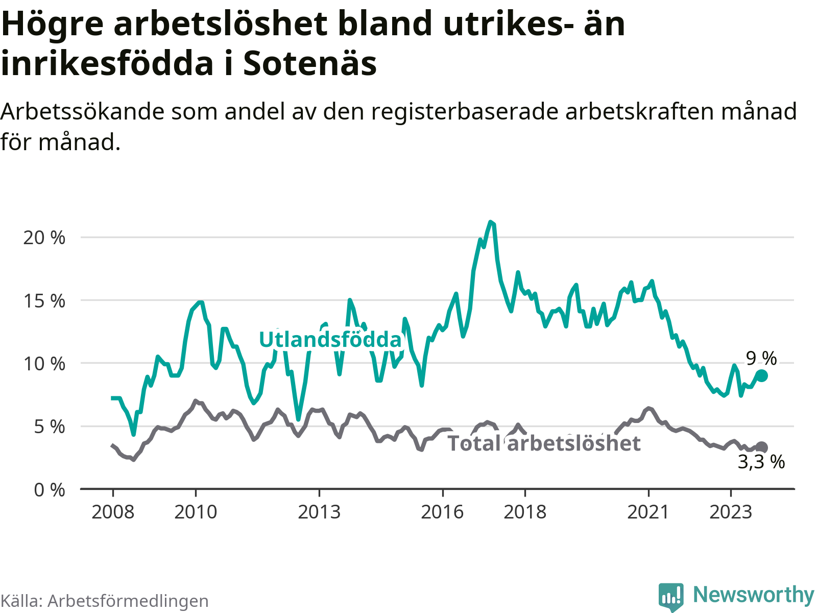 Läs mer om arbetslösheten bland utlandsfödda längre ner i den här texten.