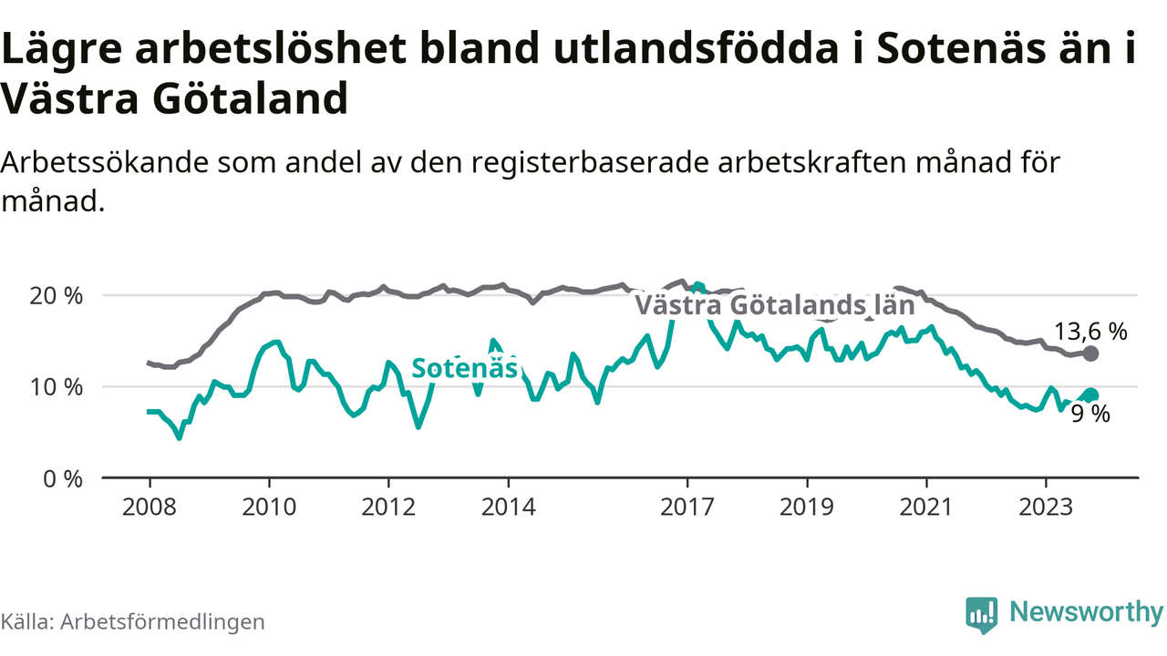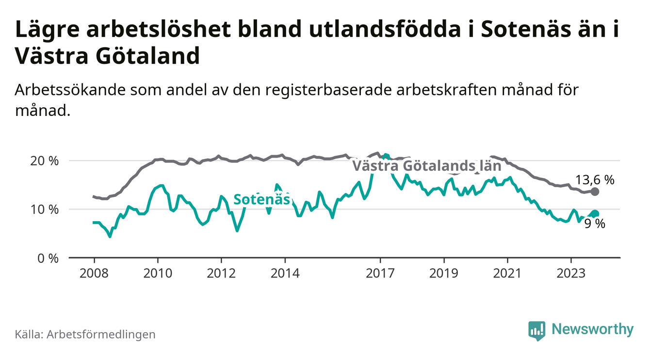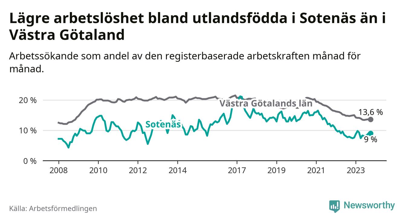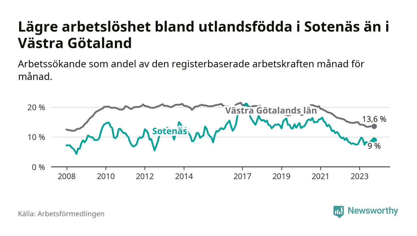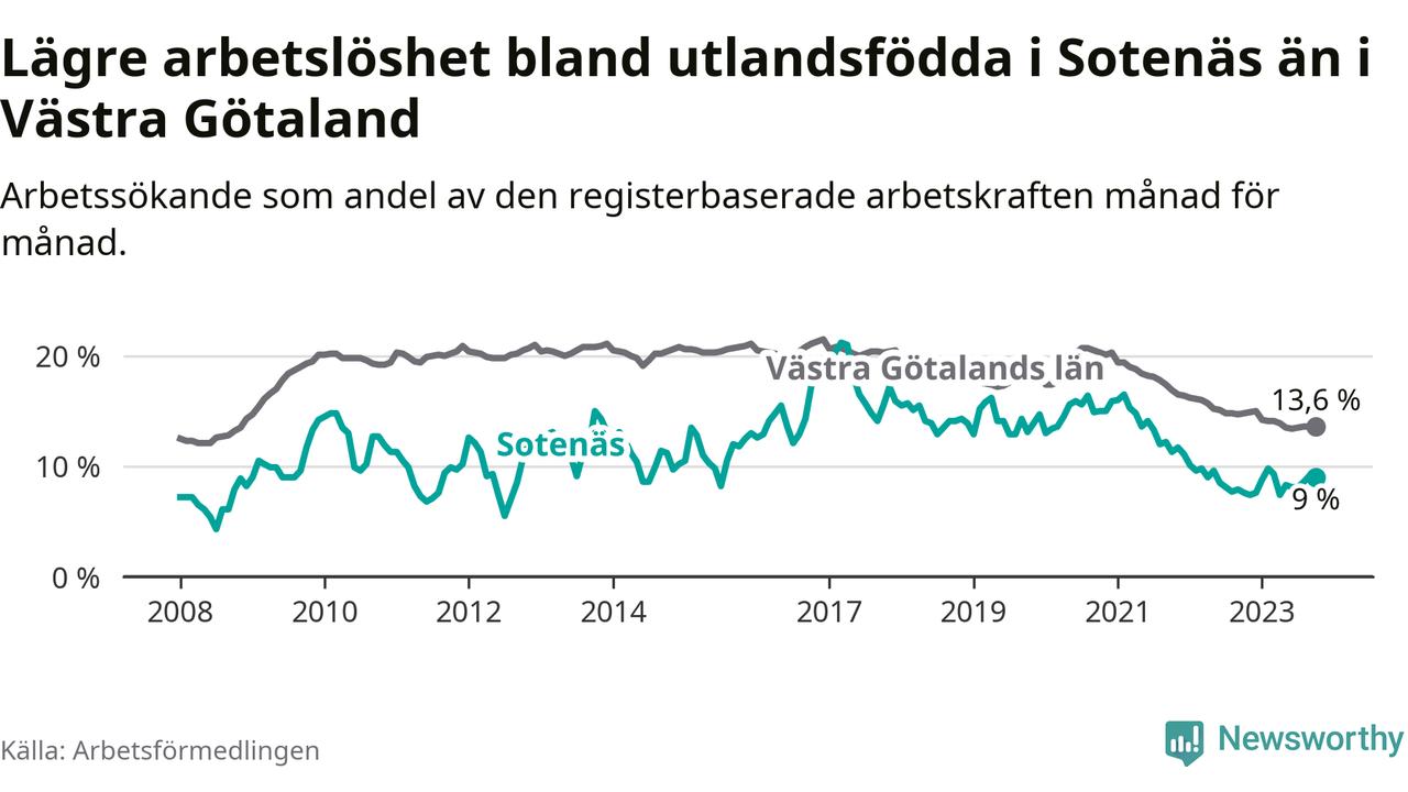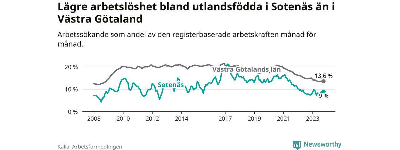 Medan arbetslösheten bland utlandsfödda alltså ökar i Sotenäs så minskar den i Västra Götaland. Jämfört med oktober förra året har andelen arbetslösa utlandsfödda i länet minskat med 1,2 procentenheter (till 13,6 procent). Trots den senaste uppgången har Sotenäs med andra ord fortfarande lägre arbetslöshet bland utlandsfödda än Västra Götaland.