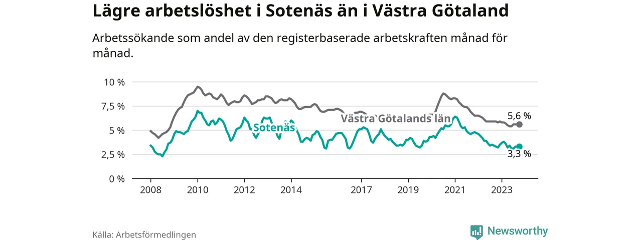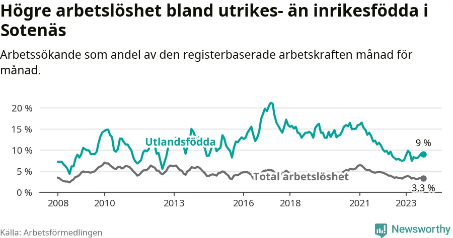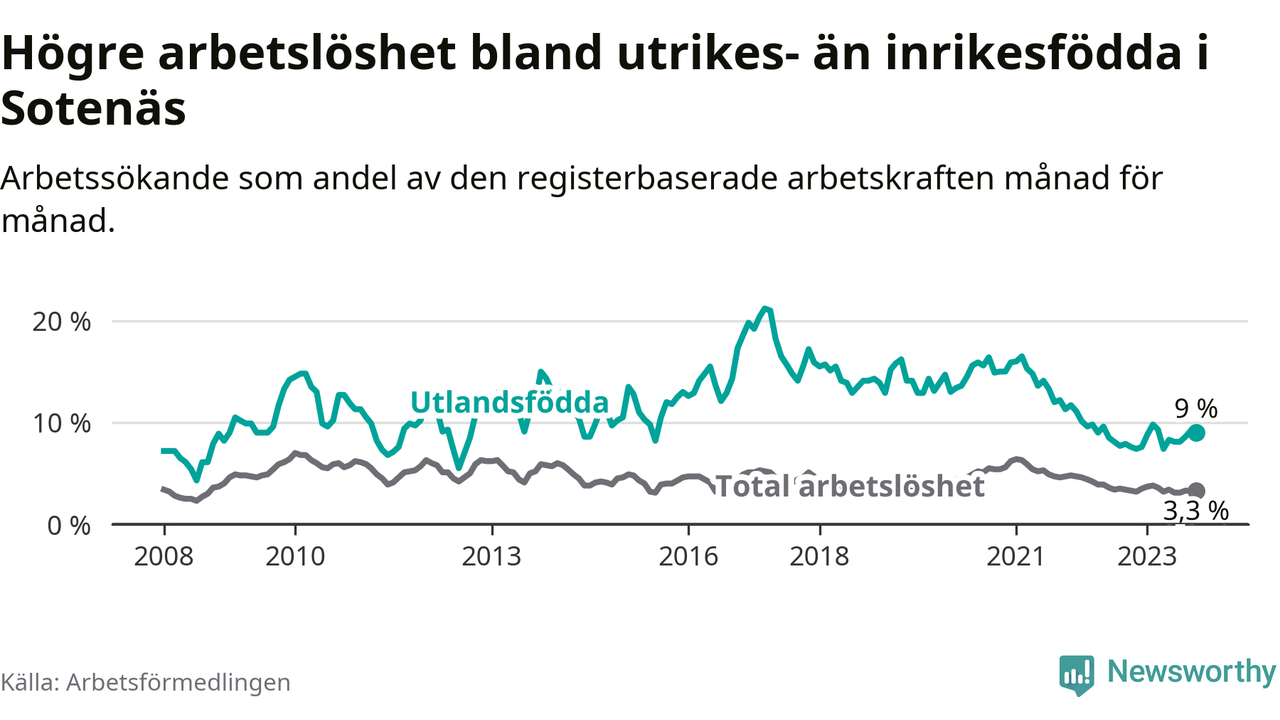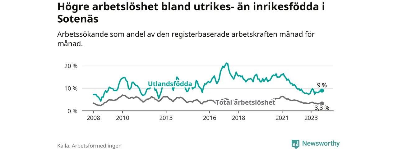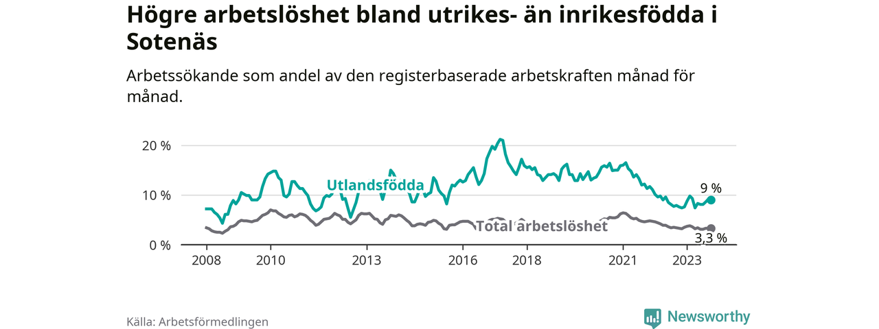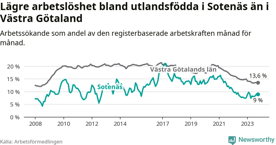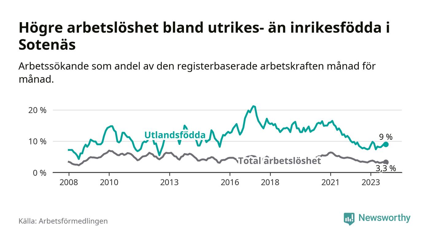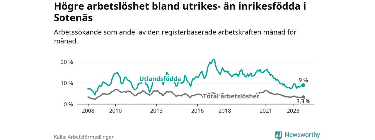 Medan arbetslösheten bland utlandsfödda alltså ökar i Sotenäs så minskar den i Västra Götaland. Jämfört med oktober förra året har andelen arbetslösa utlandsfödda i länet minskat med 1,2 procentenheter (till 13,6 procent). Trots den senaste uppgången har Sotenäs med andra ord fortfarande lägre arbetslöshet bland utlandsfödda än Västra Götaland.
