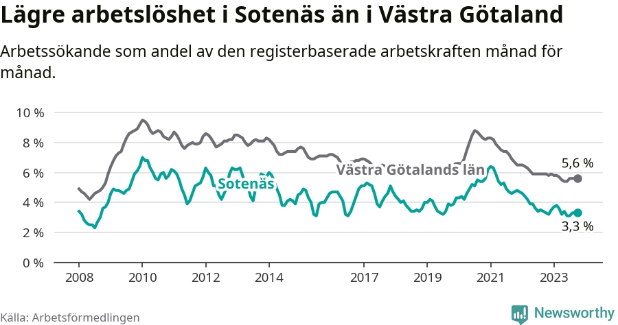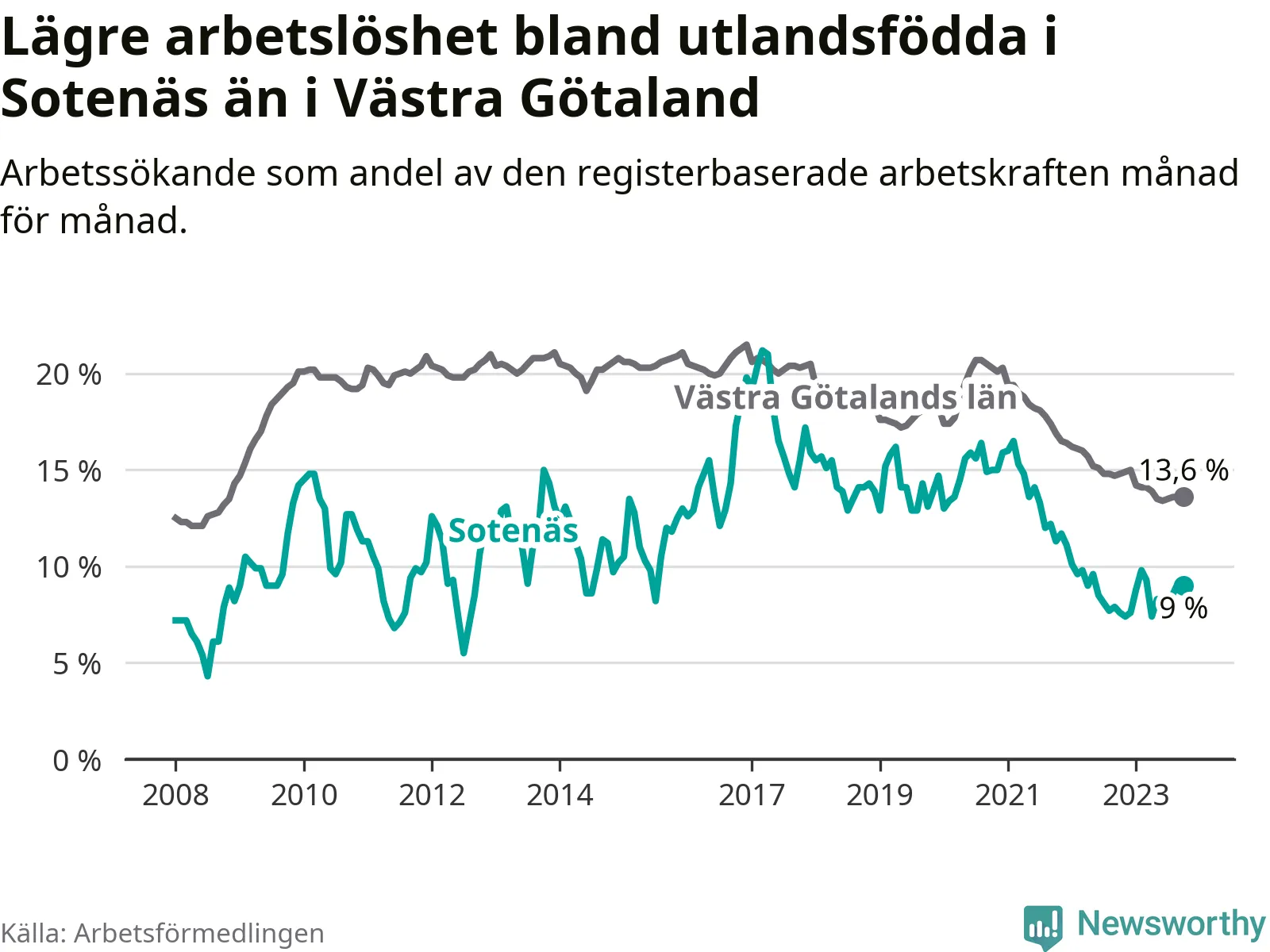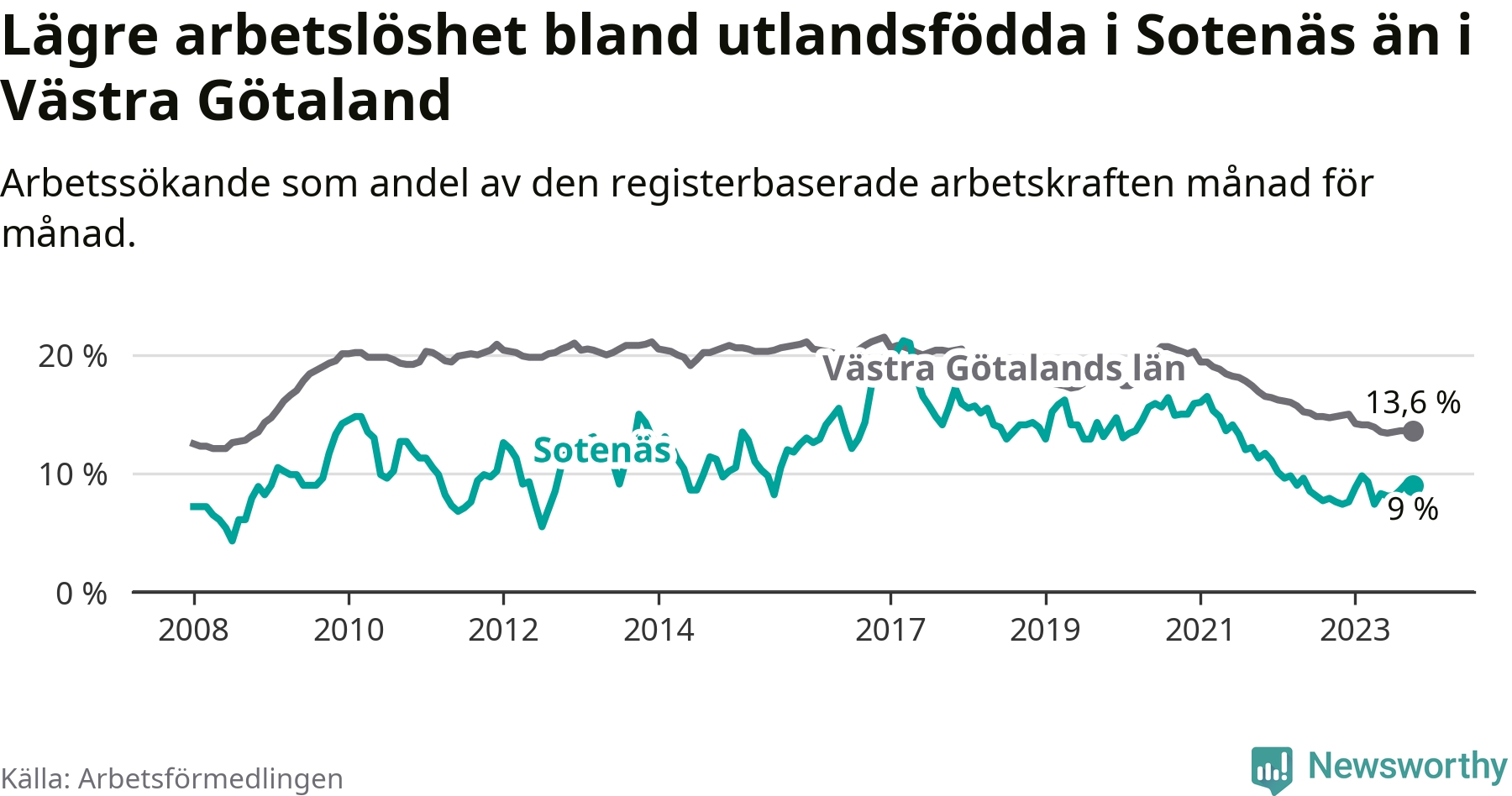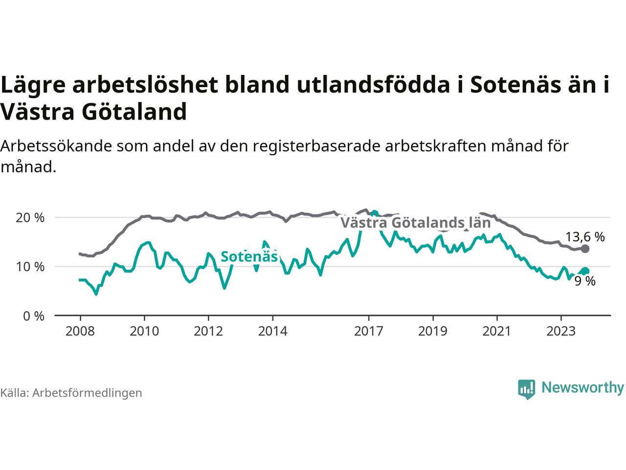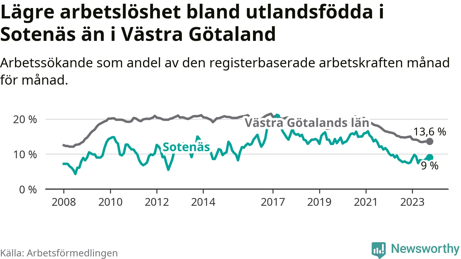 Medan arbetslösheten bland utlandsfödda alltså ökar i Sotenäs så minskar den i Västra Götaland. Jämfört med oktober förra året har andelen arbetslösa utlandsfödda i länet minskat med 1,2 procentenheter (till 13,6 procent). Trots den senaste uppgången har Sotenäs med andra ord fortfarande lägre arbetslöshet bland utlandsfödda än Västra Götaland.