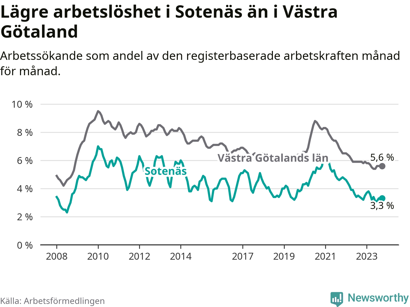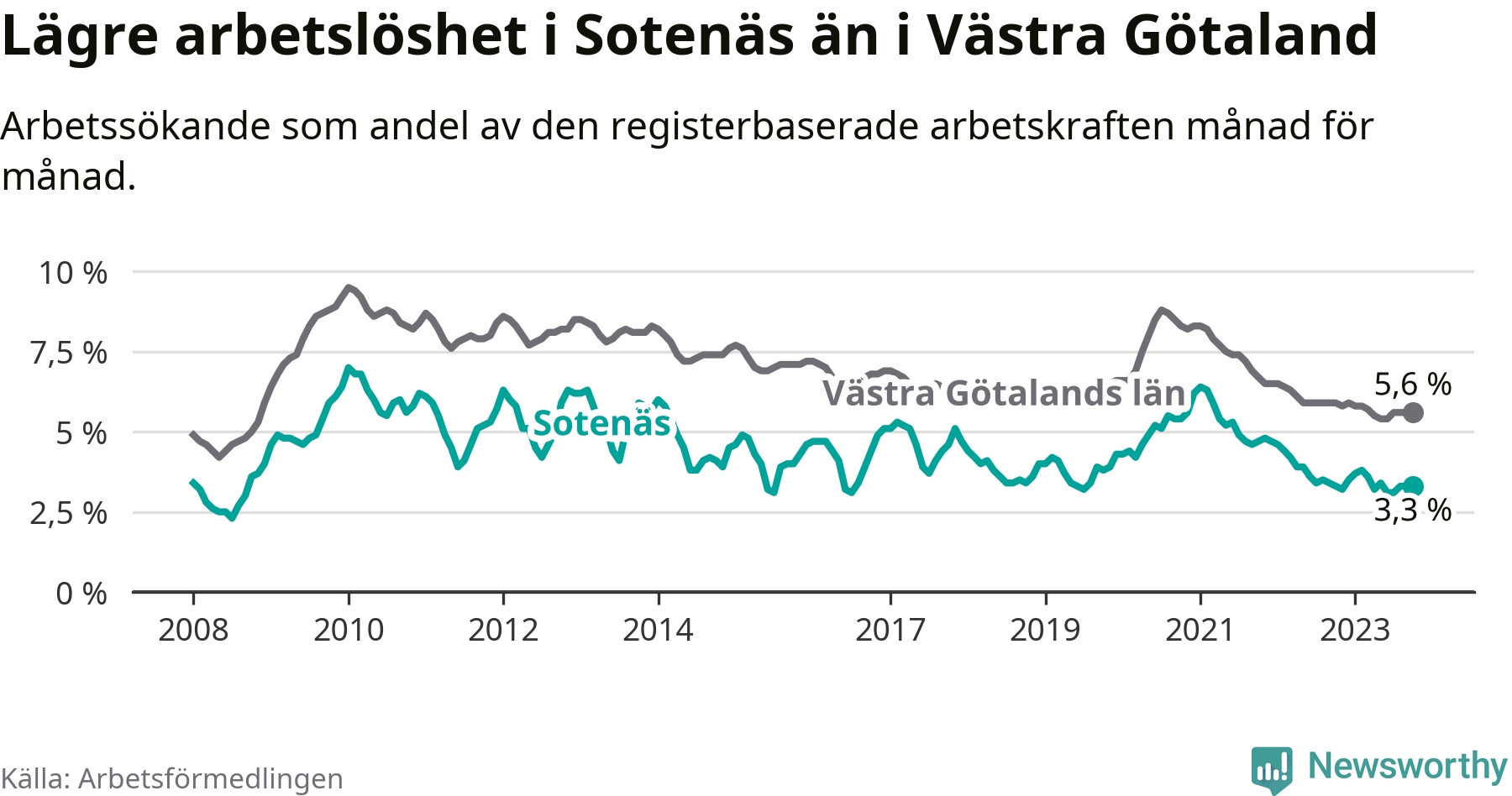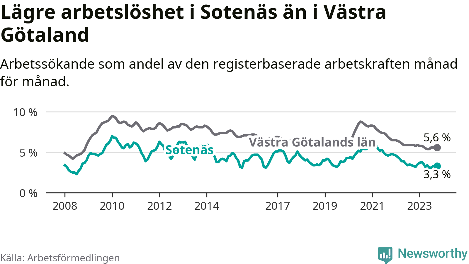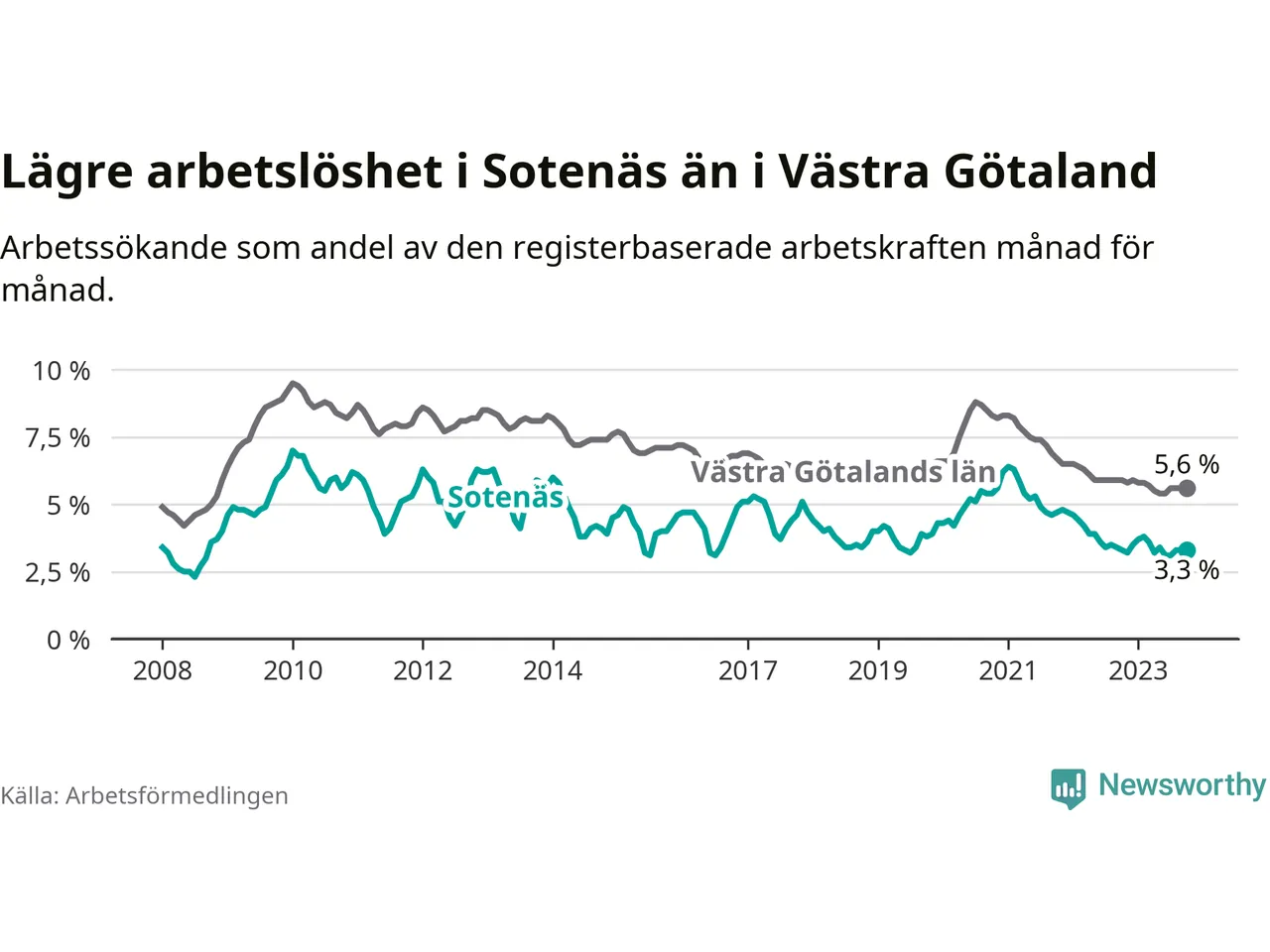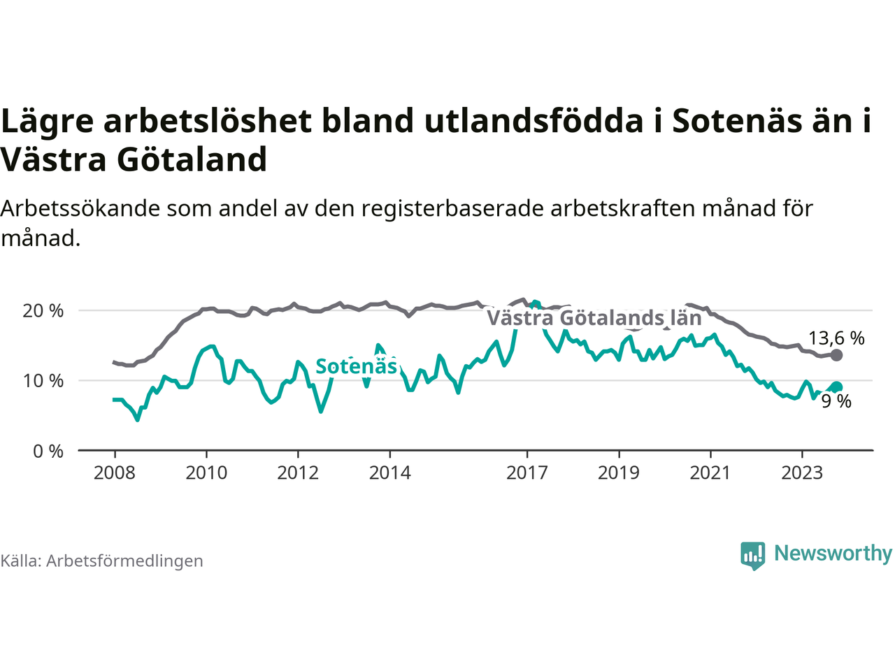 Medan arbetslösheten bland utlandsfödda alltså ökar i Sotenäs så minskar den i Västra Götaland. Jämfört med oktober förra året har andelen arbetslösa utlandsfödda i länet minskat med 1,2 procentenheter (till 13,6 procent). Trots den senaste uppgången har Sotenäs med andra ord fortfarande lägre arbetslöshet bland utlandsfödda än Västra Götaland.