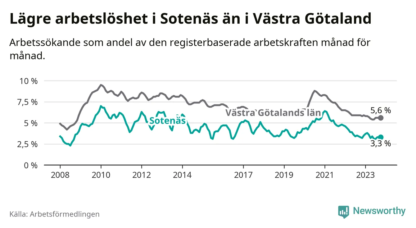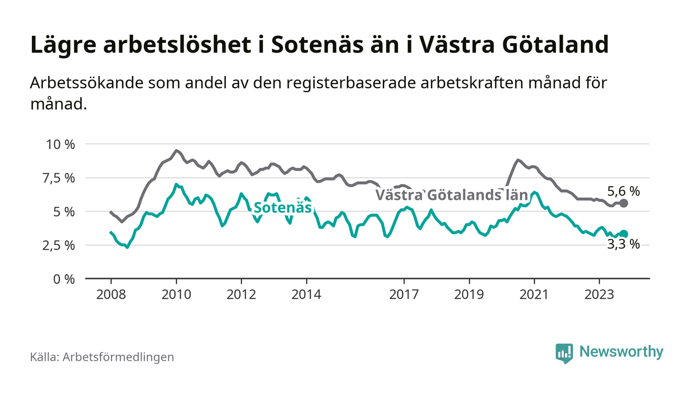 Arbetslösheten i Sotenäs ligger under nivån i hela Västra Götalands län (3,3 procent i kommunen, jämfört med 5,6 procent i hela länet). Öckerö har den lägsta arbetslösheten i länet (2,4 procent), medan Trollhättan har den högsta (8,4 procent). För att Sotenäs skulle komma ner i samma arbetslöshetsnivå som Öckerö skulle 36 personer behöva sysselsättas.