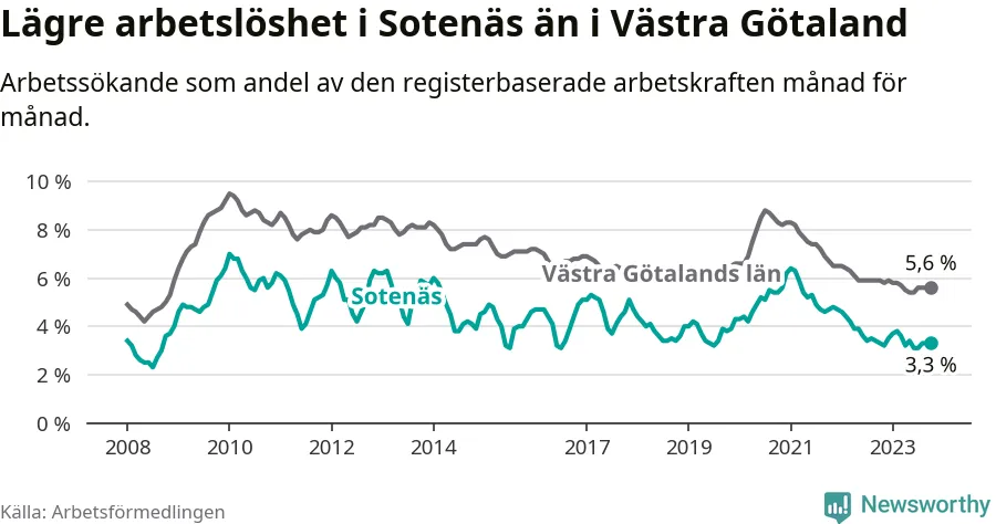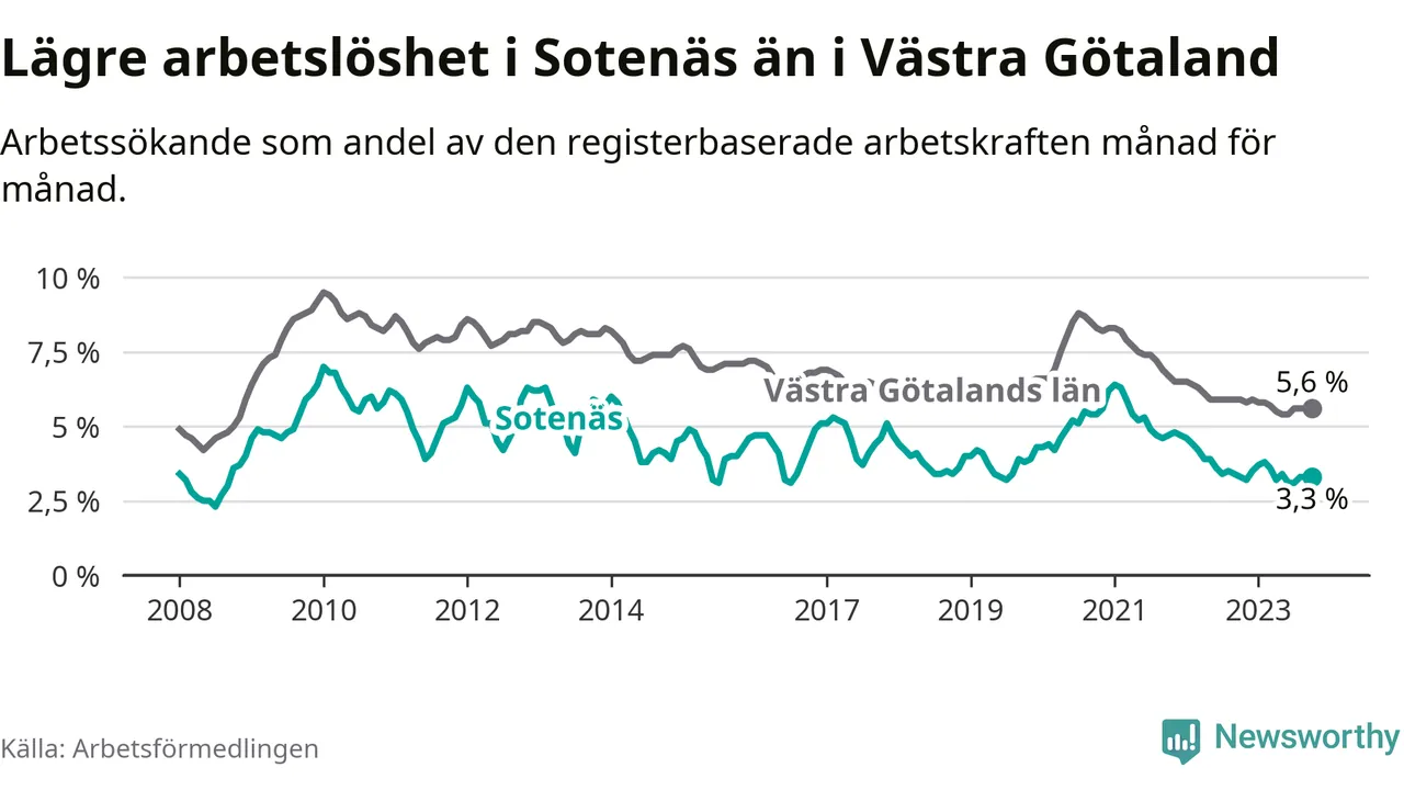 Under oktober månad rapporterade Sotenäs kommun en total arbetslöshet på 3,3 procent. Det är i samma nivå som i oktober i fjol. I Västra Götalands län däremot sjunker arbetslösheten