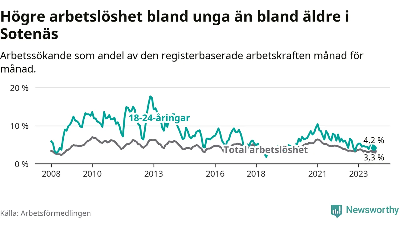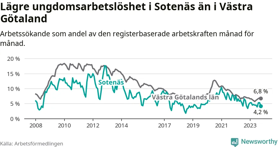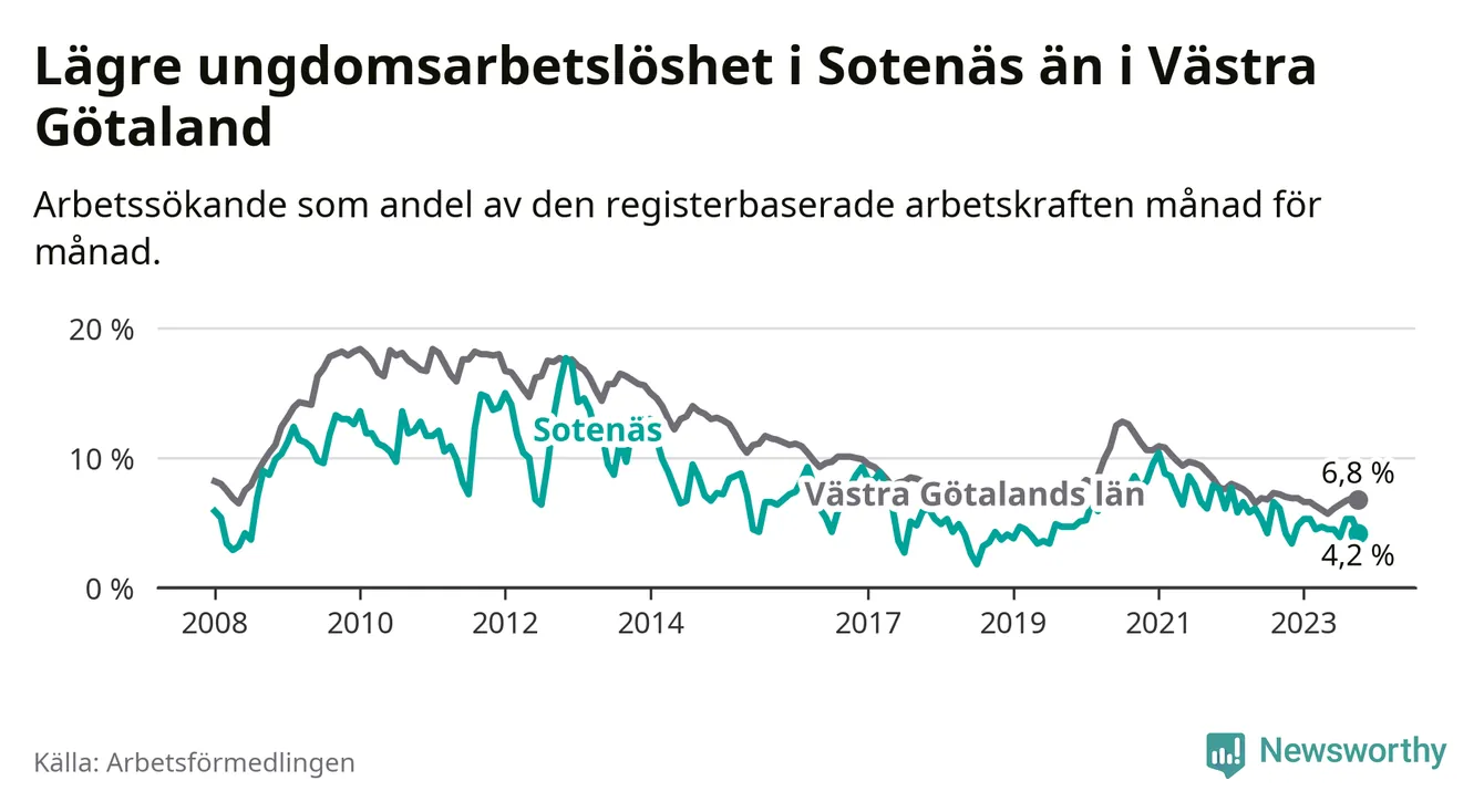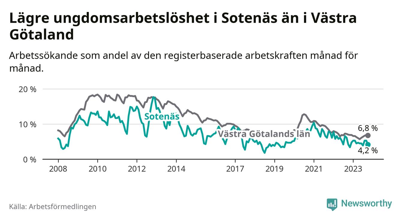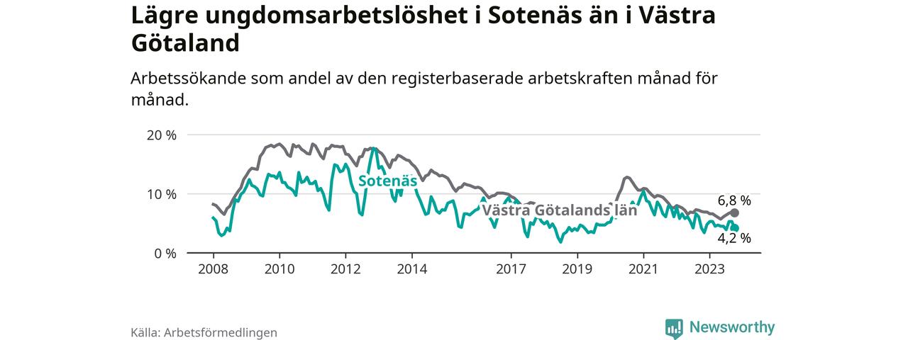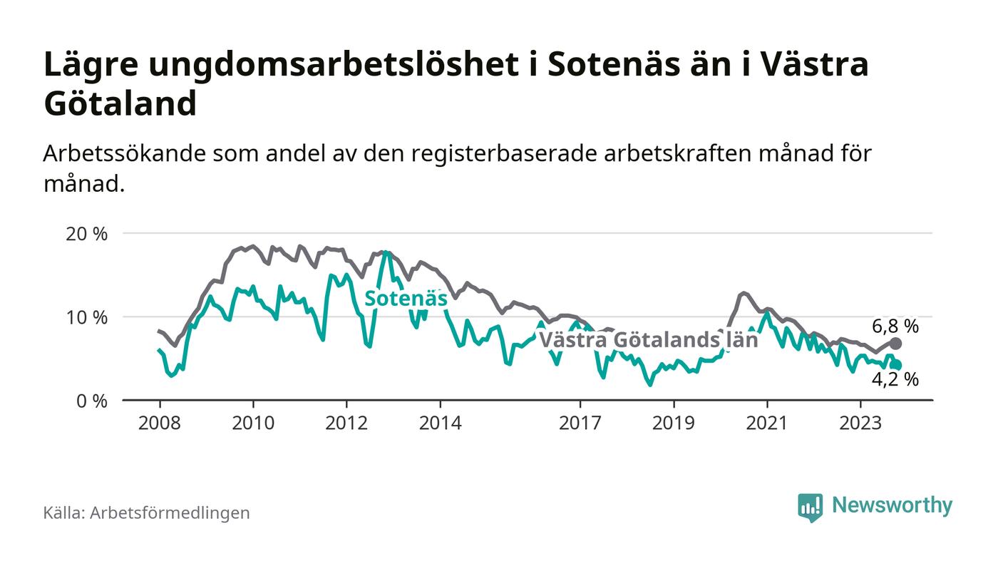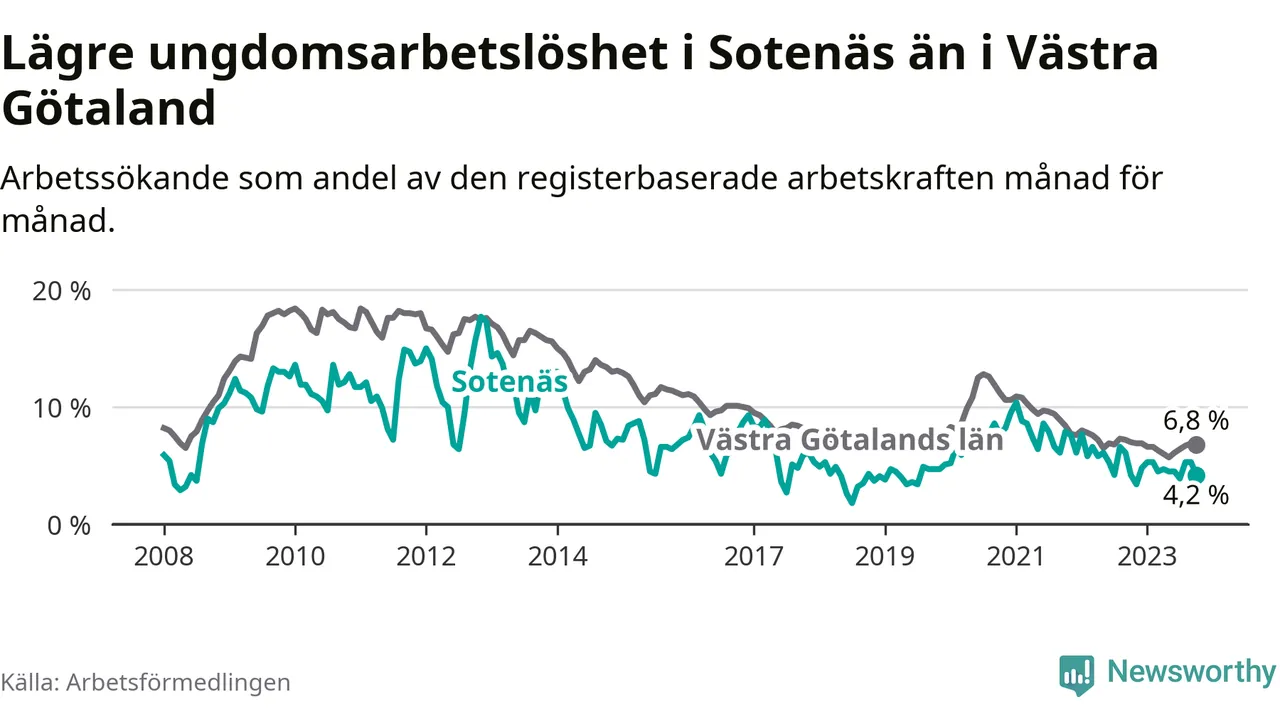 Precis som den totala arbetslösheten ligger ungdomsarbetslösheten i Sotenäs lägre än i Västra Götaland som helhet. Skillnaden mellan kommunen och länet är 2,6 procentenheter.
