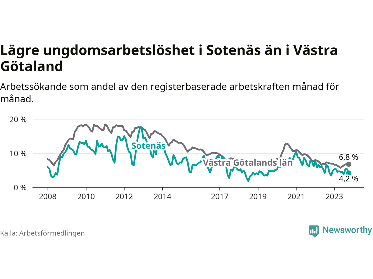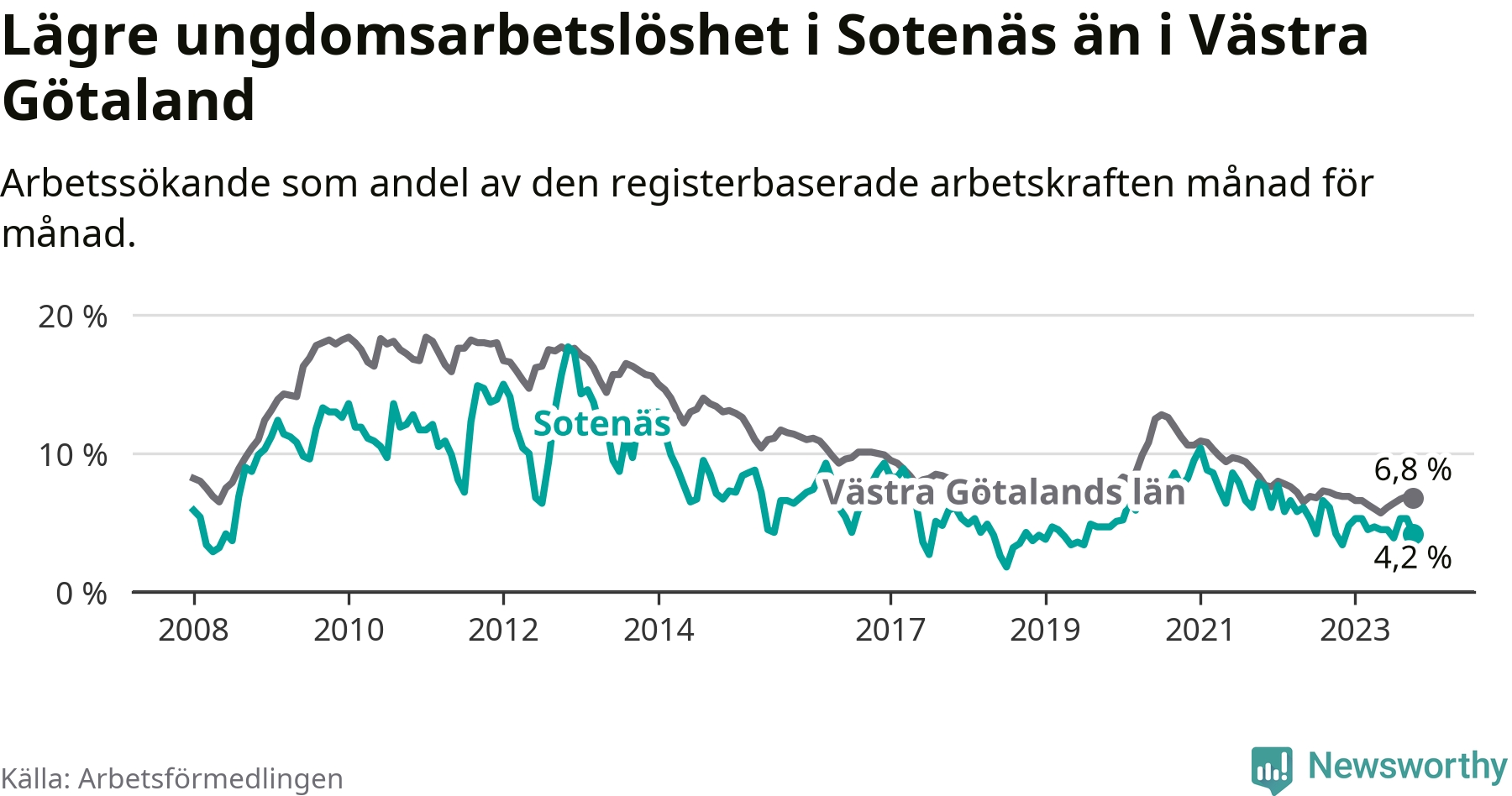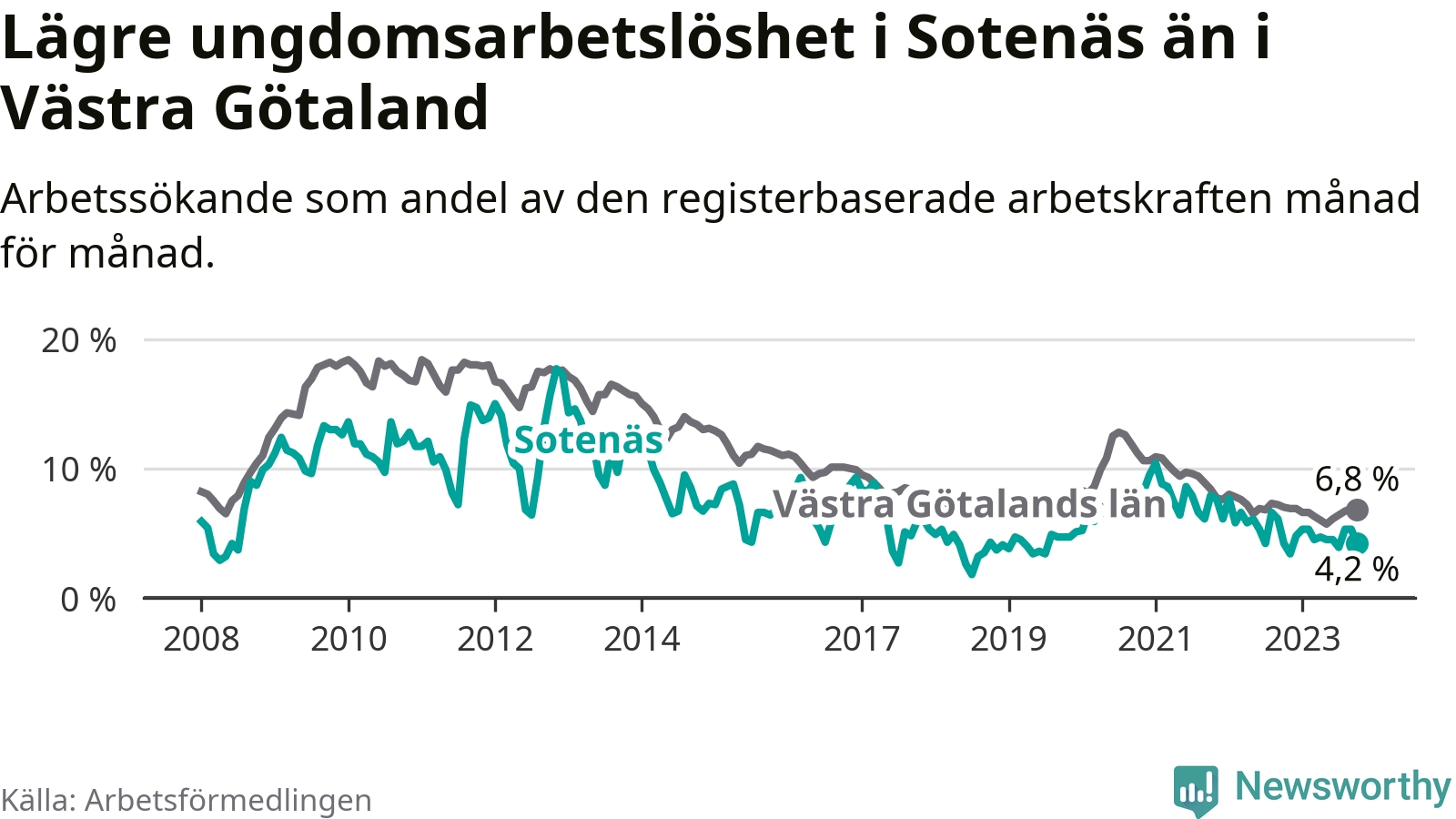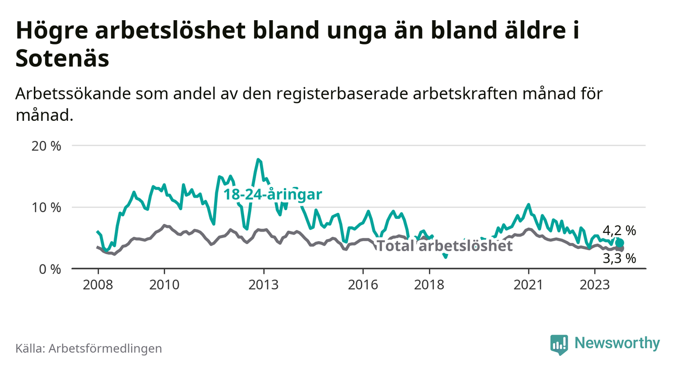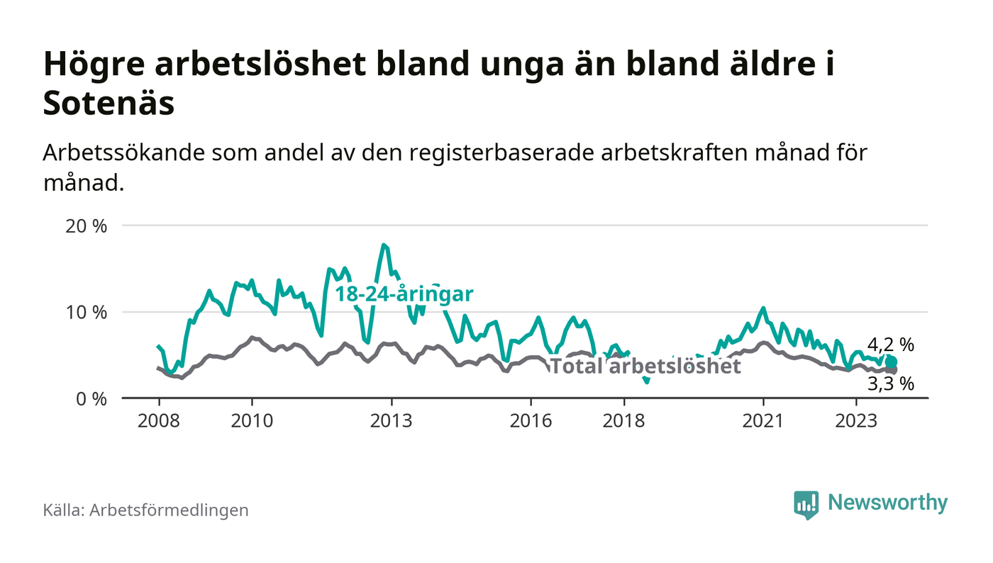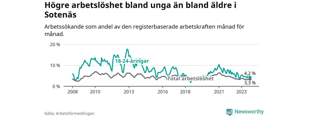 Precis som den totala arbetslösheten ligger ungdomsarbetslösheten i Sotenäs lägre än i Västra Götaland som helhet. Skillnaden mellan kommunen och länet är 2,6 procentenheter.