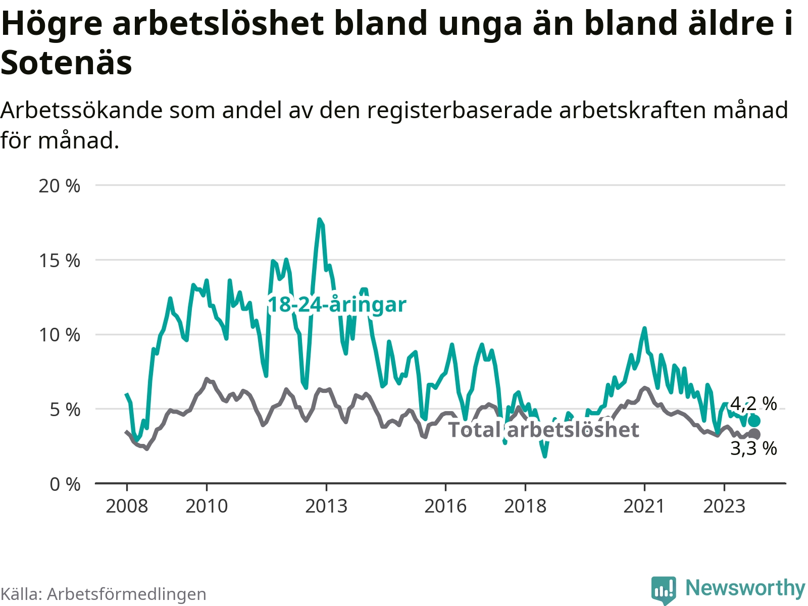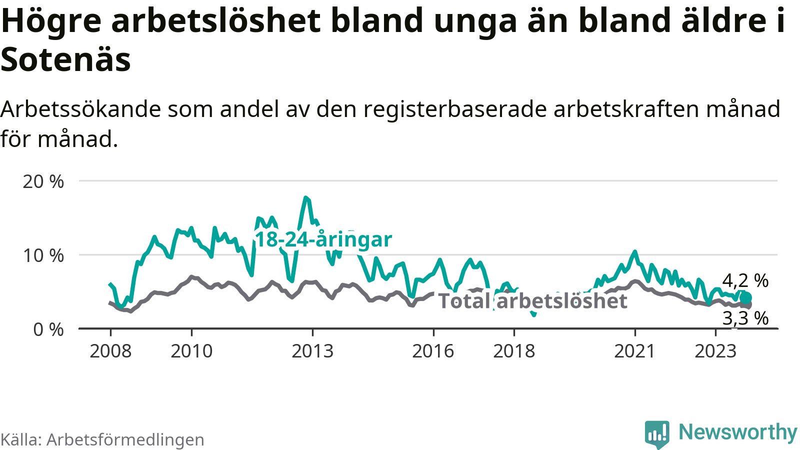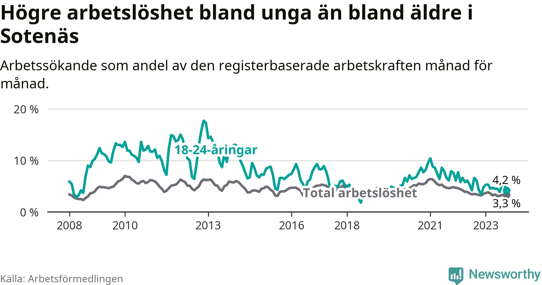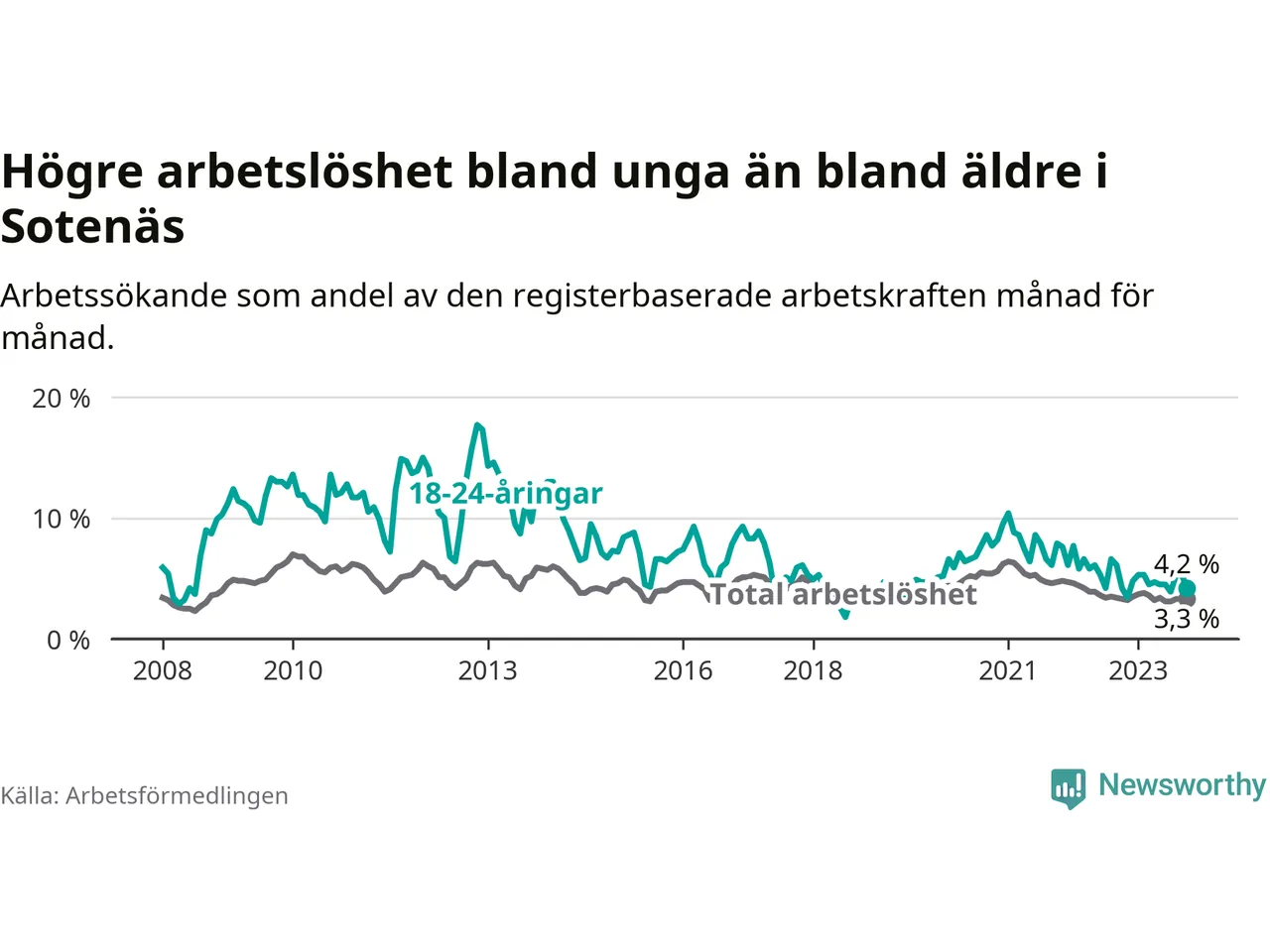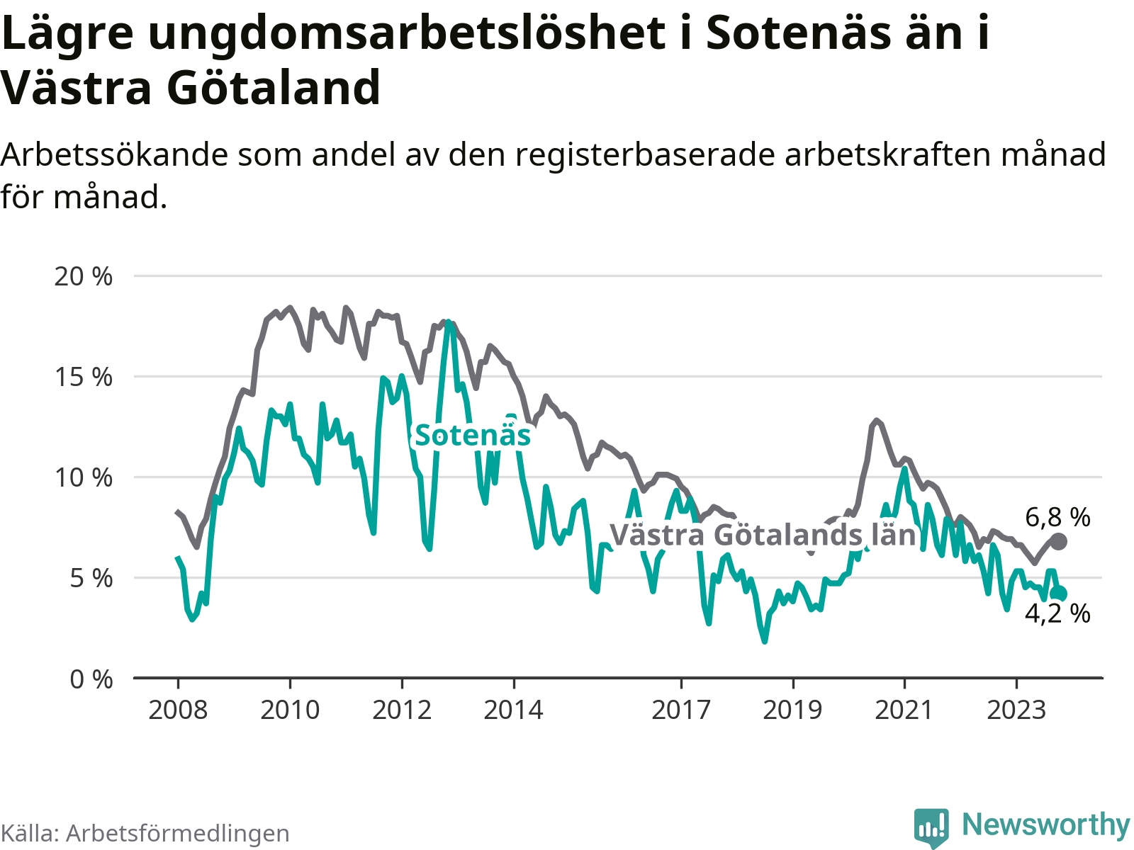 Precis som den totala arbetslösheten ligger ungdomsarbetslösheten i Sotenäs lägre än i Västra Götaland som helhet. Skillnaden mellan kommunen och länet är 2,6 procentenheter.