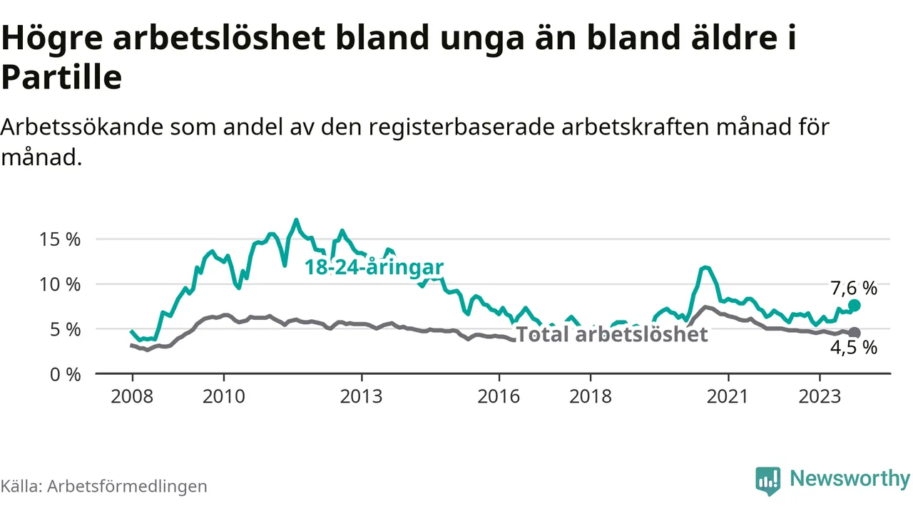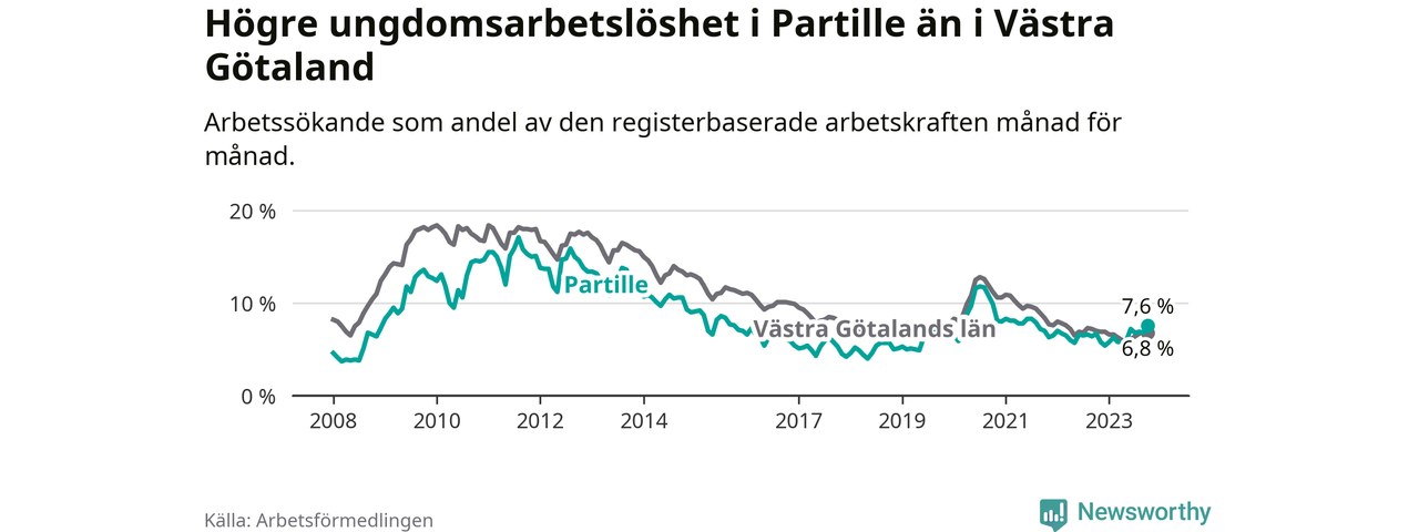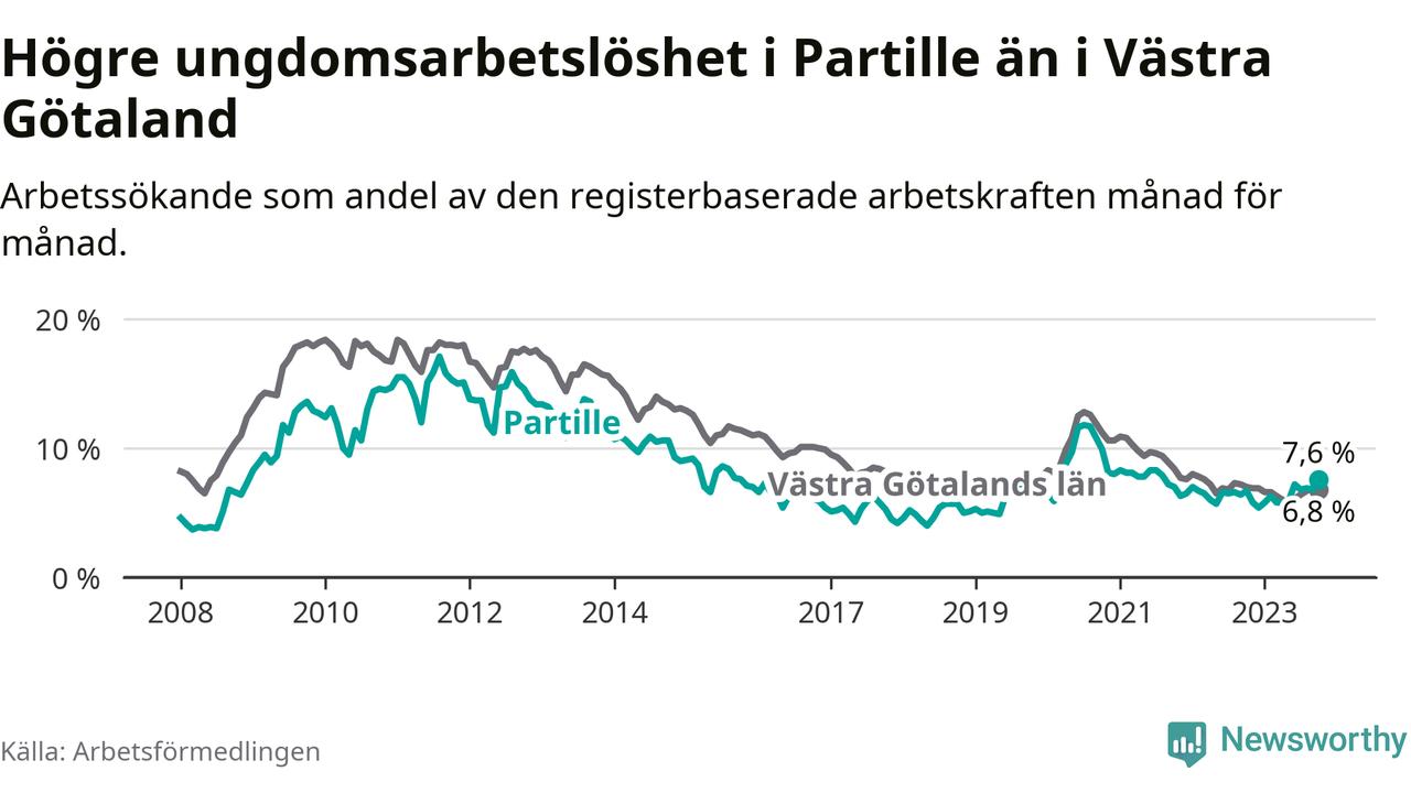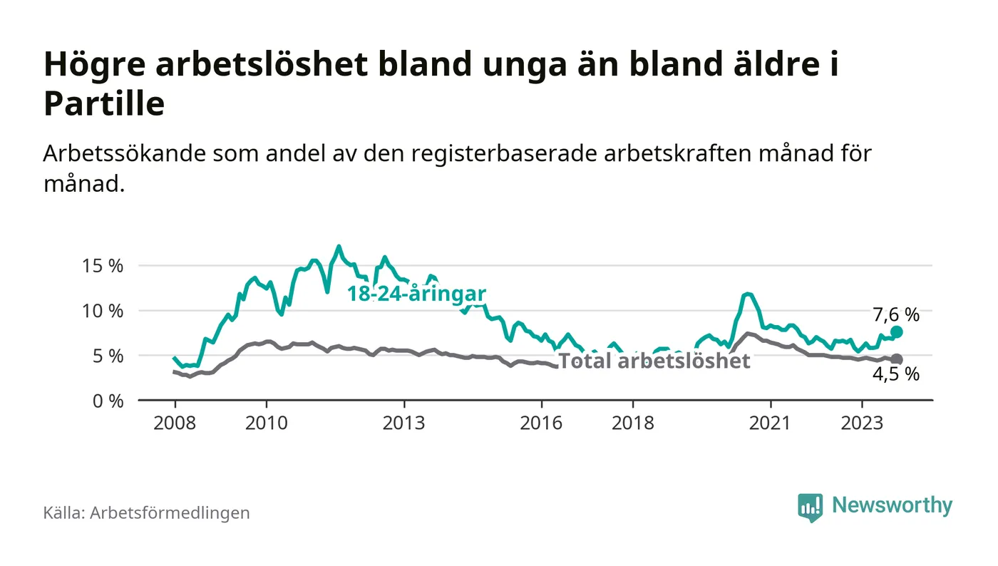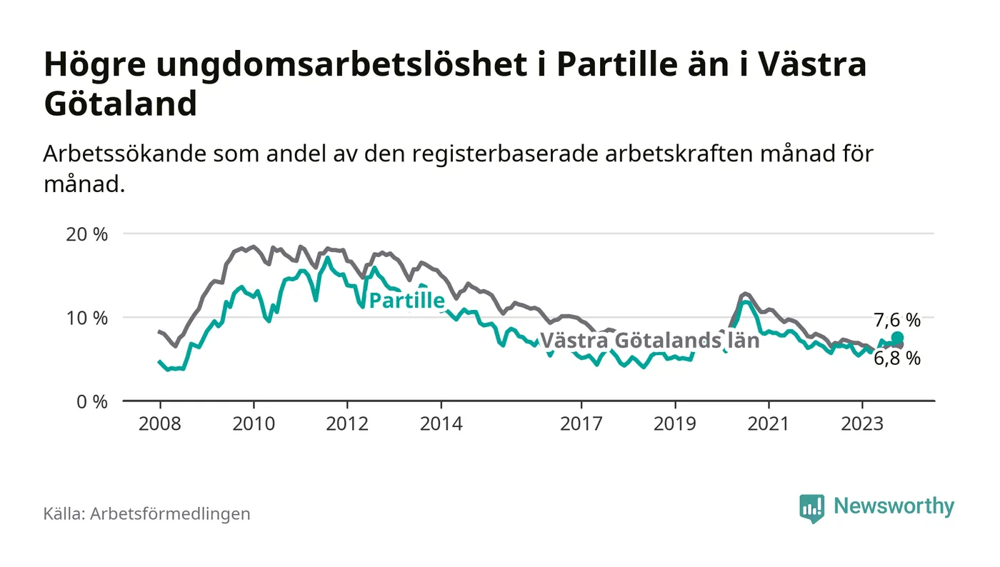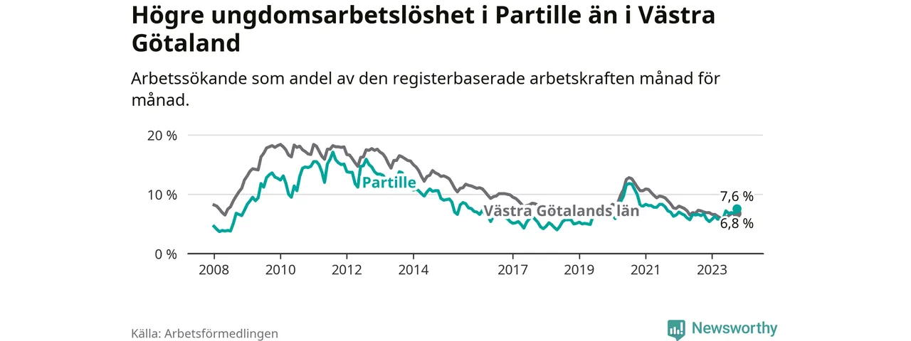 Medan Partille har lägre total arbetslöshet än Västra Götaland, ligger ungdomsarbetslösheten 0,8 procentenheter högre i Partille.