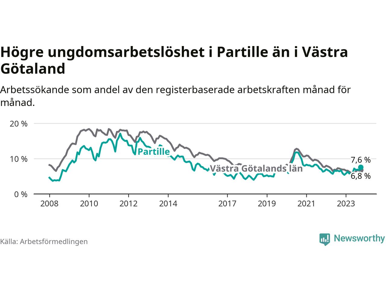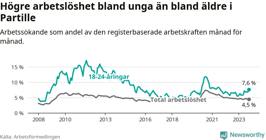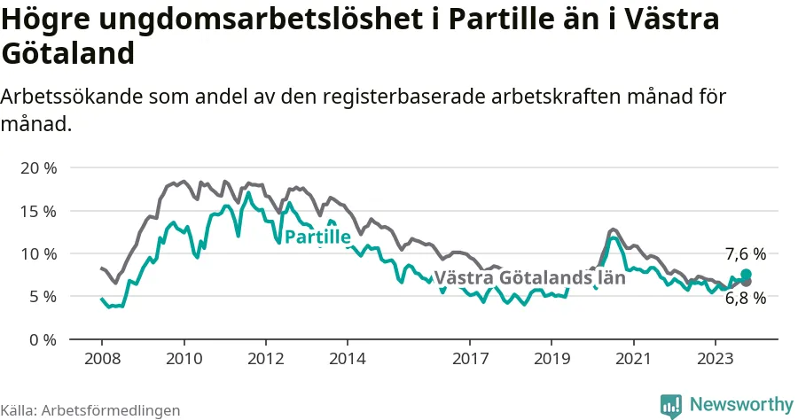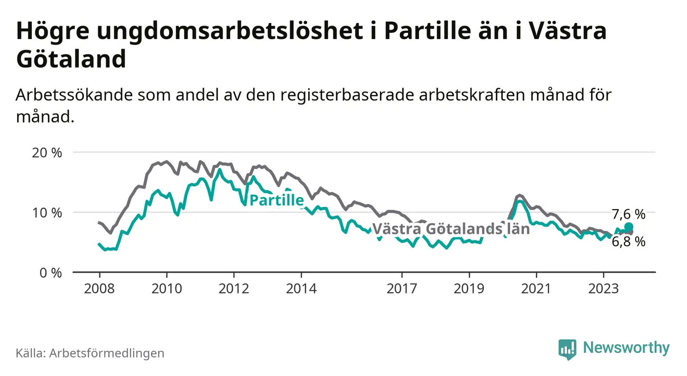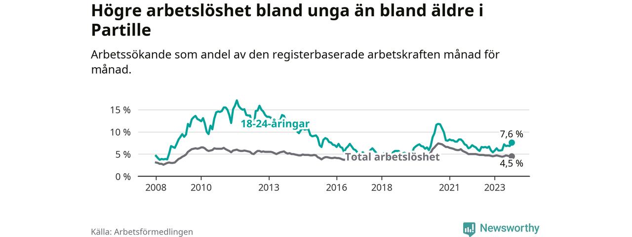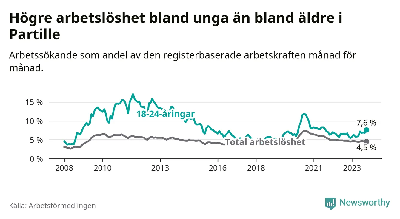 Medan Partille har lägre total arbetslöshet än Västra Götaland, ligger ungdomsarbetslösheten 0,8 procentenheter högre i Partille.