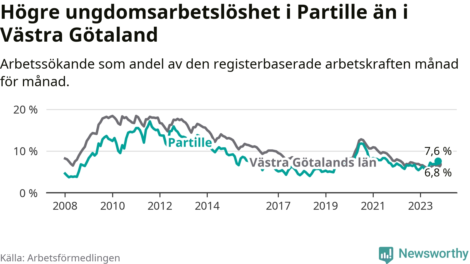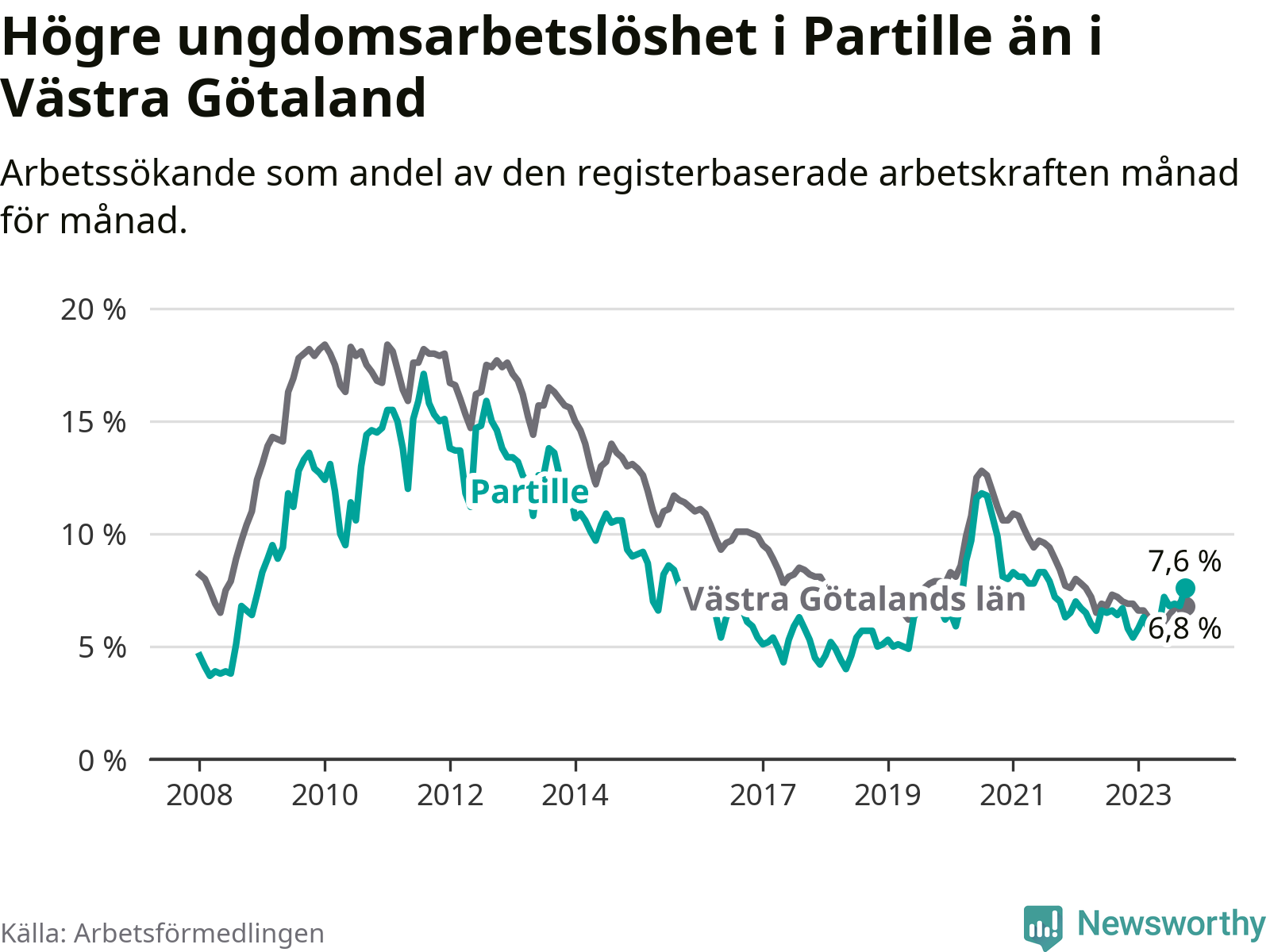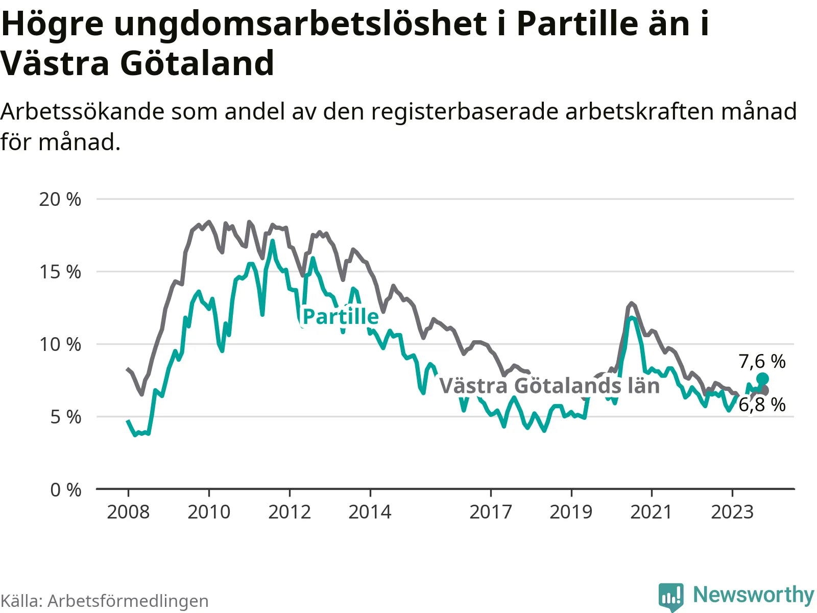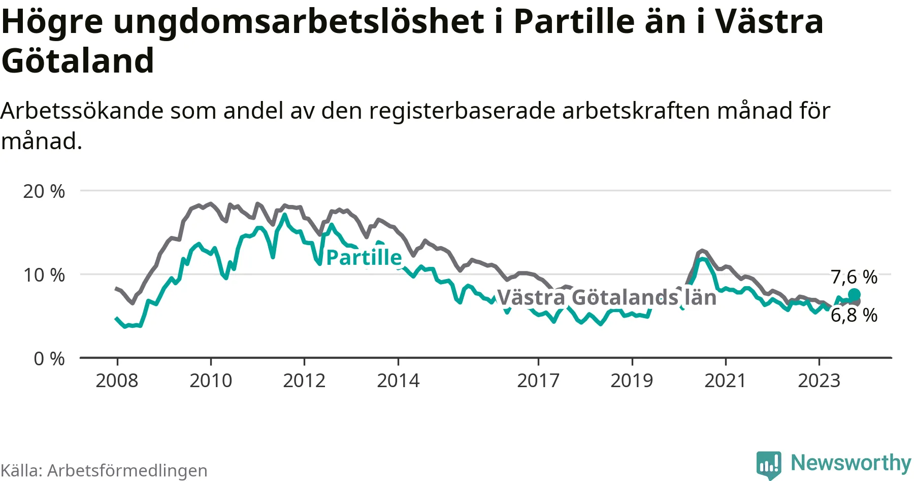 Medan Partille har lägre total arbetslöshet än Västra Götaland, ligger ungdomsarbetslösheten 0,8 procentenheter högre i Partille.