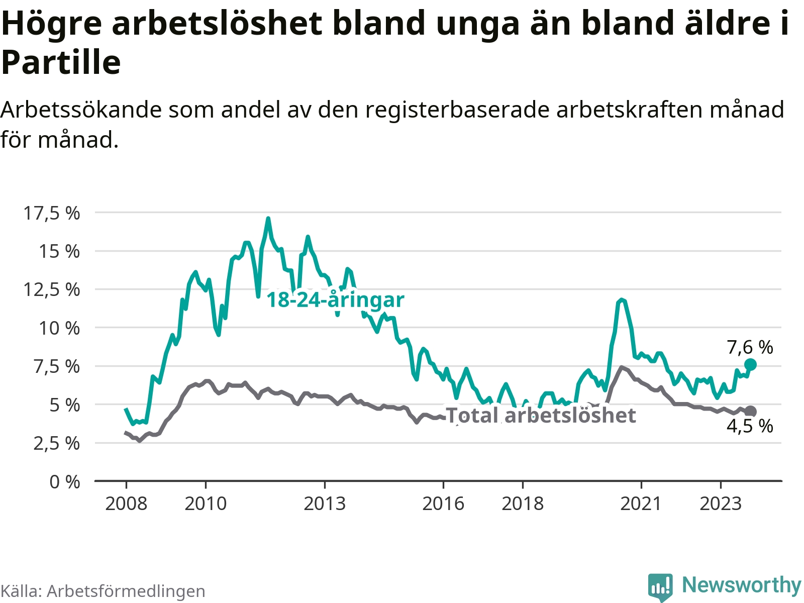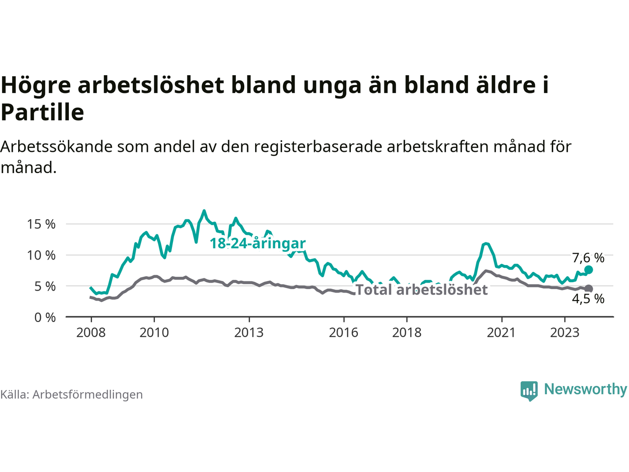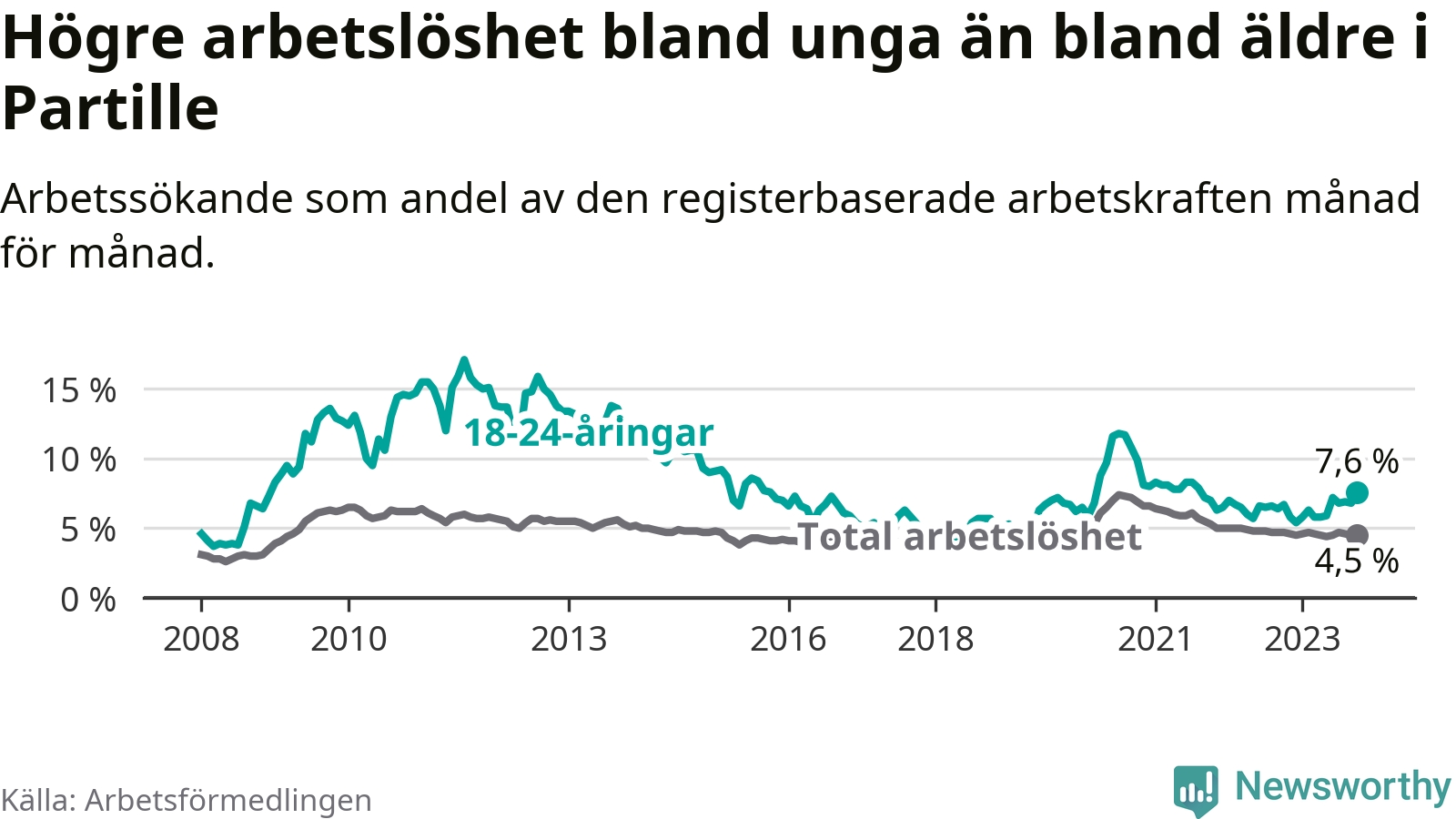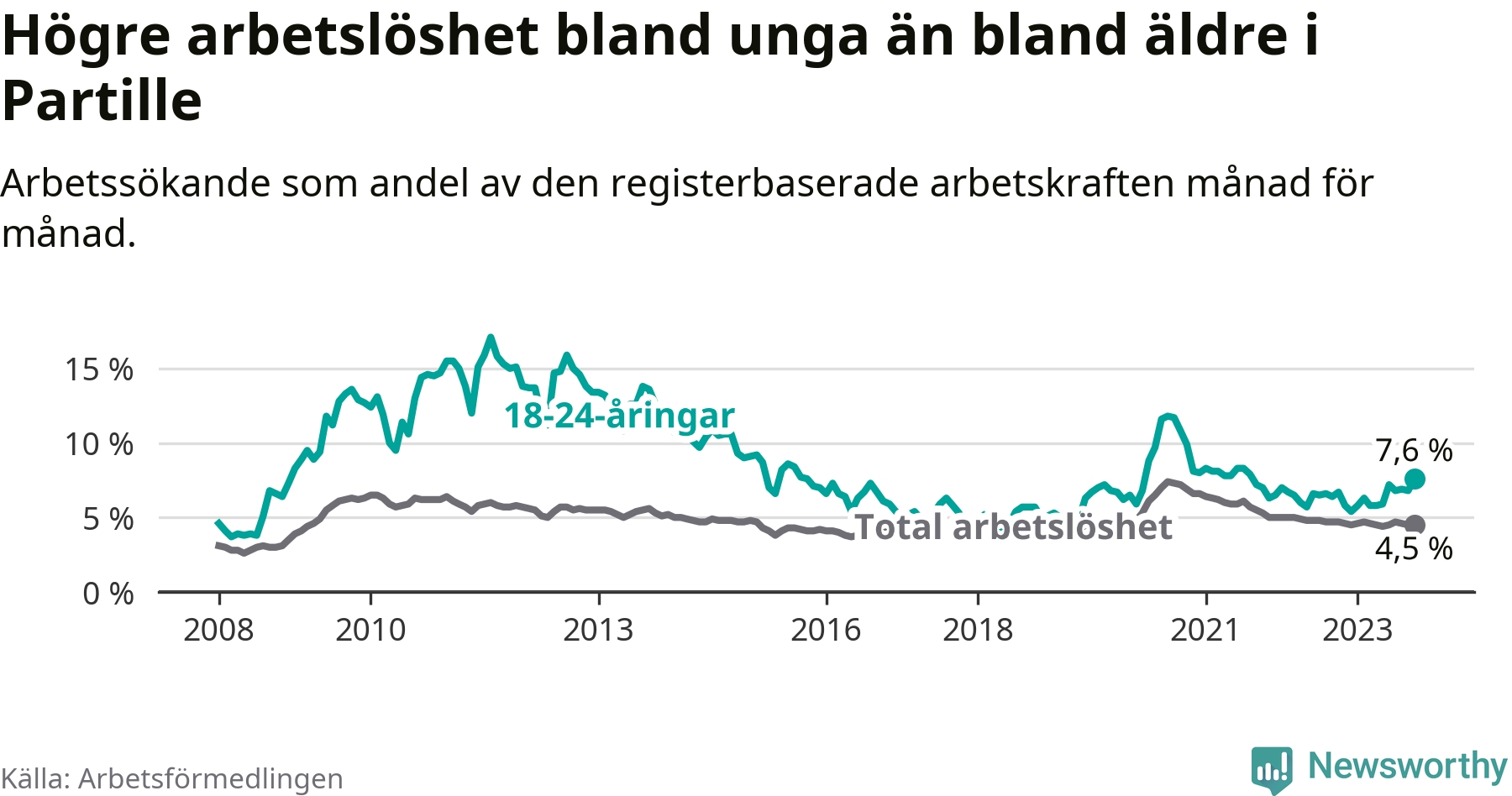 Medan Partille har lägre total arbetslöshet än Västra Götaland, ligger ungdomsarbetslösheten 0,8 procentenheter högre i Partille.