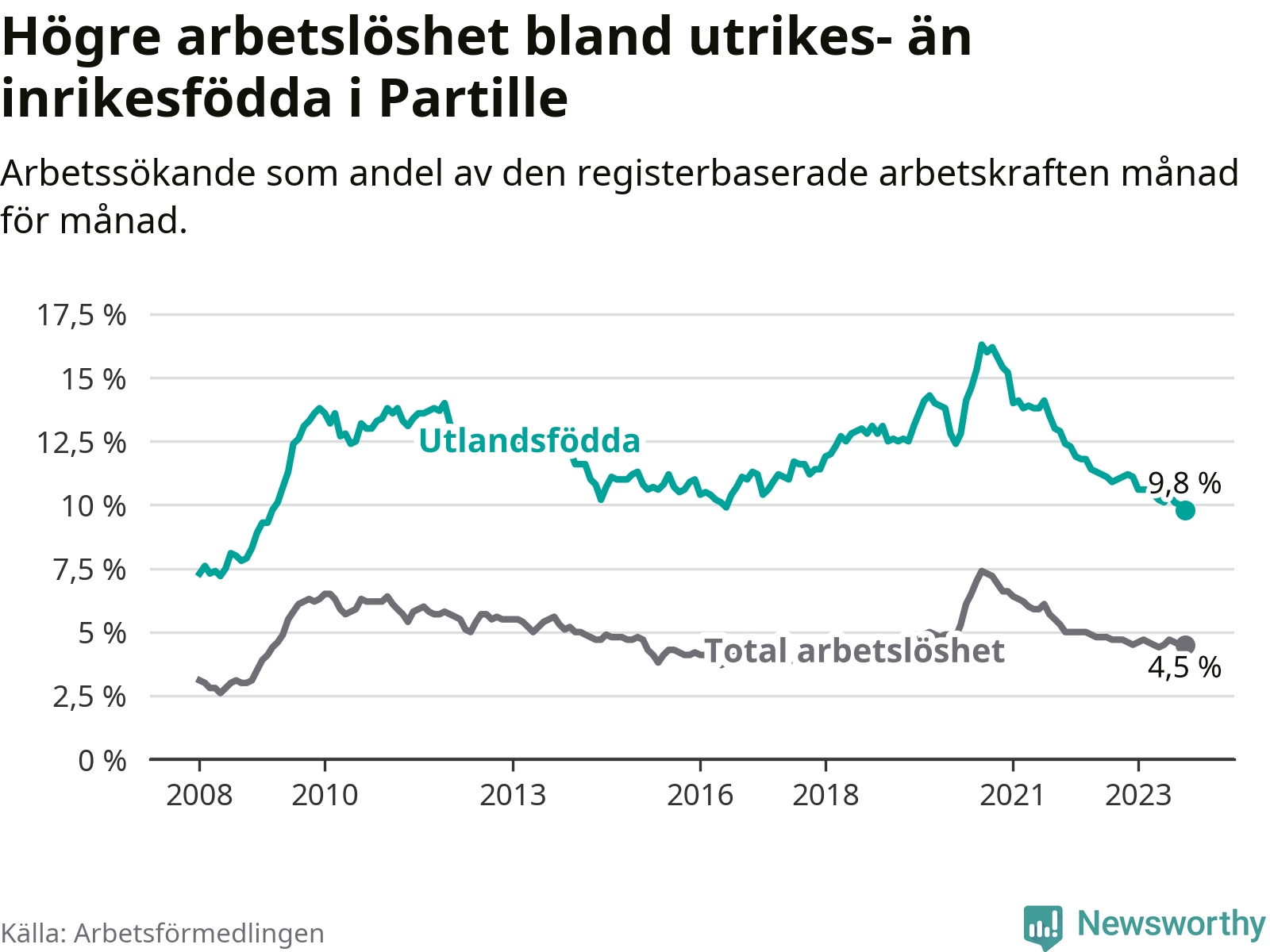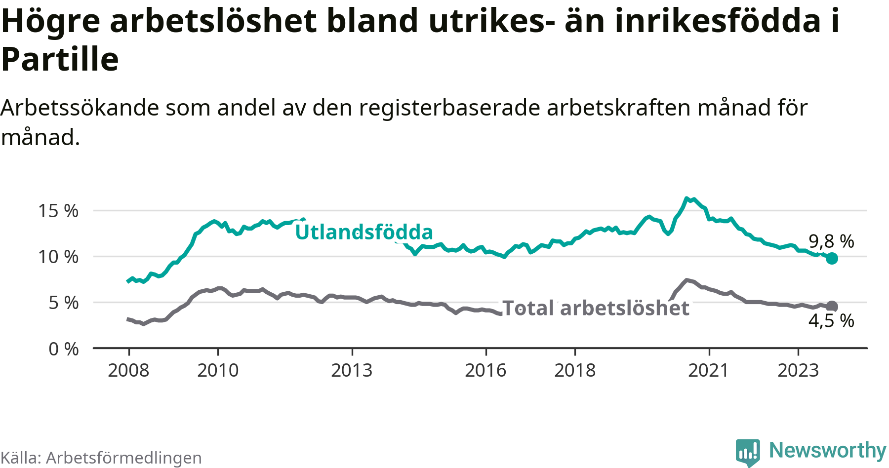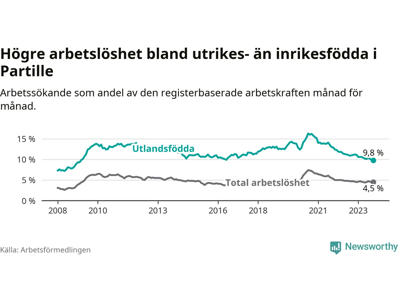 | Bland utlandsfödda | 9,8 % | −1,3 % ▼ | 13,6 % | −1,2 % ▼ | 15,2 % | −1,1 % ▼ |