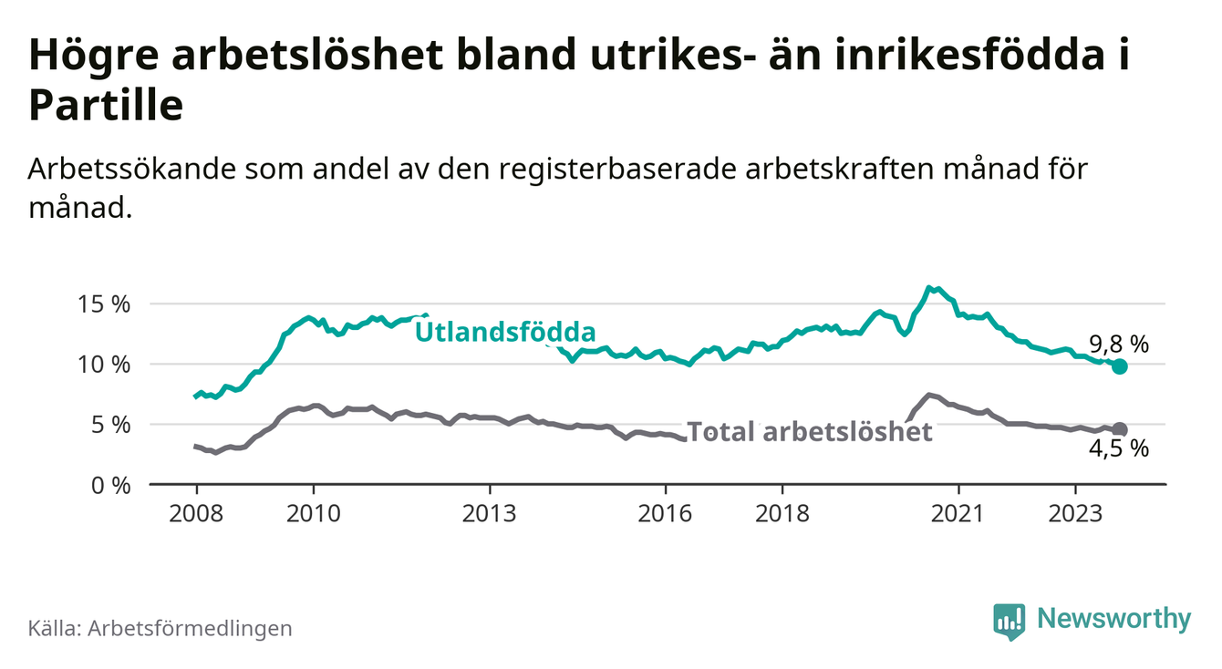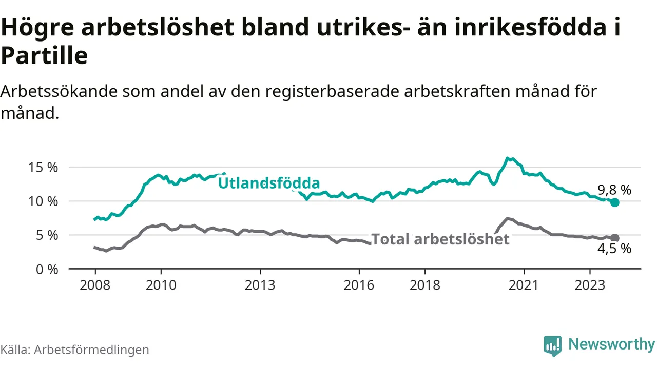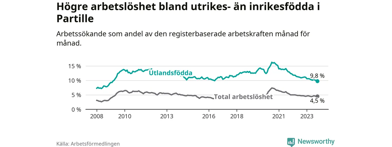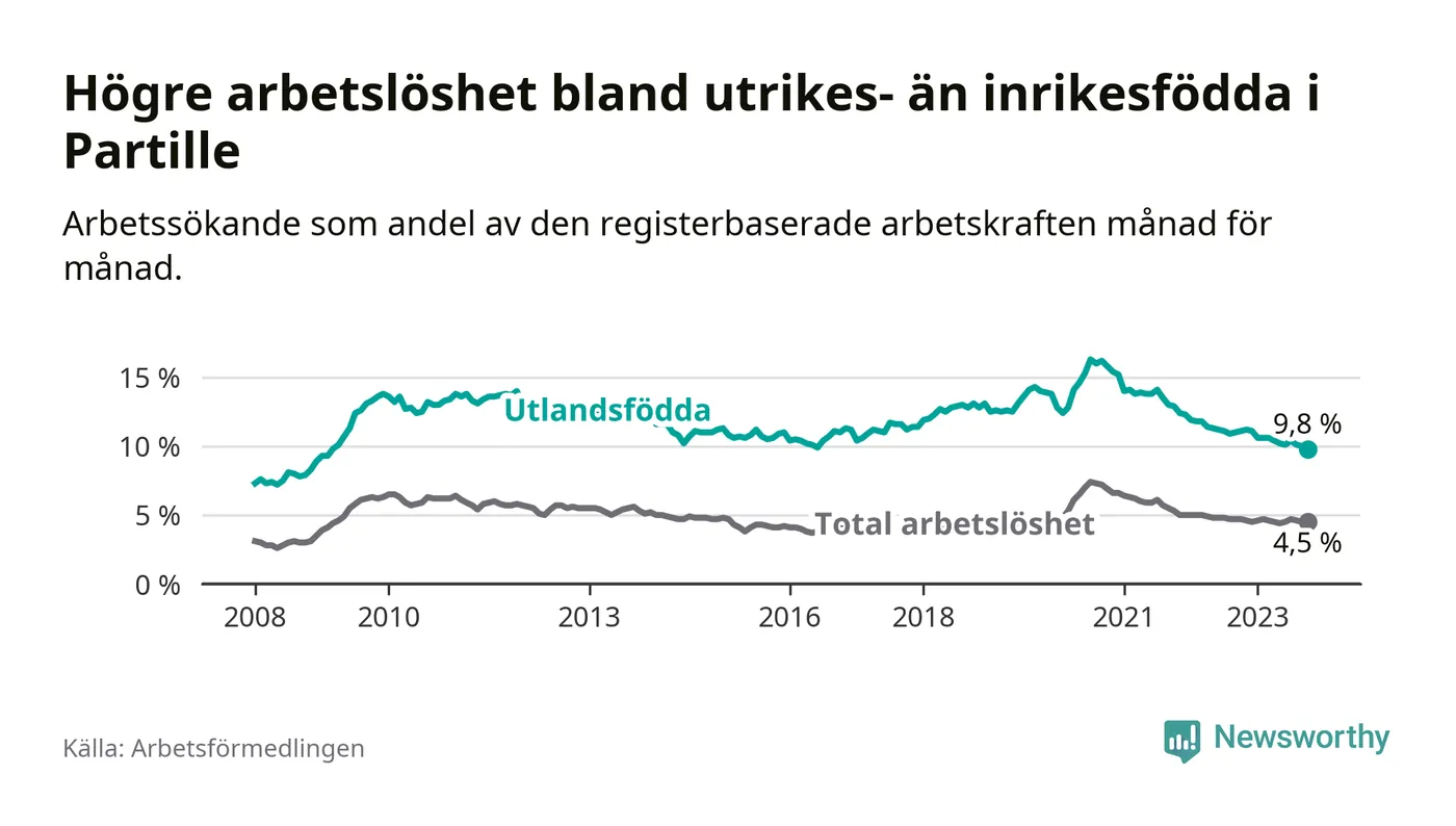 Skillnaden i arbetslöshet mellan utrikesfödda och hela befolkningen är 5,3 procentenheter i Partille. Det är en mindre skillnad än för ett år sedan (−1,1 procentenheter).