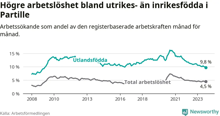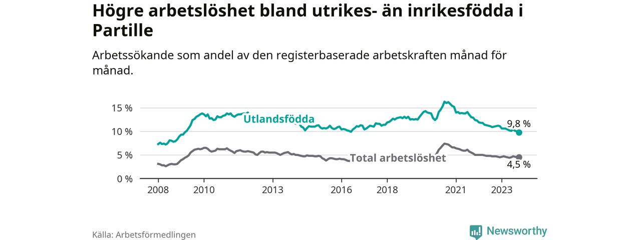 Arbetslösheten bland utlandsfödda var 9,8 procent i Partille under oktober månad, motsvarande 483 av 4 929 personer. Det är 1,3 procentenheter färre än vid samma tidpunkt i fjol (−39 om man räknar personer). Därmed har de utlandsföddas arbetslöshet varit lägre än vid samma tidpunkt i fjol i över två år i sträck. Sedan mars 2021 har arbetslösheten bland utlandsfödda minskat från 13,8 till 9,8 procent. Den nuvarande arbetslöshetsnivån är den lägsta sedan mars 2009.