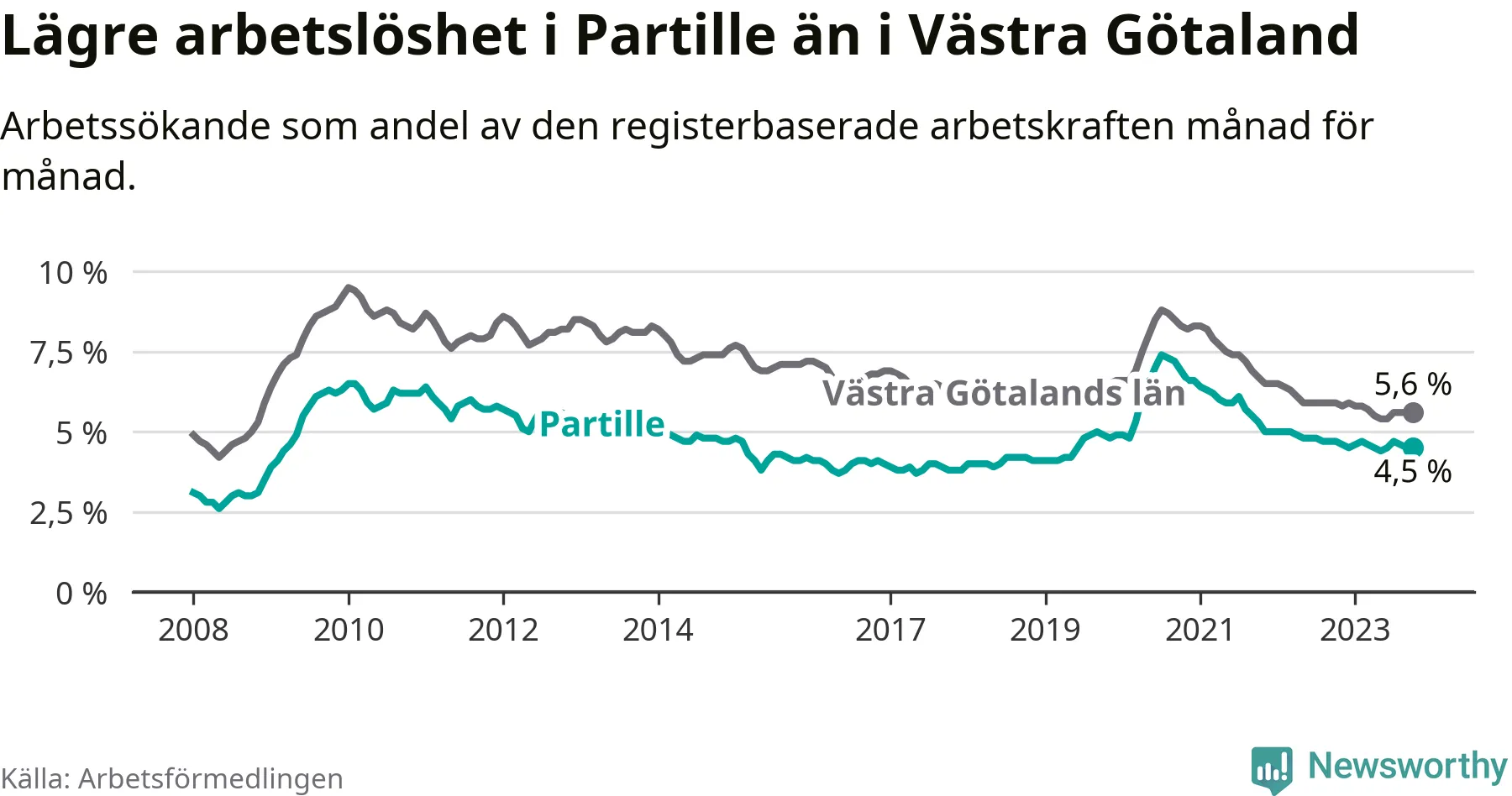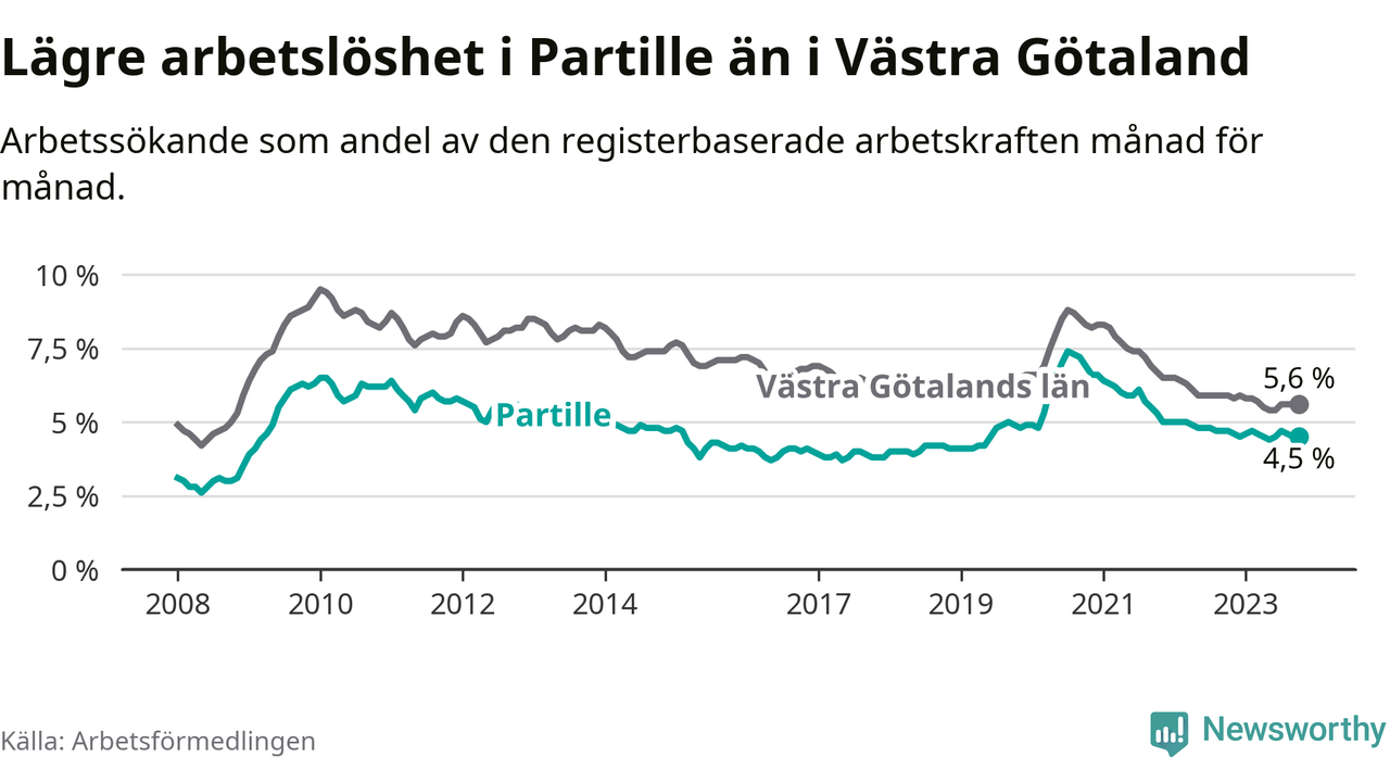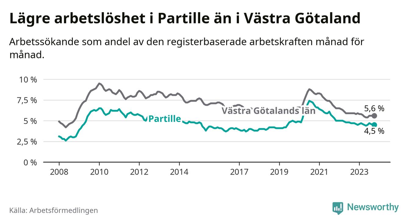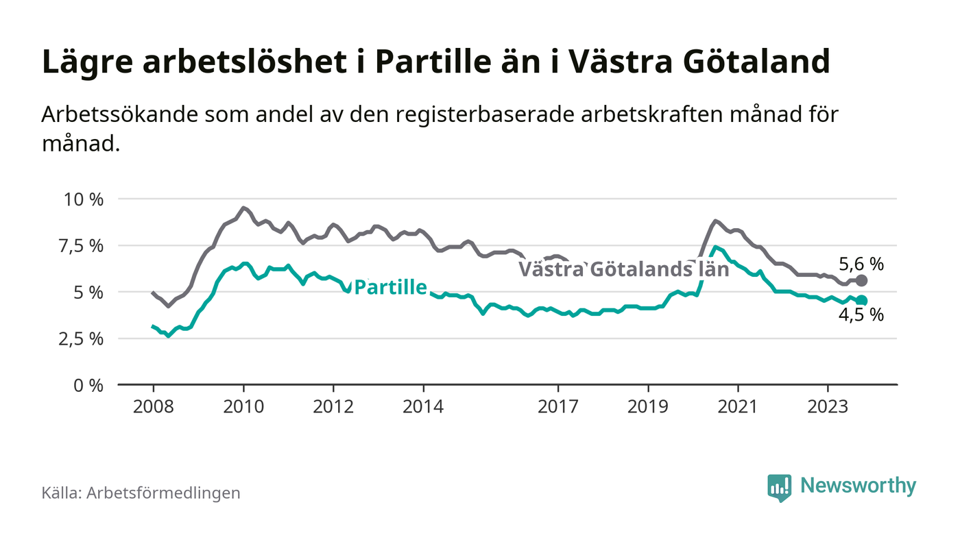 Partille hade redan tidigare lägre arbetslöshet än snittet i hela Västra Götalands län och nu växer klyftan (4,5 procent i kommunen, jämfört med 5,6 procent i hela länet). Öckerö har den lägsta arbetslösheten i länet (2,4 procent), medan Trollhättan har den högsta (8,4 procent). För att Partille skulle komma ner i samma arbetslöshetsnivå som Öckerö skulle 418 personer behöva sysselsättas.