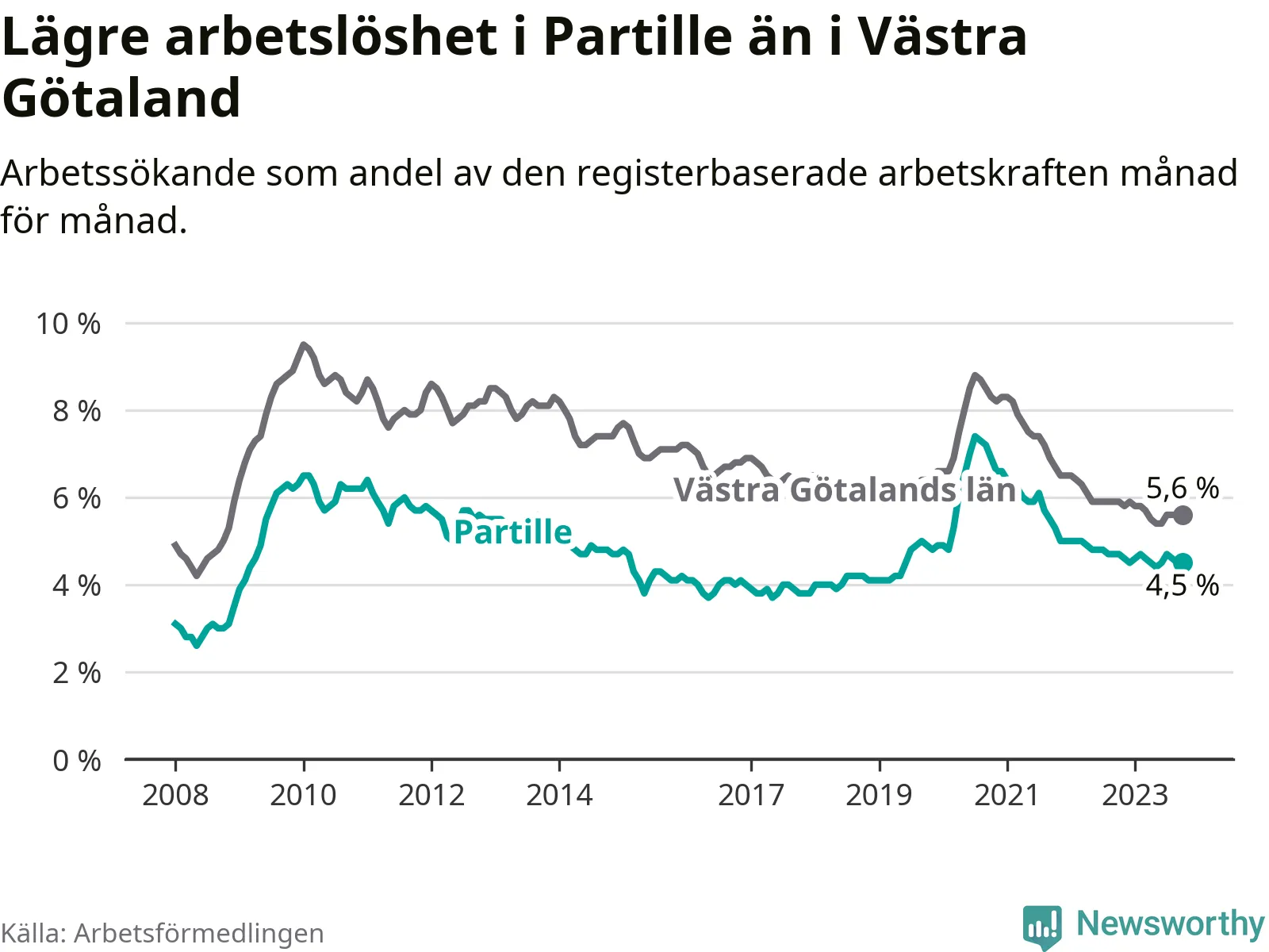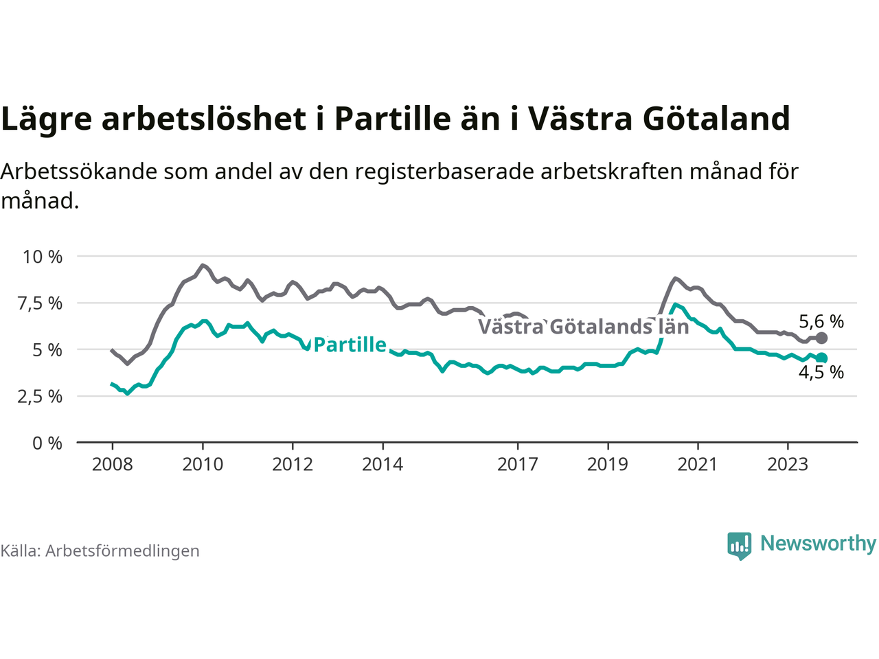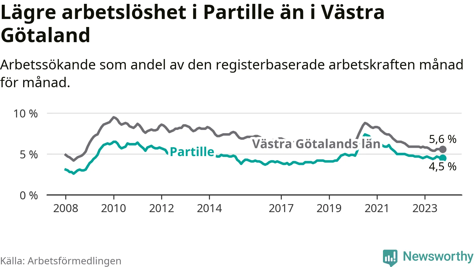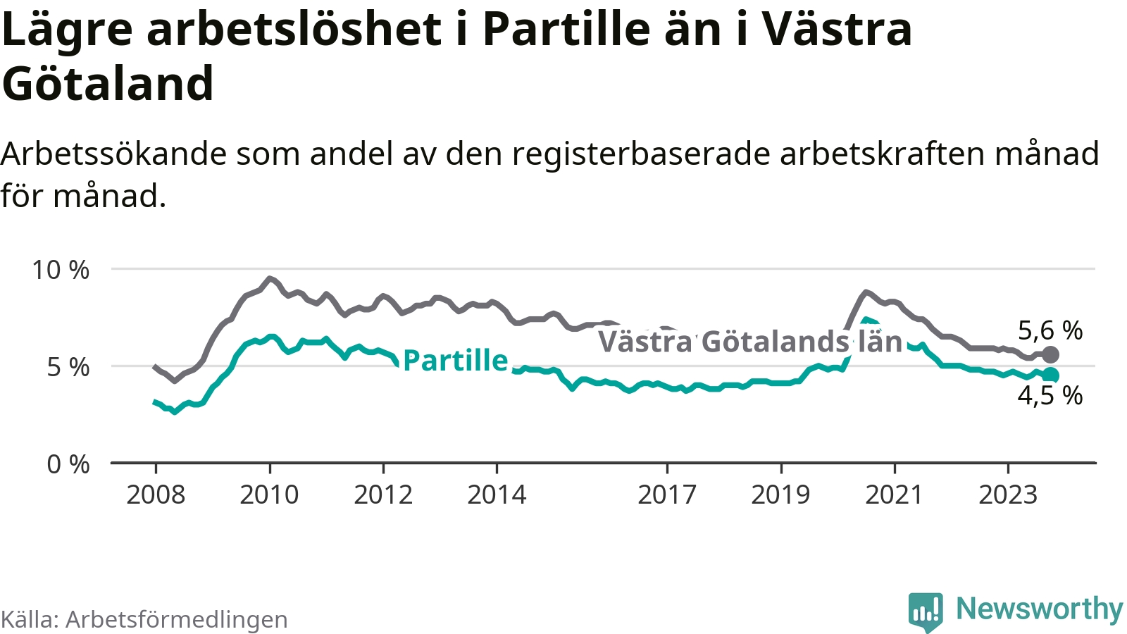 Partille hade redan tidigare lägre arbetslöshet än snittet i hela Västra Götalands län och nu växer klyftan (4,5 procent i kommunen, jämfört med 5,6 procent i hela länet). Öckerö har den lägsta arbetslösheten i länet (2,4 procent), medan Trollhättan har den högsta (8,4 procent). För att Partille skulle komma ner i samma arbetslöshetsnivå som Öckerö skulle 418 personer behöva sysselsättas.