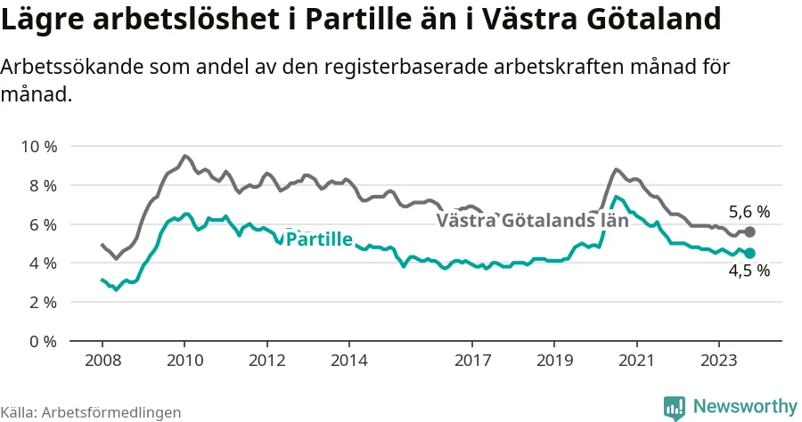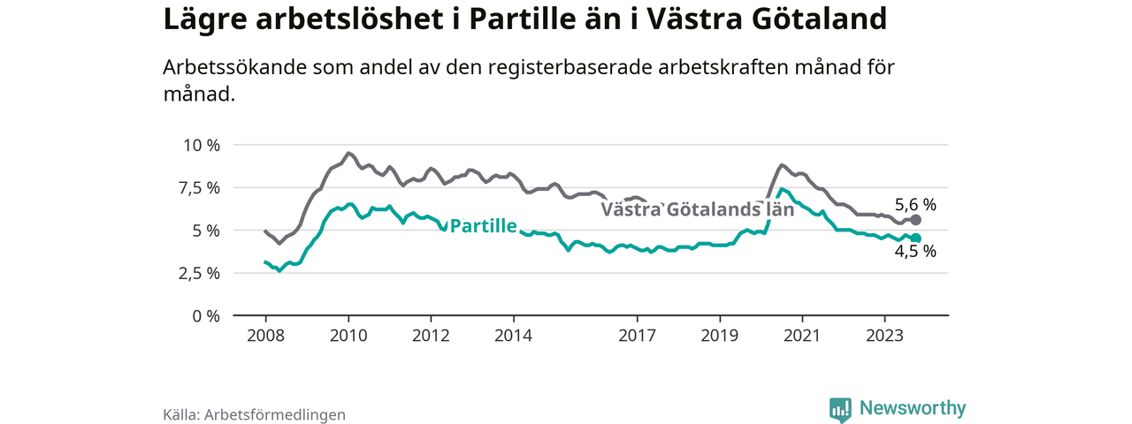 Under oktober månad rapporterade Partille kommun en total arbetslöshet på 4,5 procent. Det är en minskning jämfört med samma tidpunkt i fjol (−0,2 procentenheter). Även i Västra Götalands län sjunker arbetslösheten .