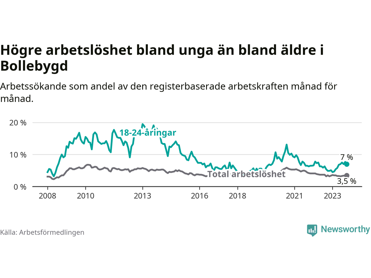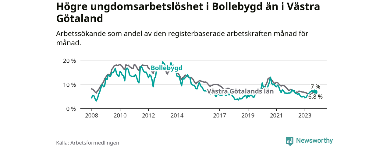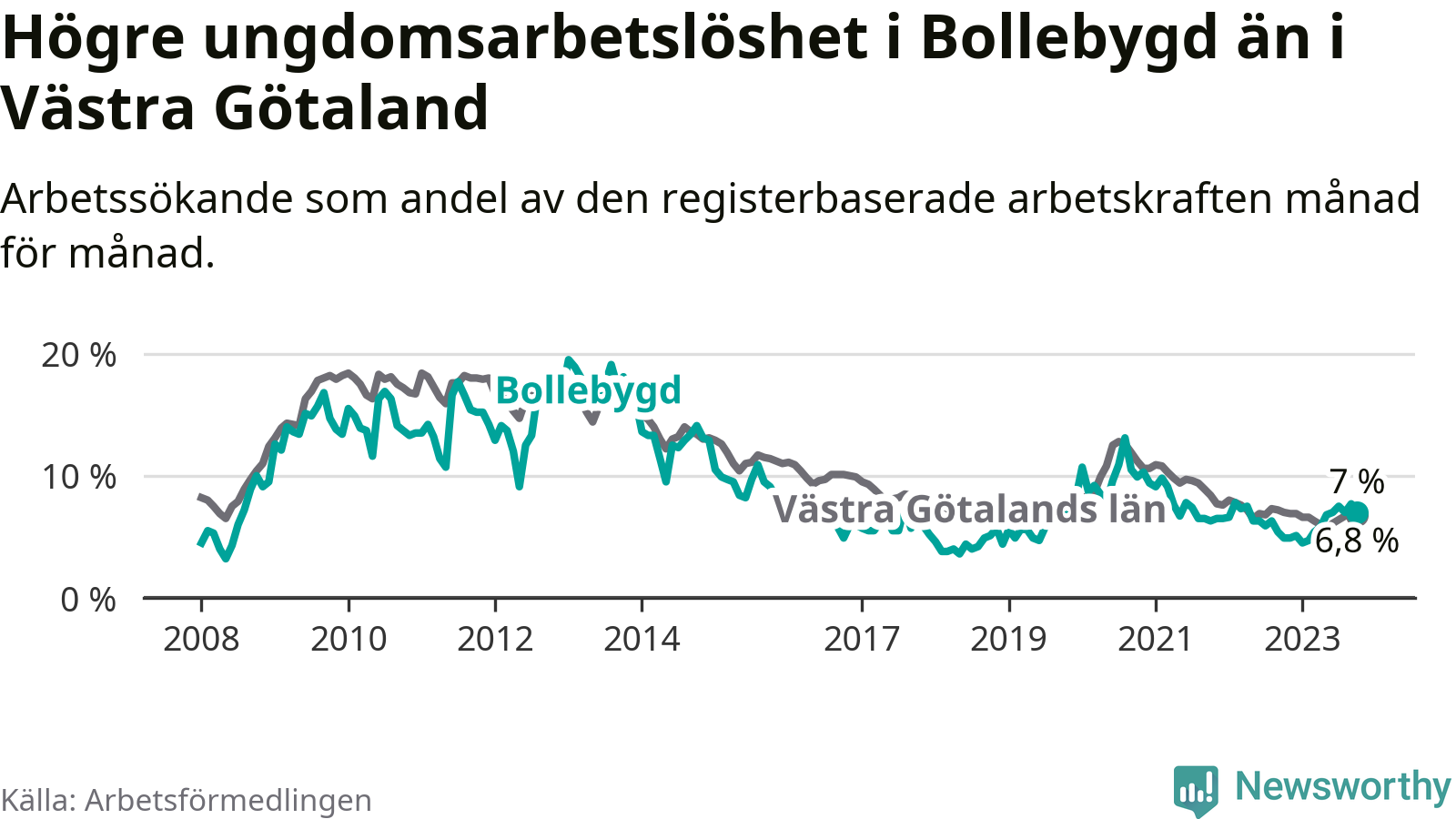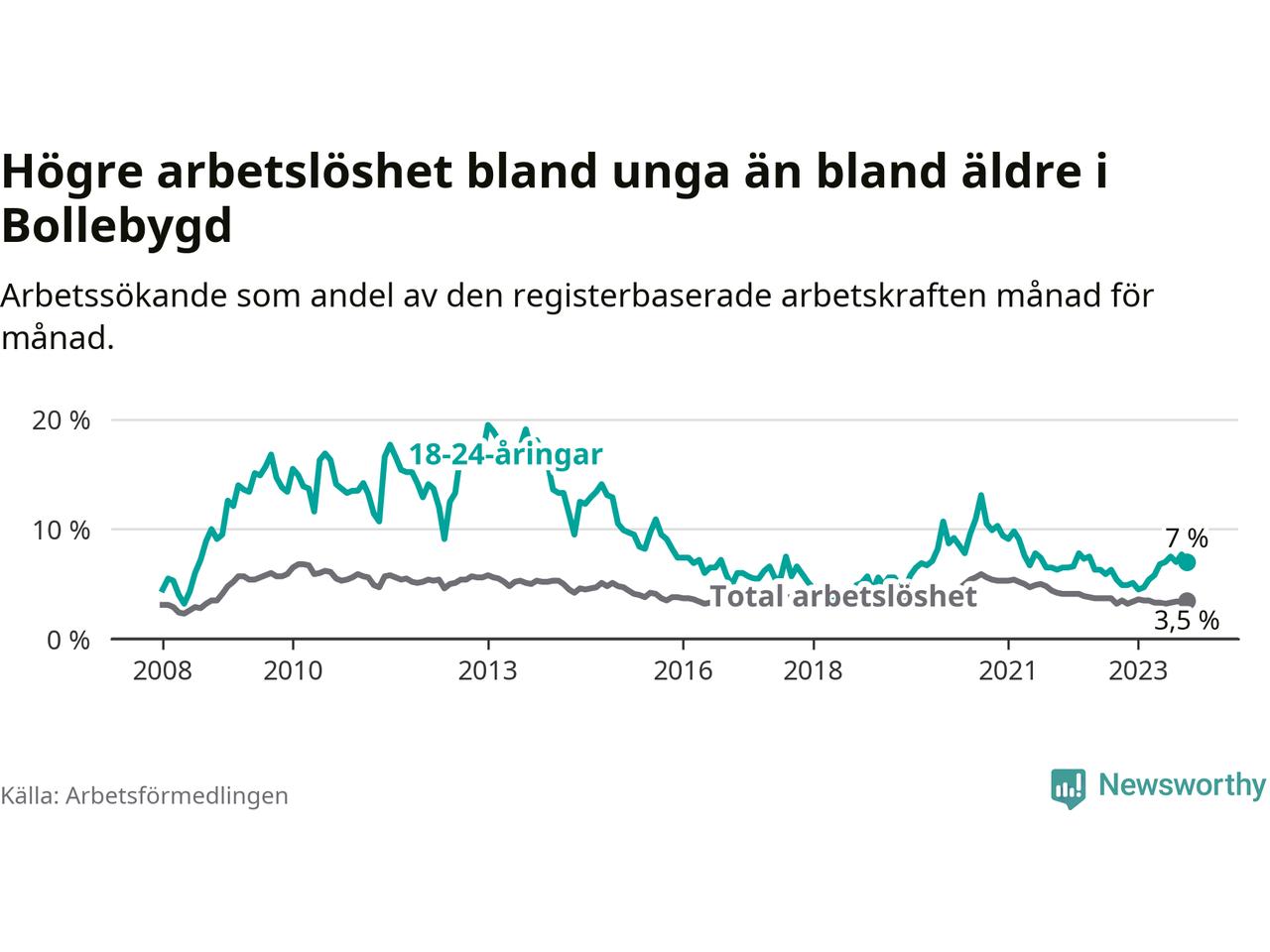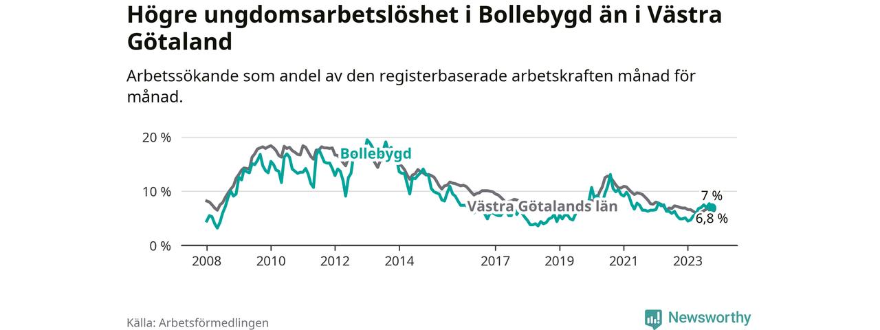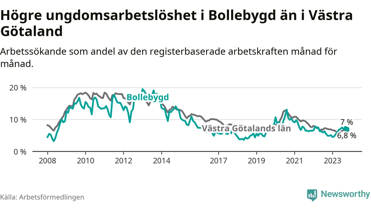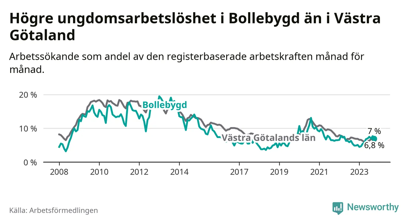 Medan Bollebygd har lägre total arbetslöshet än Västra Götaland, ligger ungdomsarbetslösheten 0,2 procentenheter högre i Bollebygd.