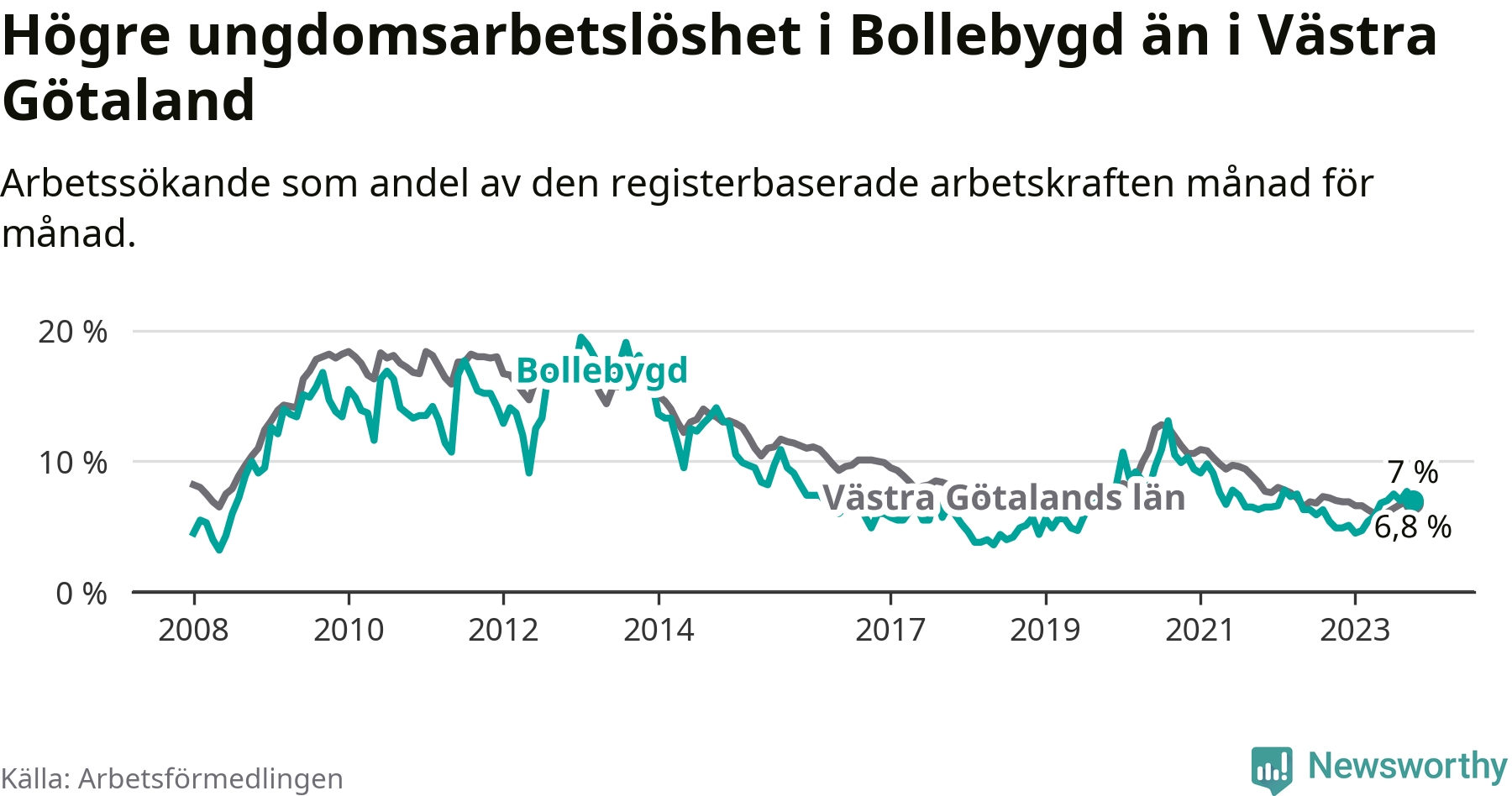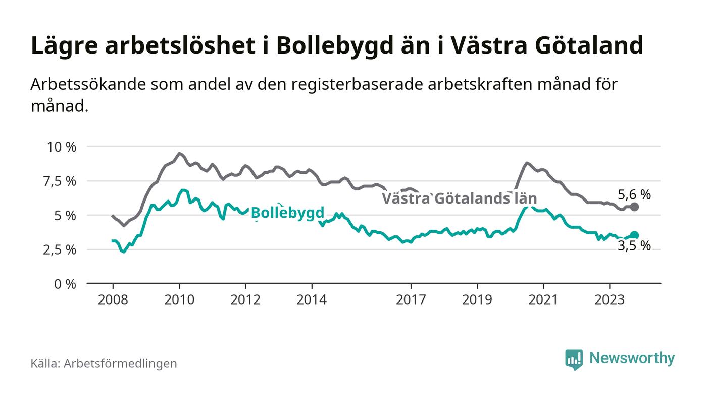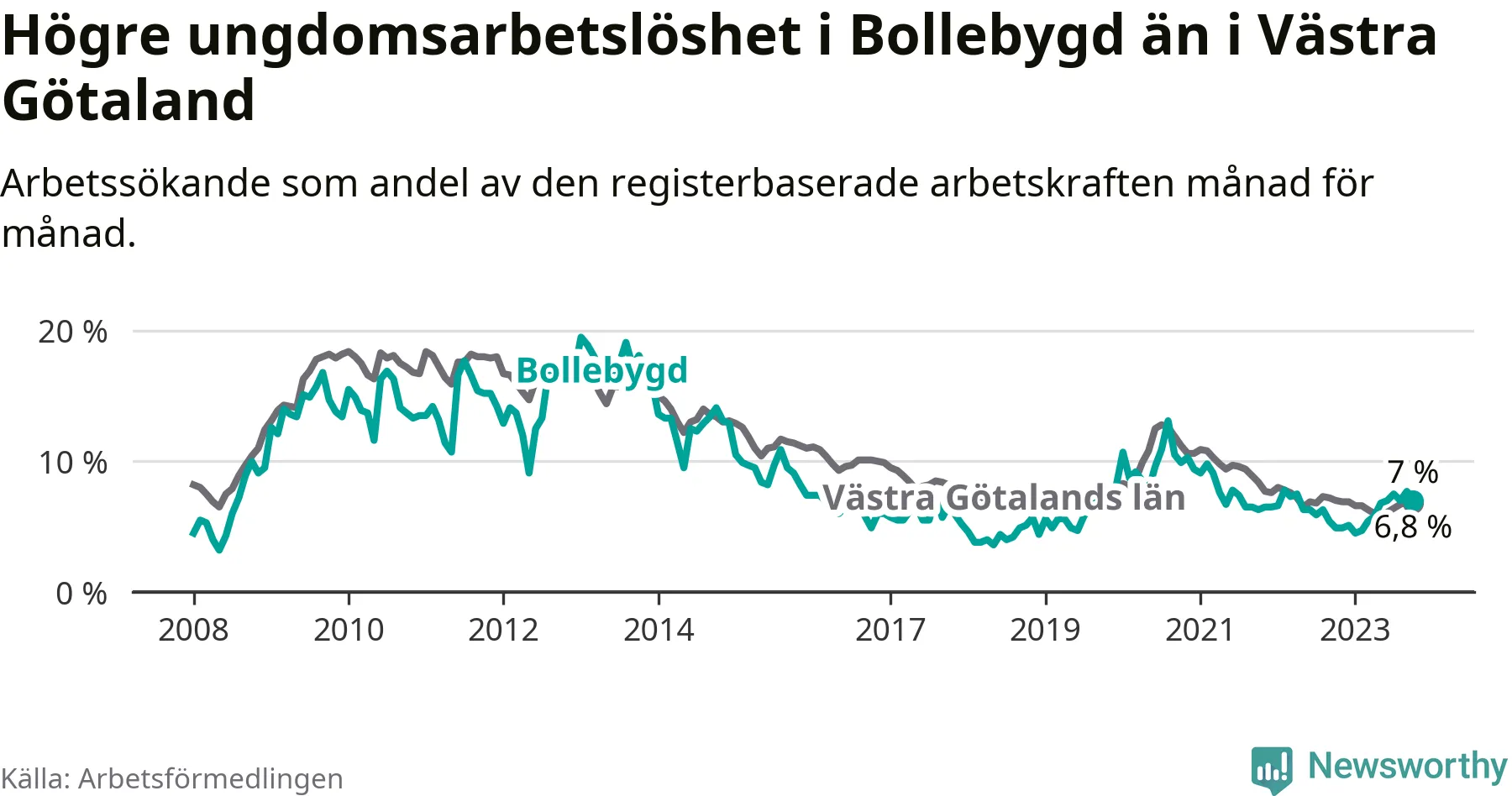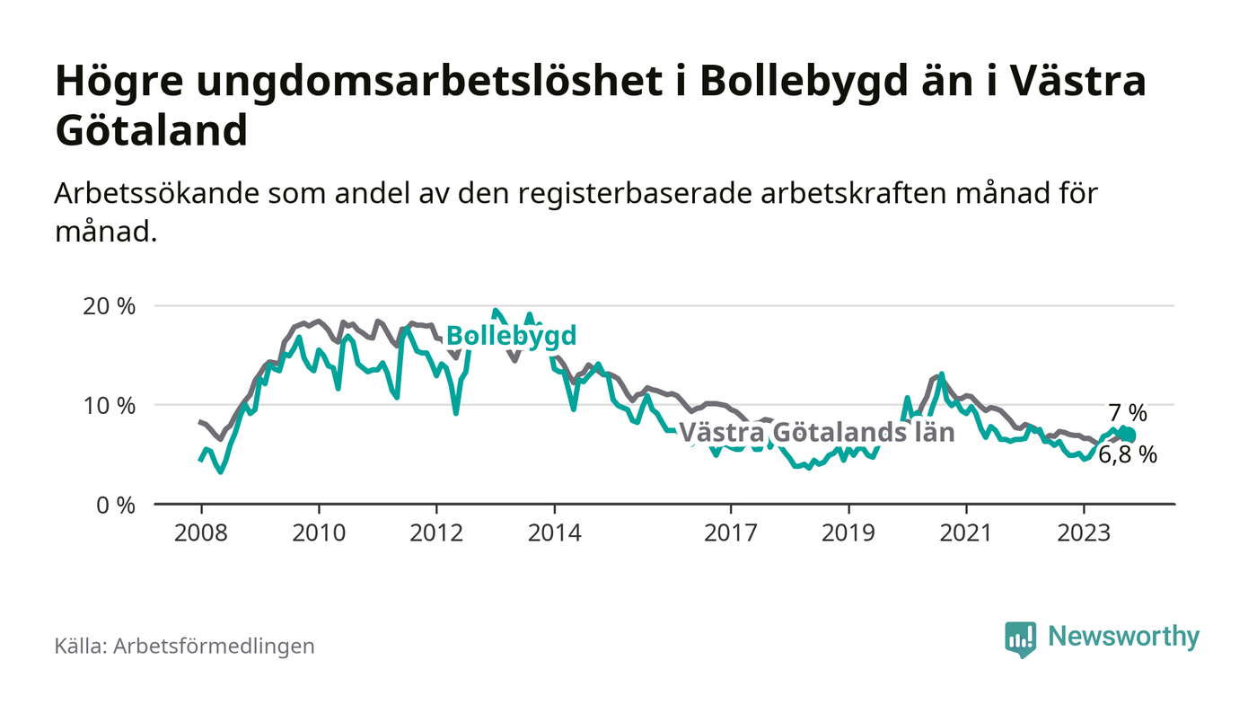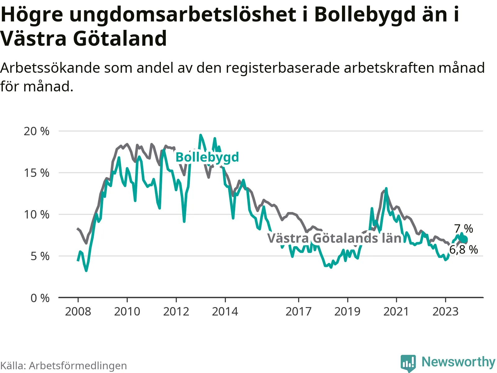 Medan Bollebygd har lägre total arbetslöshet än Västra Götaland, ligger ungdomsarbetslösheten 0,2 procentenheter högre i Bollebygd.