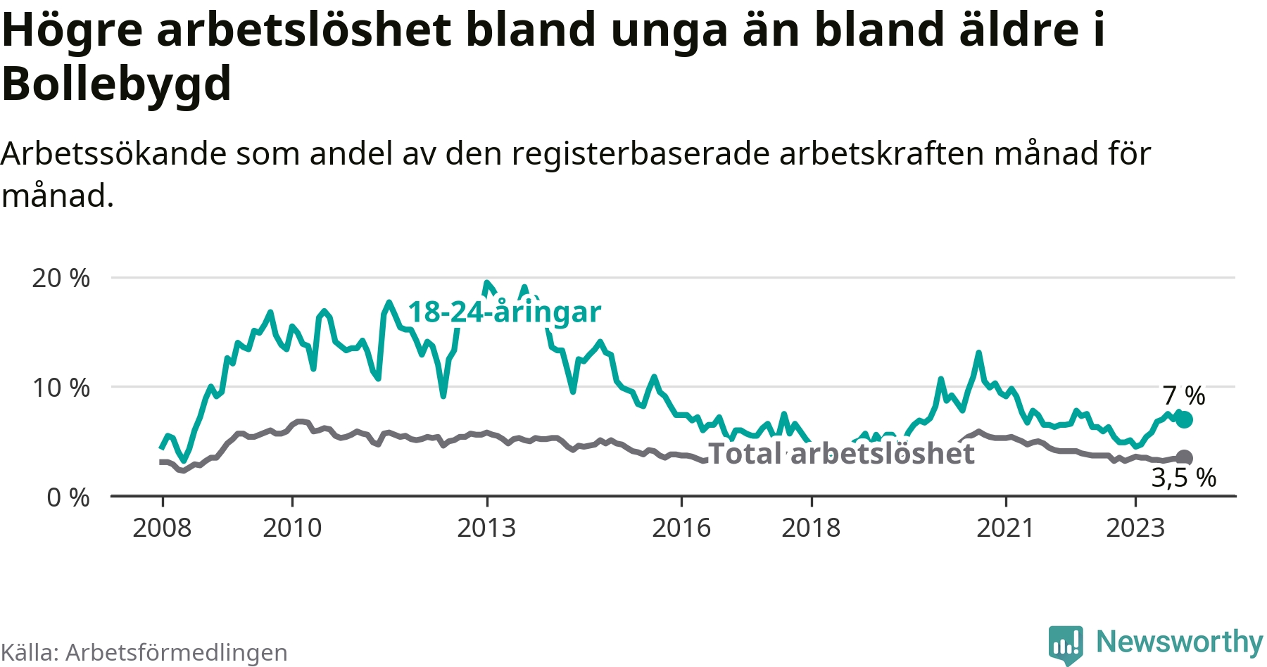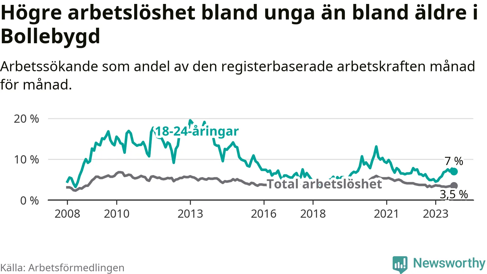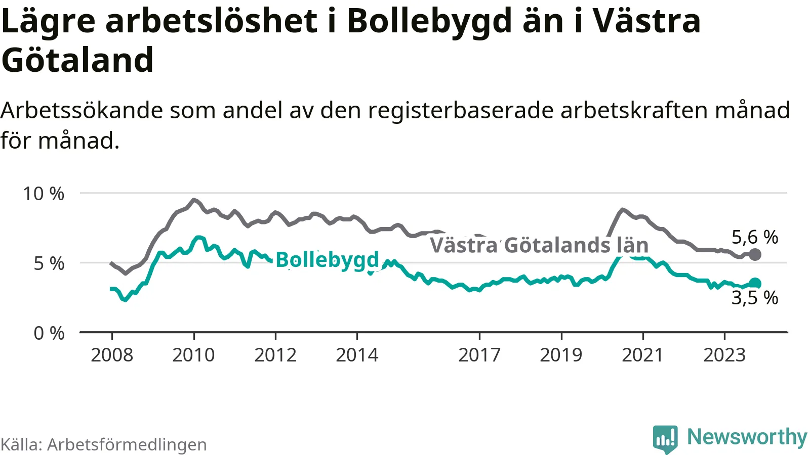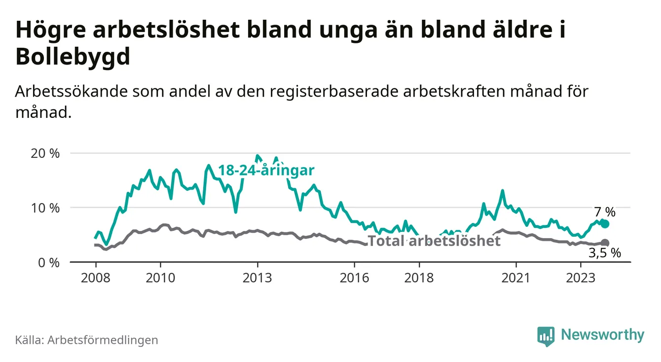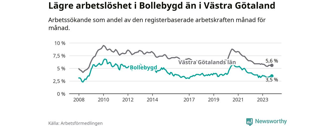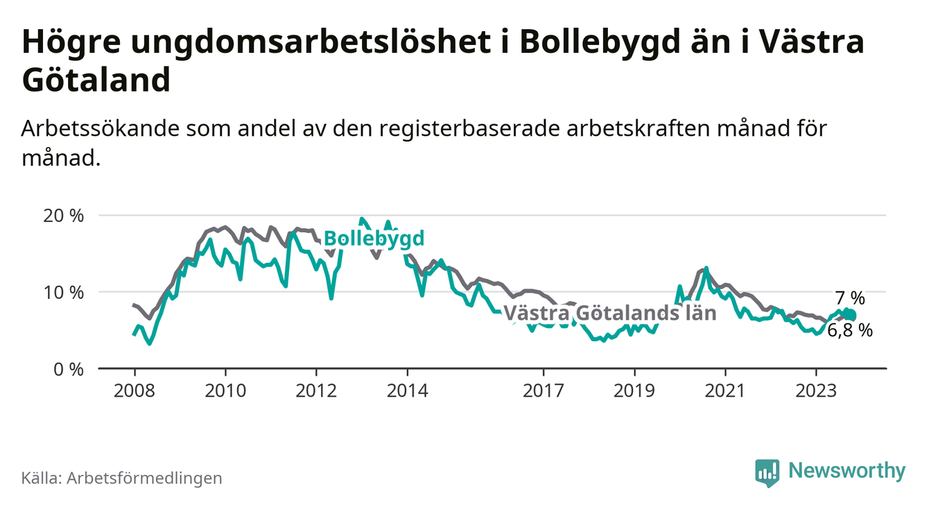 Medan Bollebygd har lägre total arbetslöshet än Västra Götaland, ligger ungdomsarbetslösheten 0,2 procentenheter högre i Bollebygd.