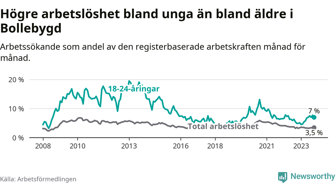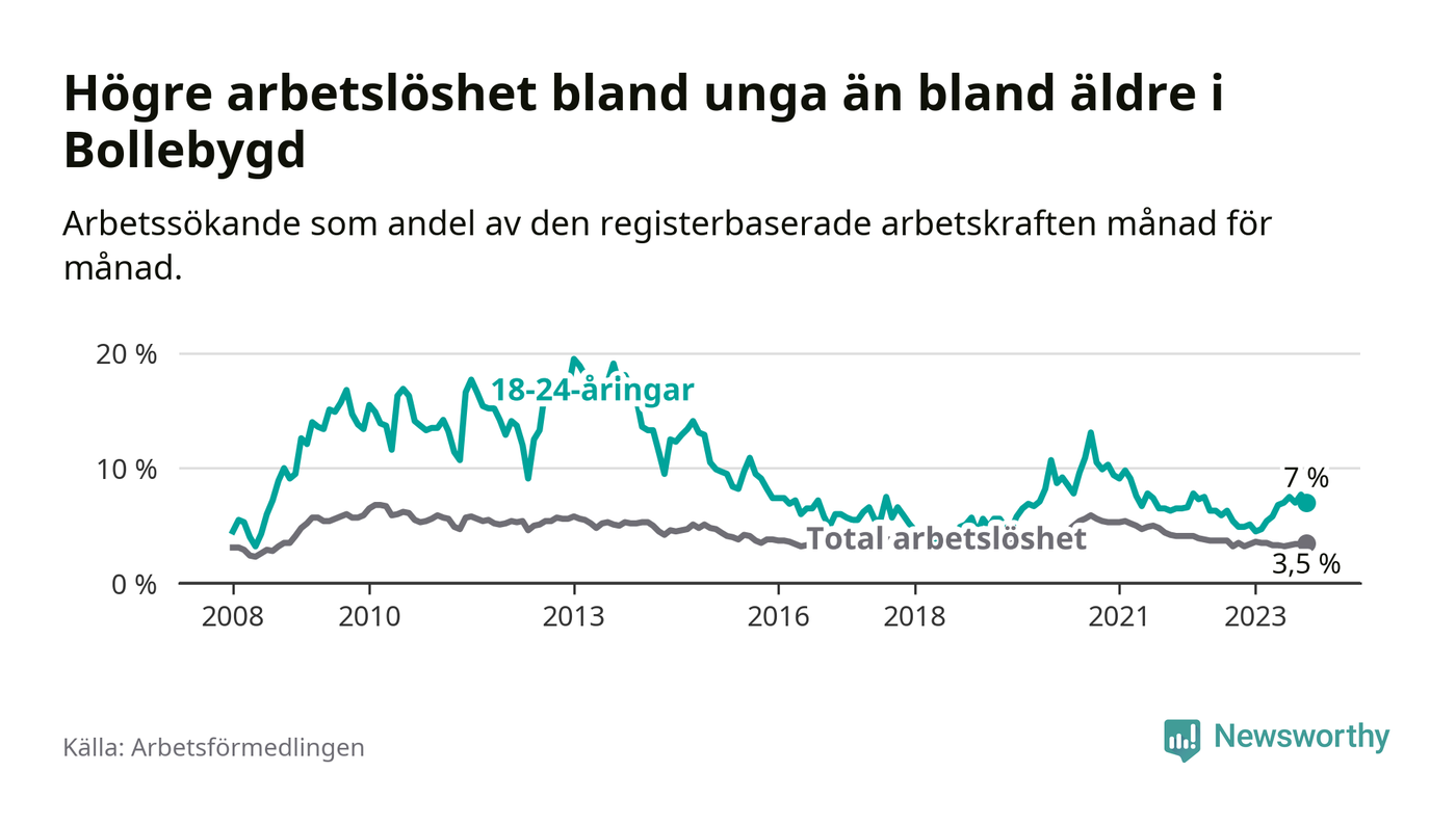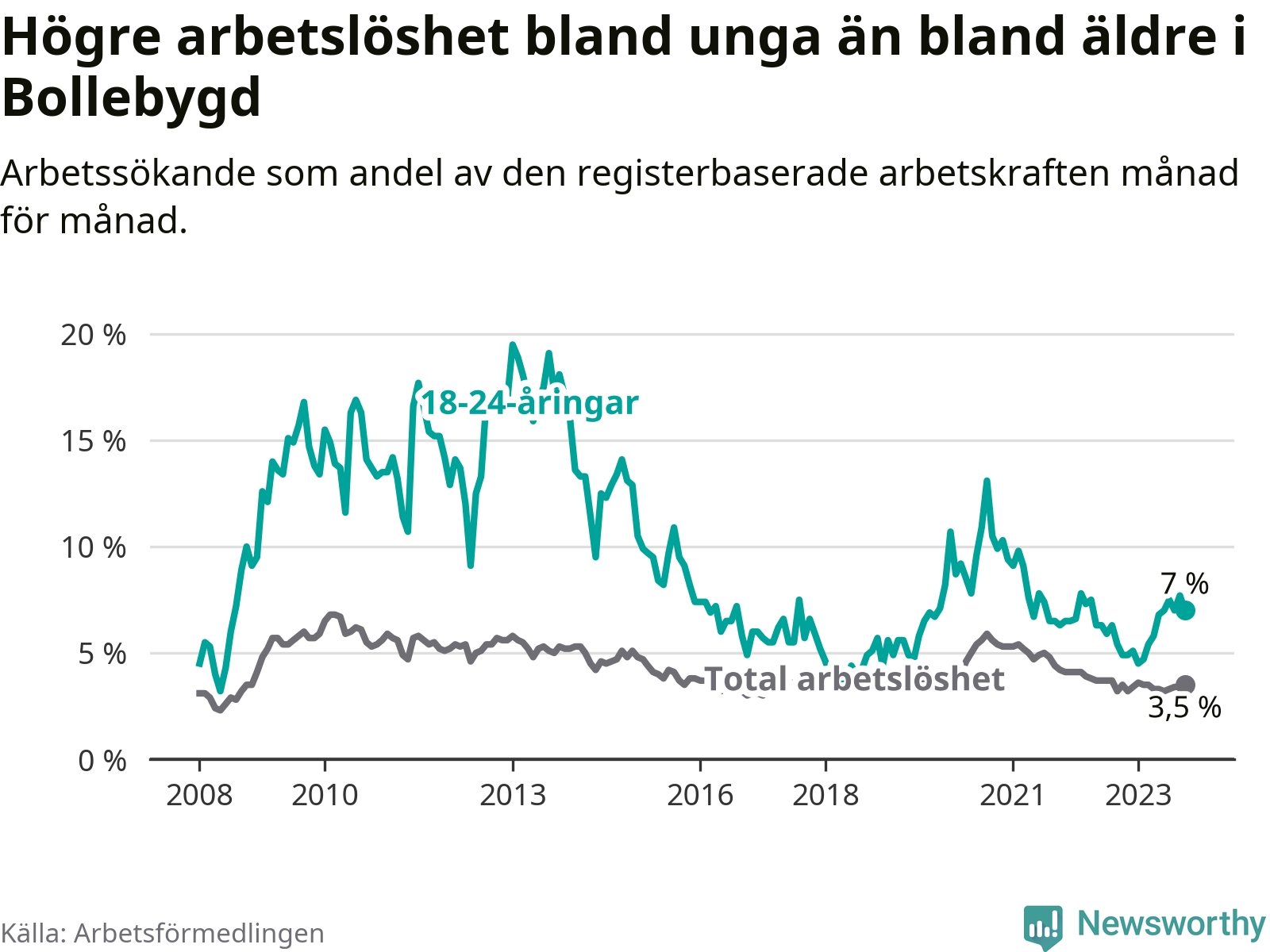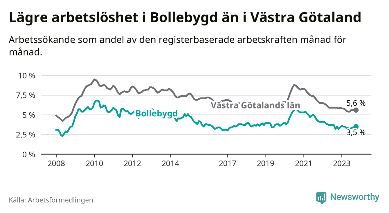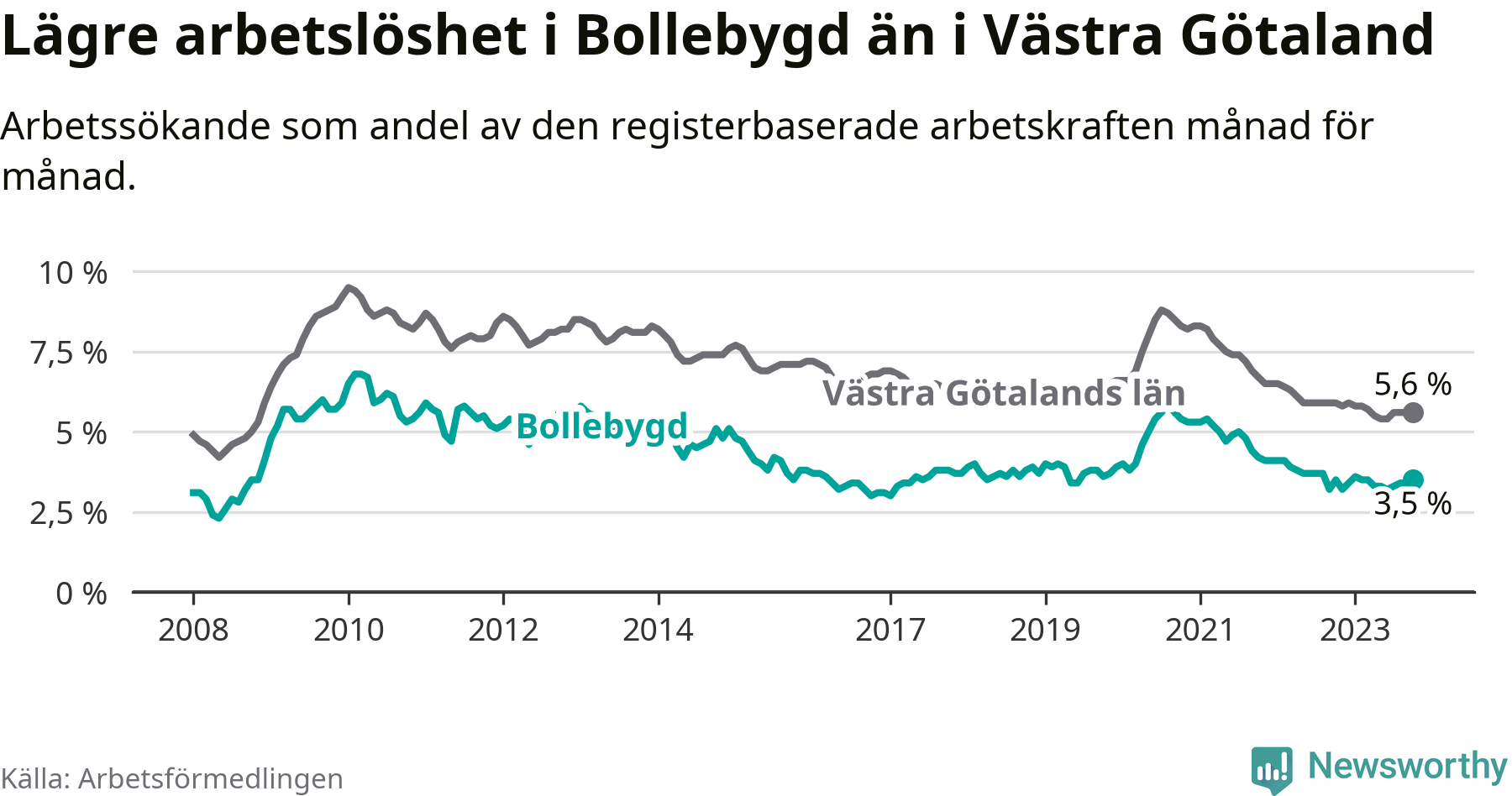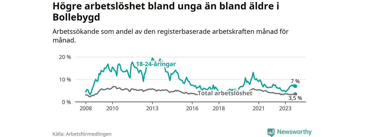 Medan Bollebygd har lägre total arbetslöshet än Västra Götaland, ligger ungdomsarbetslösheten 0,2 procentenheter högre i Bollebygd.