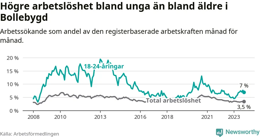 Den senaste månadsstatistiken från Arbetsförmedlingen visar på en uppgång i ungdoms­arbetslöshet i Bollebygds kommun med 2,1 procentenheter. Arbetslösheten bland personer i åldern 18–24 år låg i oktober på 7,0 procent.
