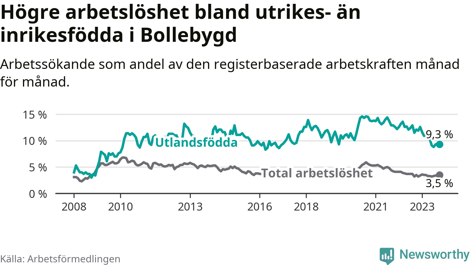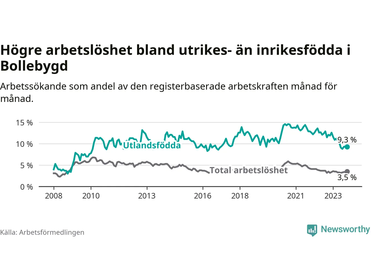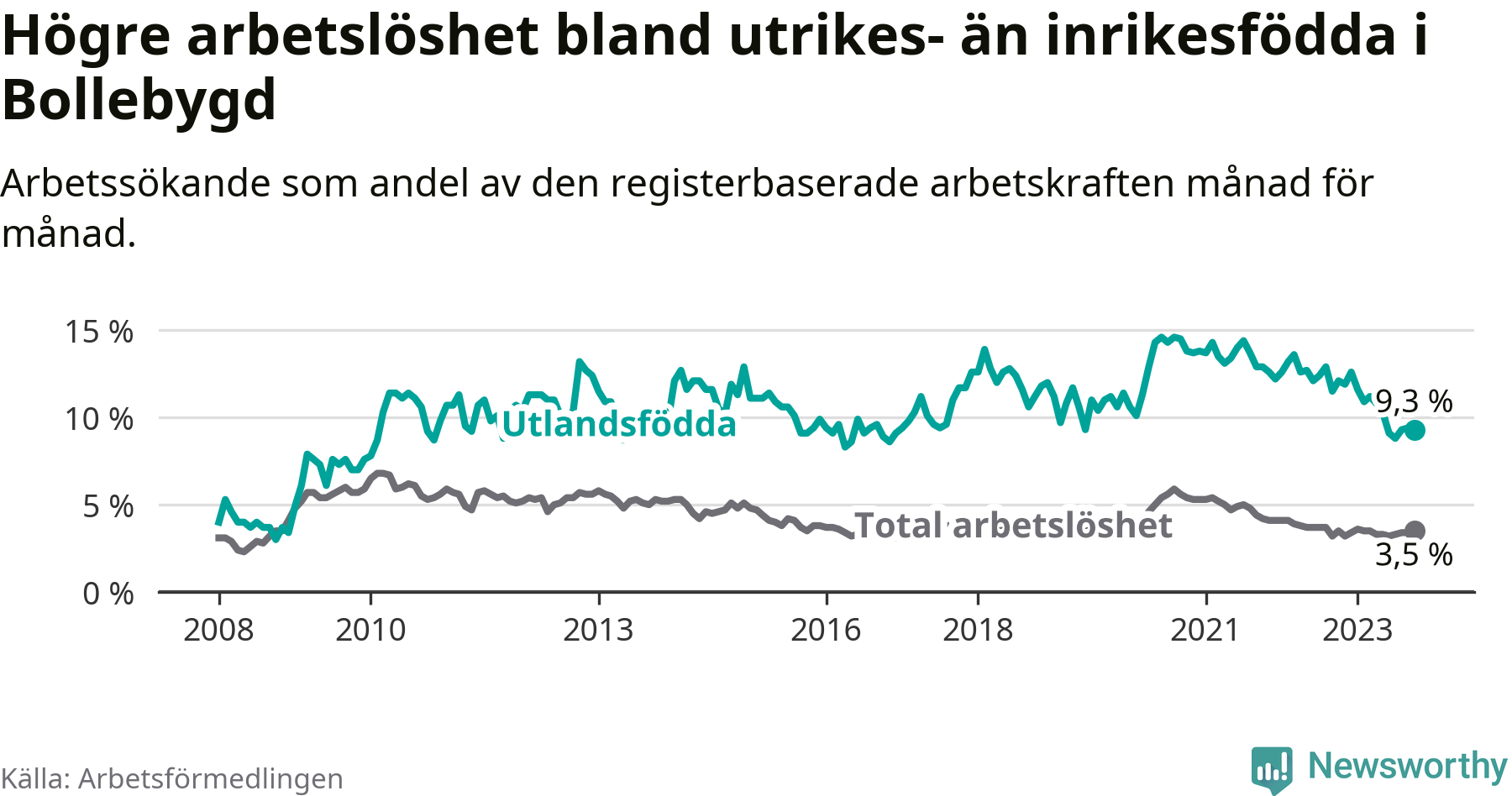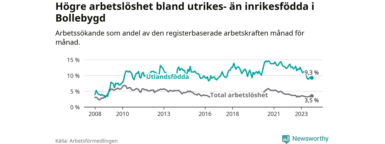 Skillnaden i arbetslöshet mellan utrikesfödda och hela befolkningen är 5,8 procentenheter i Bollebygd. Det är en betydligt mindre skillnad än för ett år sedan (−2,8 procentenheter).