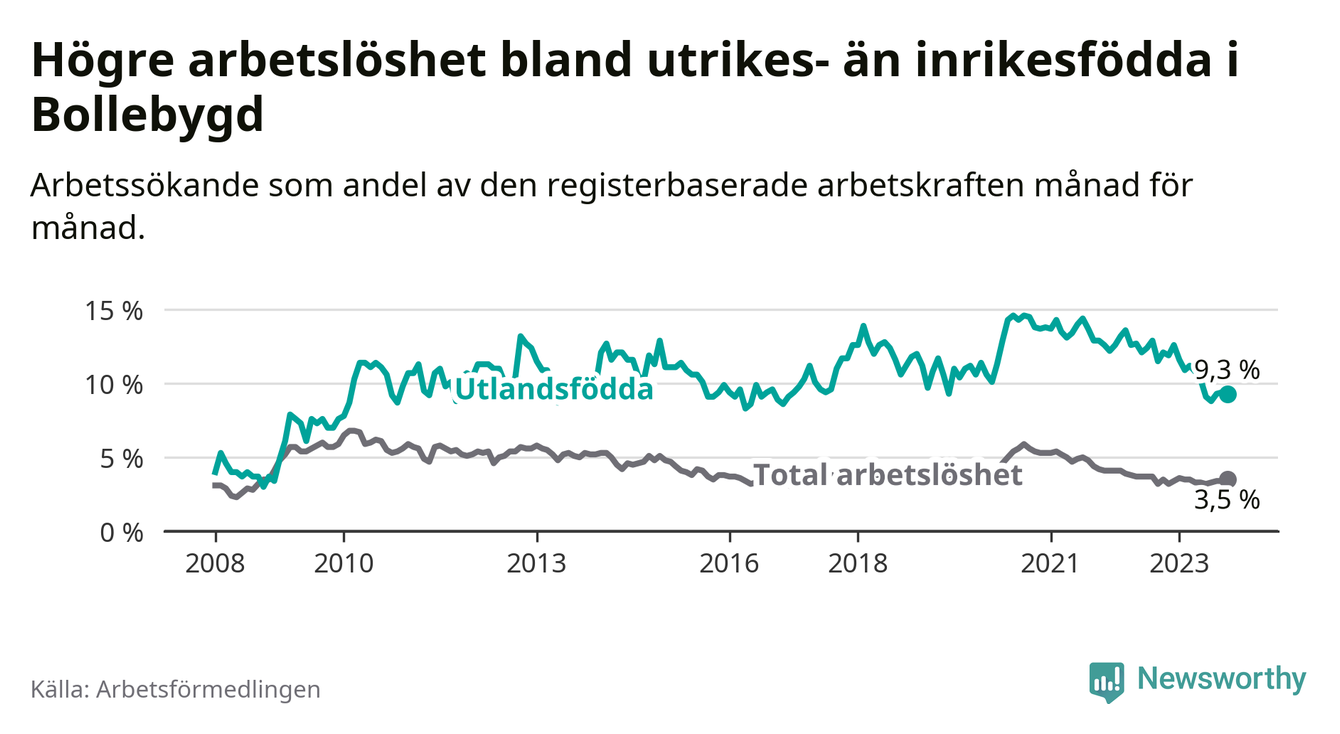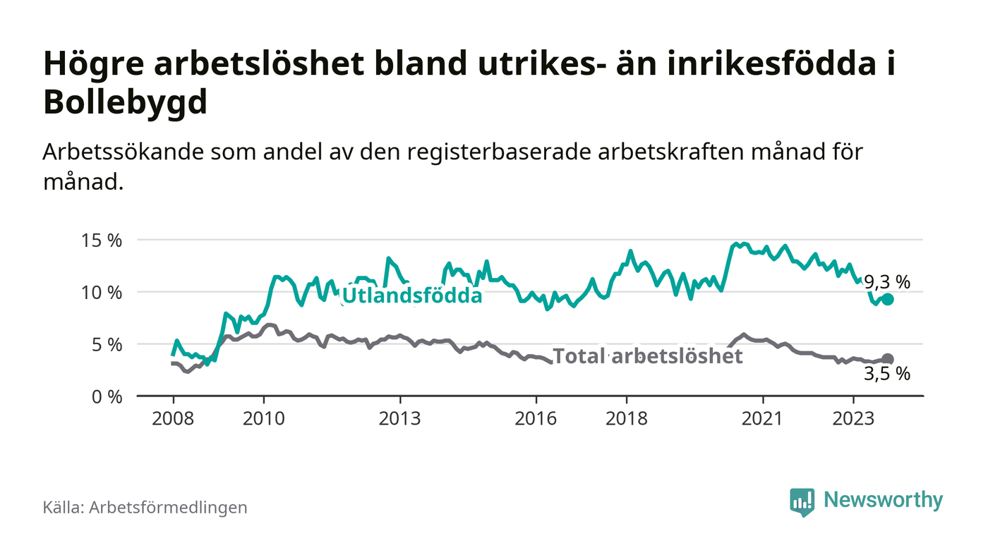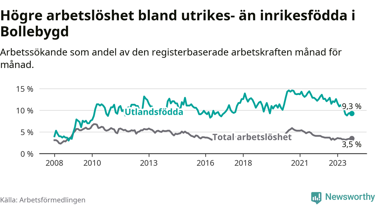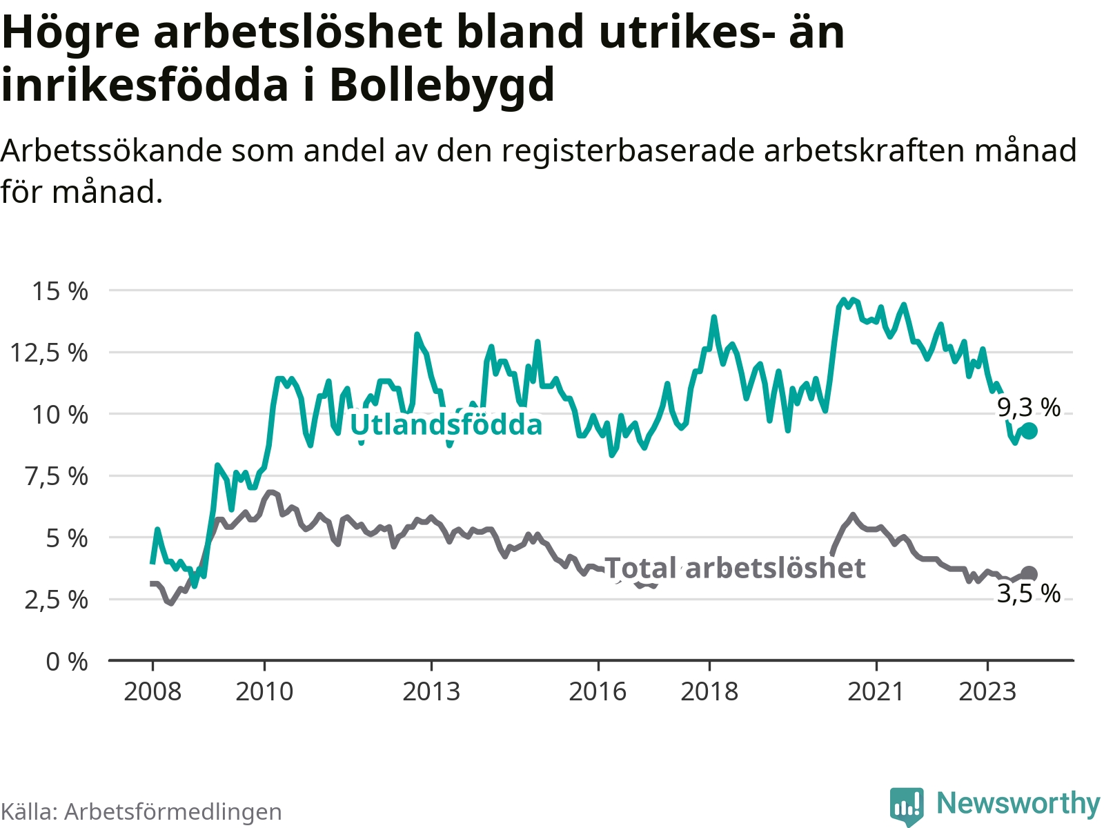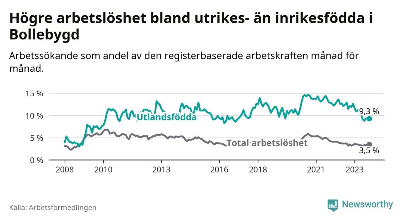 Skillnaden i arbetslöshet mellan utrikesfödda och hela befolkningen är 5,8 procentenheter i Bollebygd. Det är en betydligt mindre skillnad än för ett år sedan (−2,8 procentenheter).
