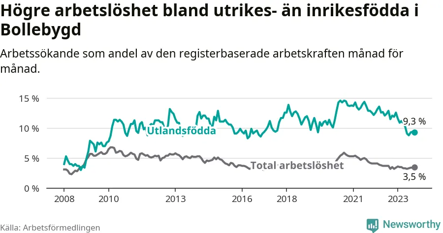 Arbetslösheten bland utlandsfödda var 9,3 procent i Bollebygd under oktober månad, motsvarande 56 av 602 personer. Det är 2,8 procentenheter färre än vid samma tidpunkt i fjol (−12 om man räknar personer). Därmed är de utlandsföddas arbetslöshet lägre än vid samma tidpunkt i fjol för tionde månaden i följd. Sedan december 2022 har arbetslösheten bland utlandsfödda minskat från 12,6 till 9,3 procent.