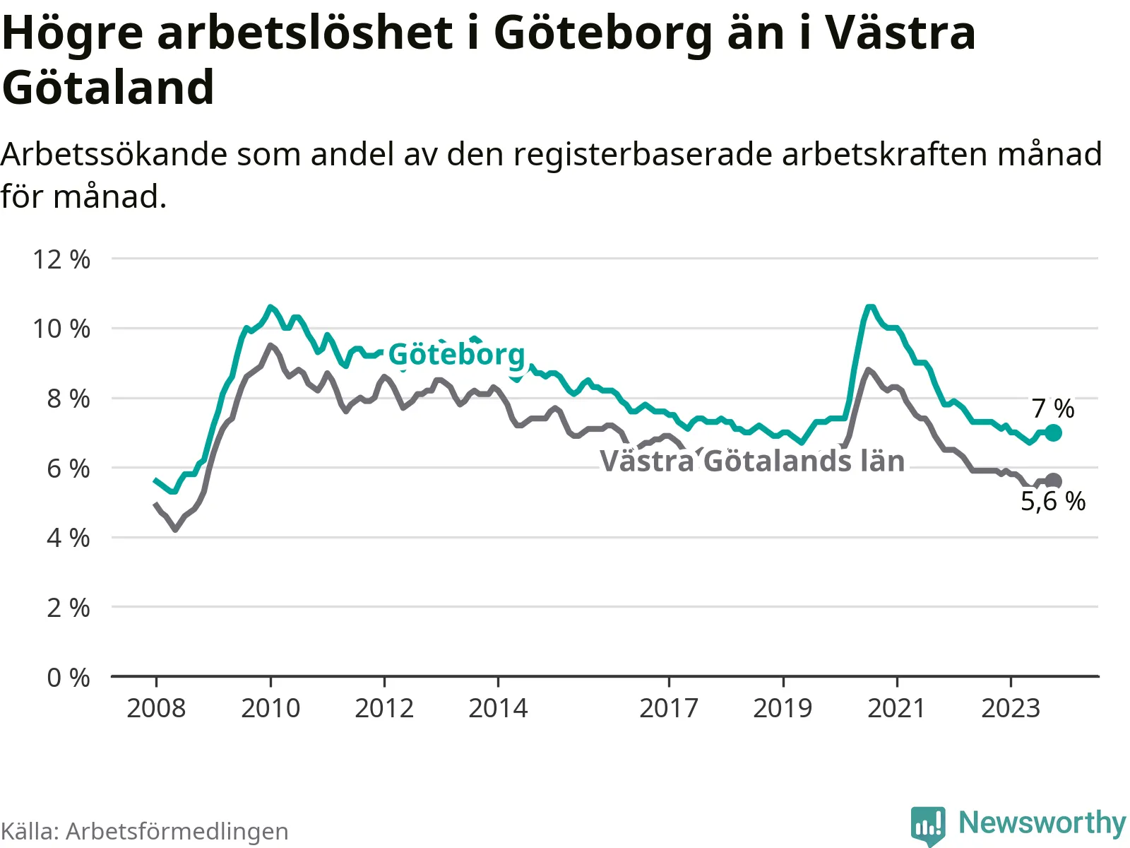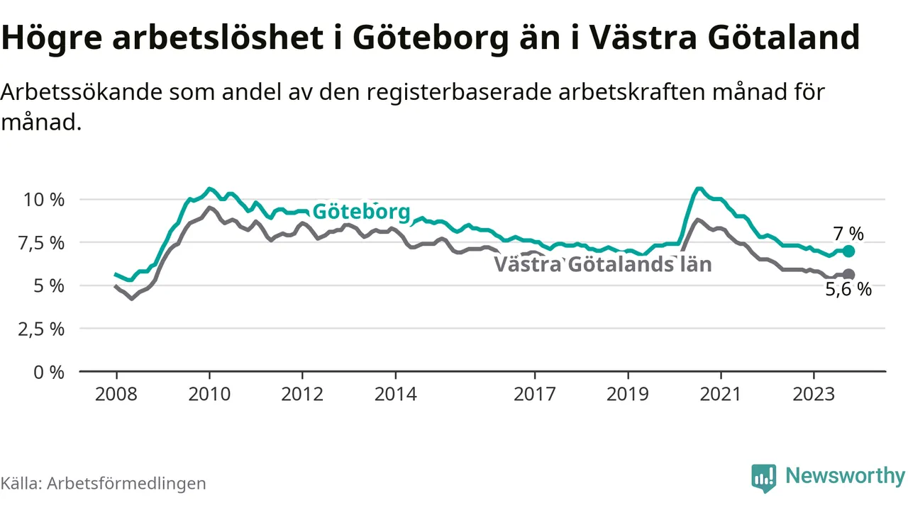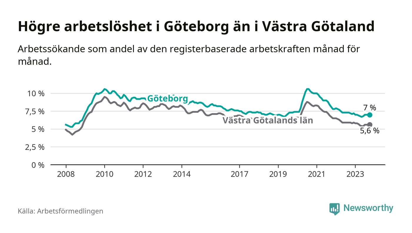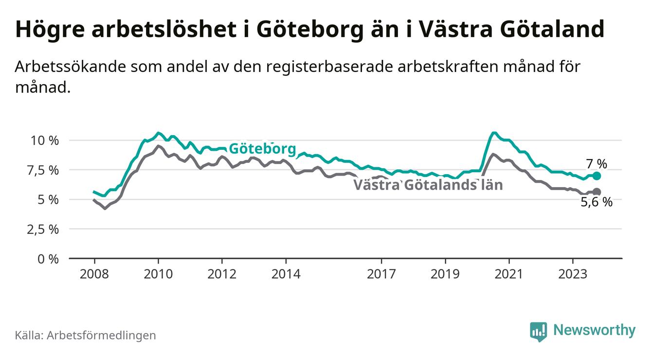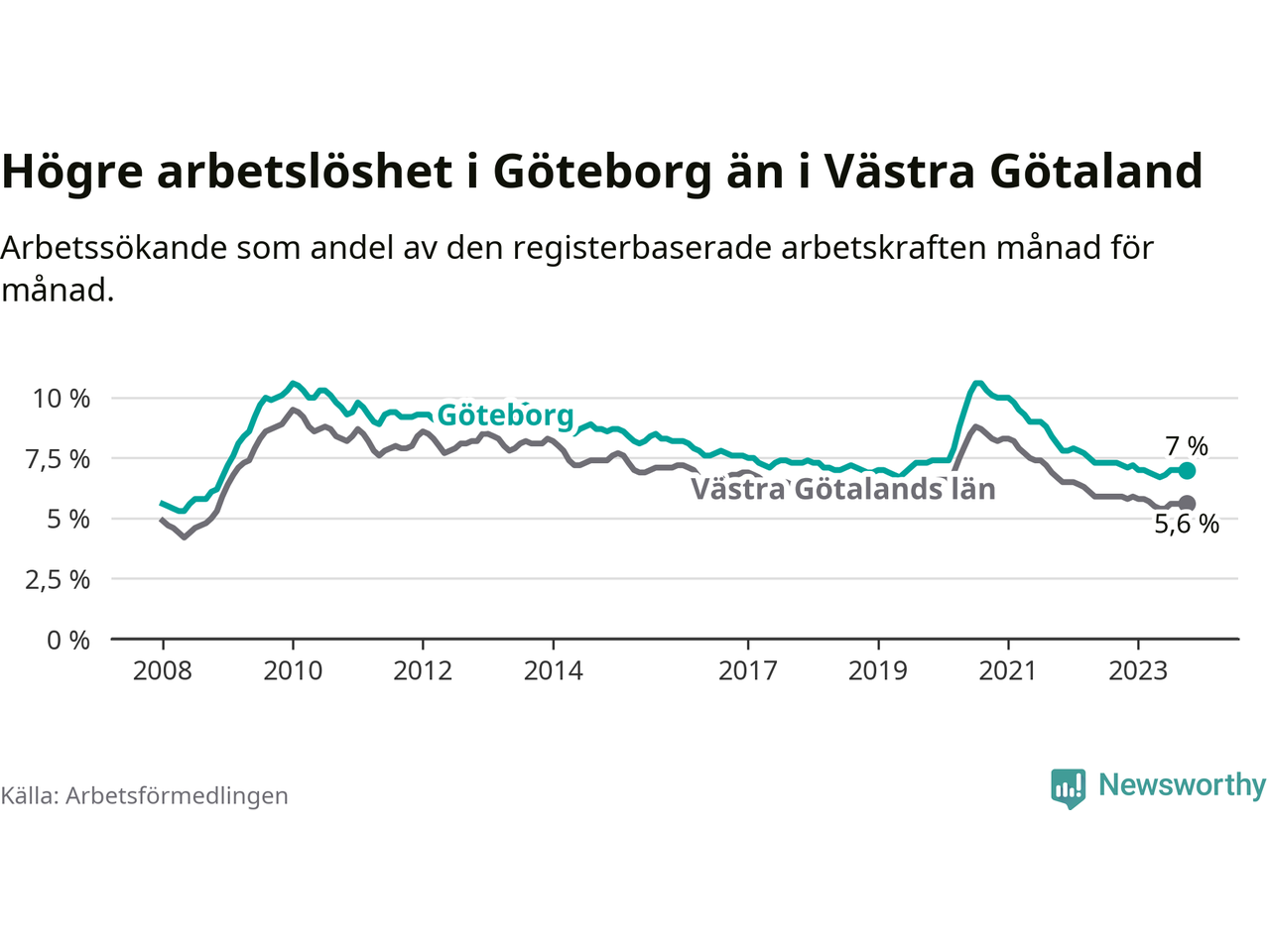 Även om arbetslösheten i Göteborg alltså minskar, så ligger den fortfarande över snittet i hela Västra Götalands län (7,0 procent i kommunen, jämfört med 5,6 procent i hela länet). Öckerö har den lägsta arbetslösheten i länet (2,4 procent), medan Trollhättan har den högsta (8,4 procent). För att Göteborg skulle komma ner i samma arbetslöshetsnivå som Öckerö skulle 14 441 personer behöva sysselsättas.