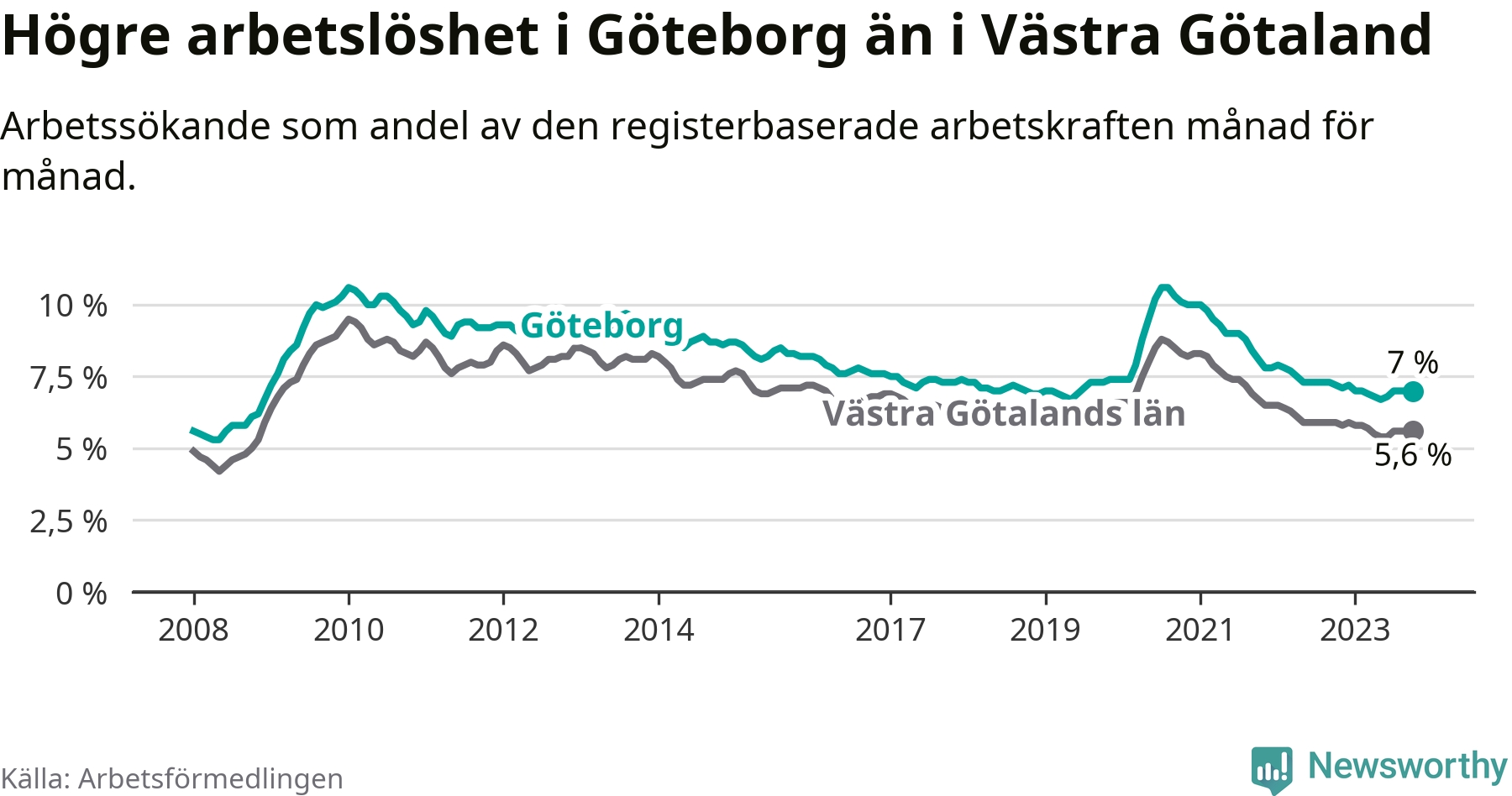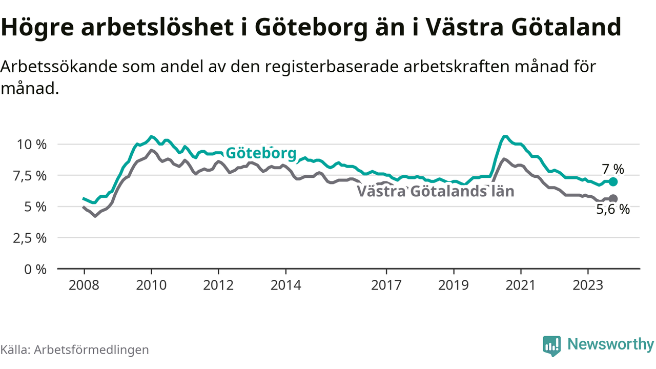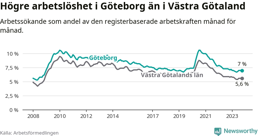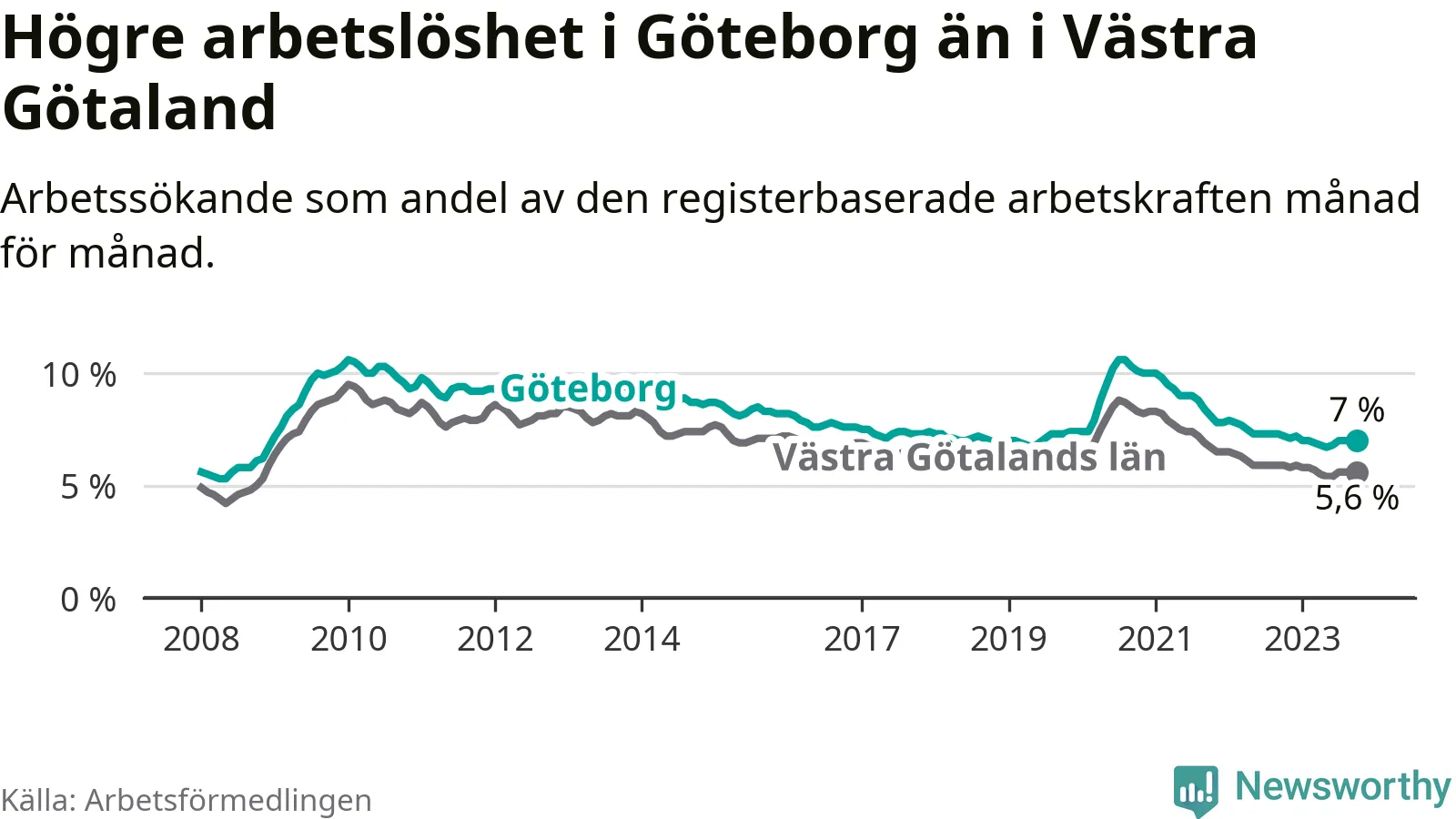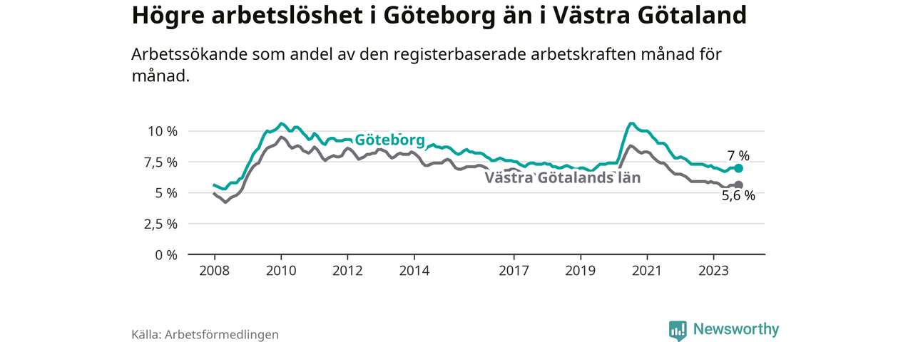 Även om arbetslösheten i Göteborg alltså minskar, så ligger den fortfarande över snittet i hela Västra Götalands län (7,0 procent i kommunen, jämfört med 5,6 procent i hela länet). Öckerö har den lägsta arbetslösheten i länet (2,4 procent), medan Trollhättan har den högsta (8,4 procent). För att Göteborg skulle komma ner i samma arbetslöshetsnivå som Öckerö skulle 14 441 personer behöva sysselsättas.