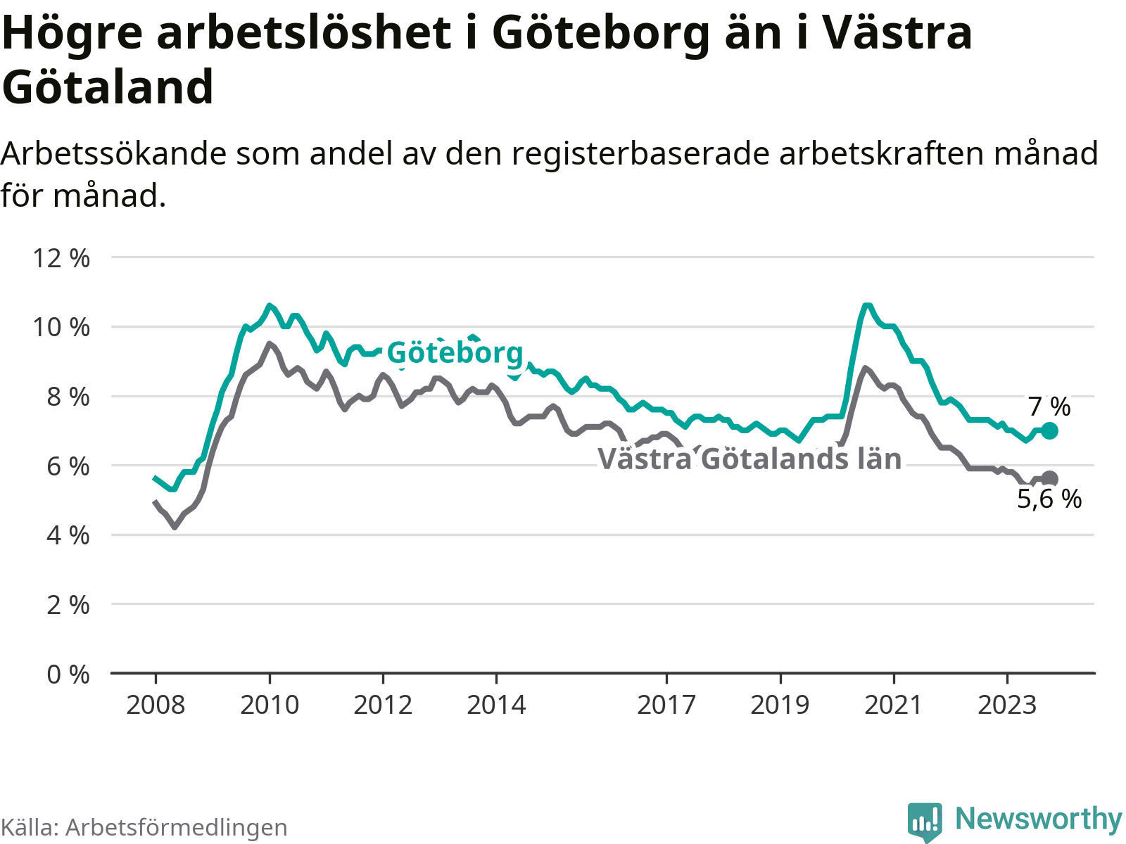 Graf: Arbetslöshet i Göteborgs kommun och Västra Götalands län