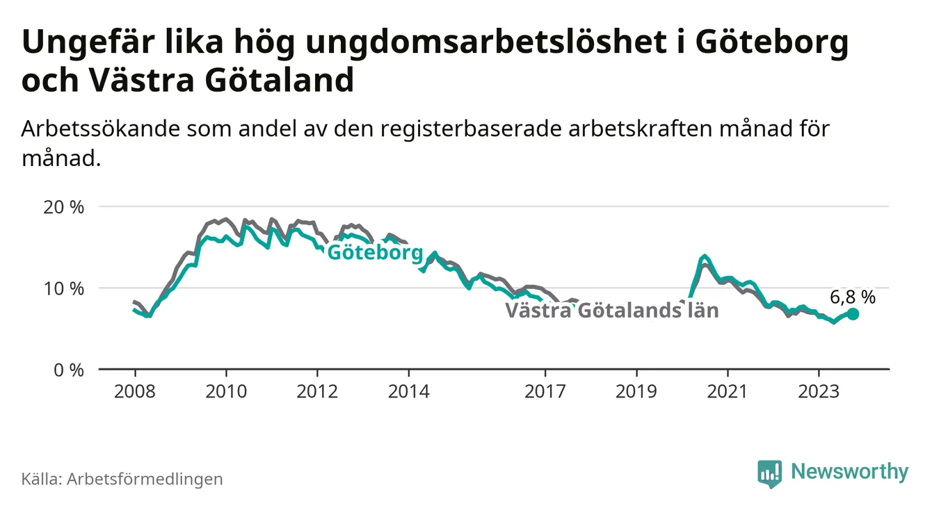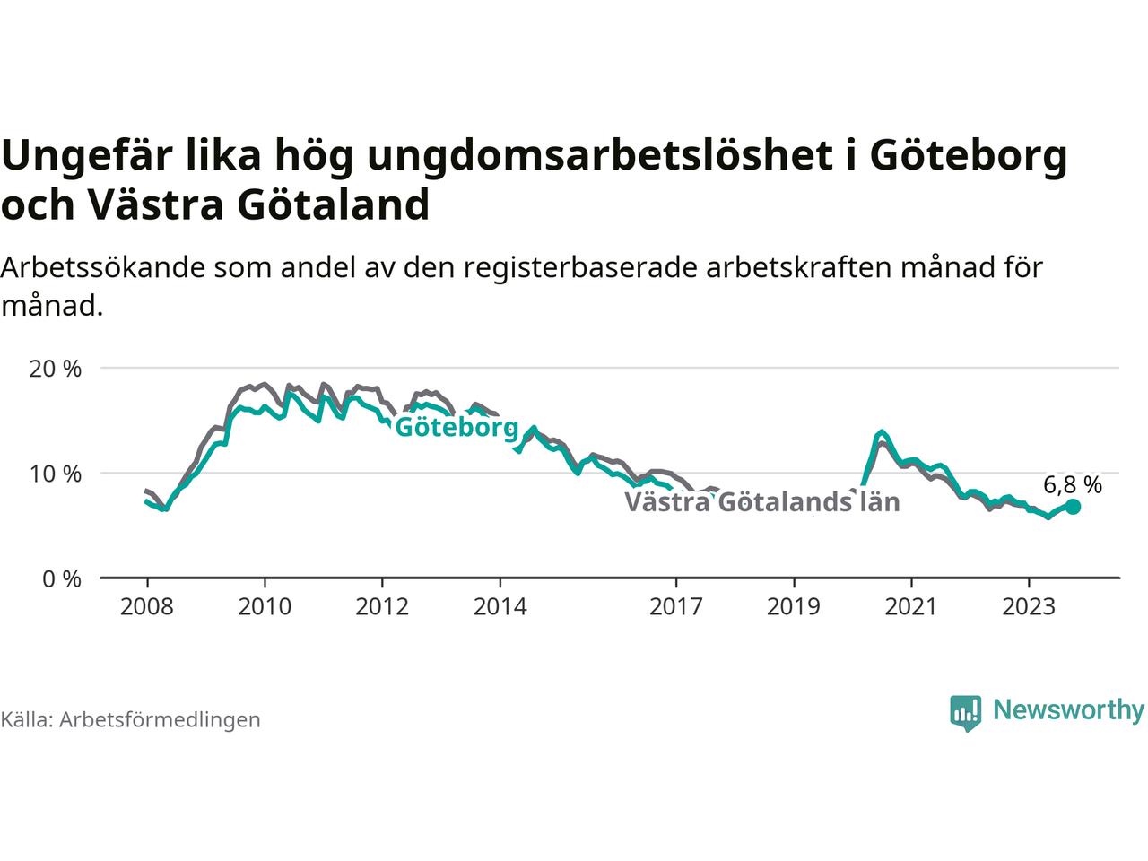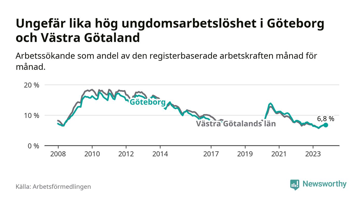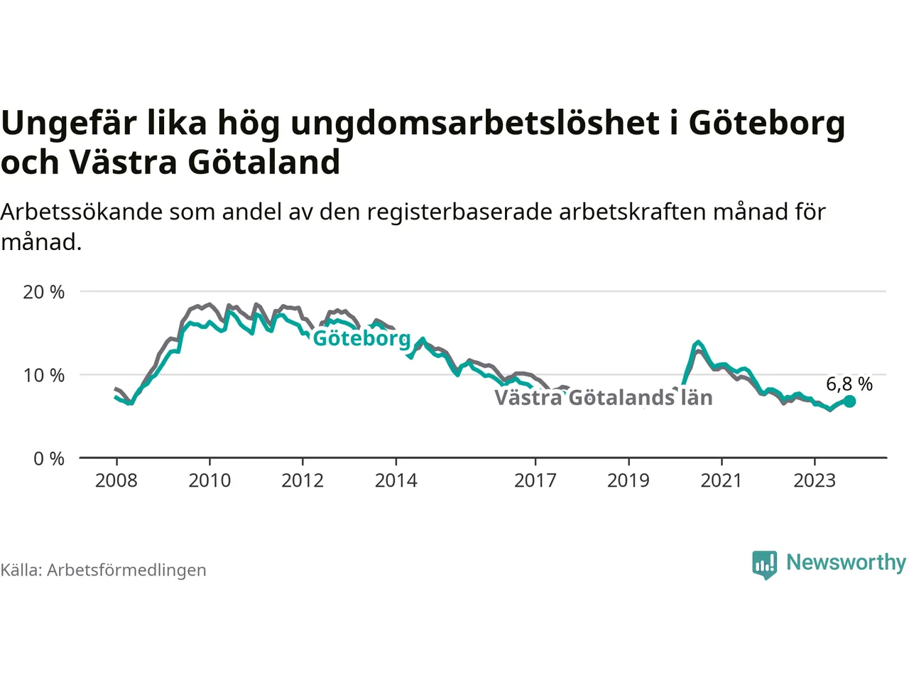 Medan Göteborg har högre total arbetslöshet än Västra Götaland, ligger ungdomsarbetslösheten på i stort sett samma nivå.