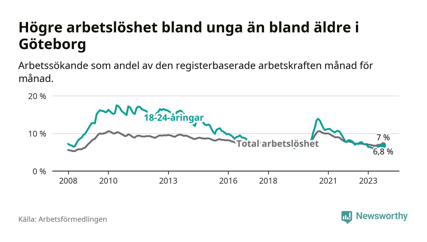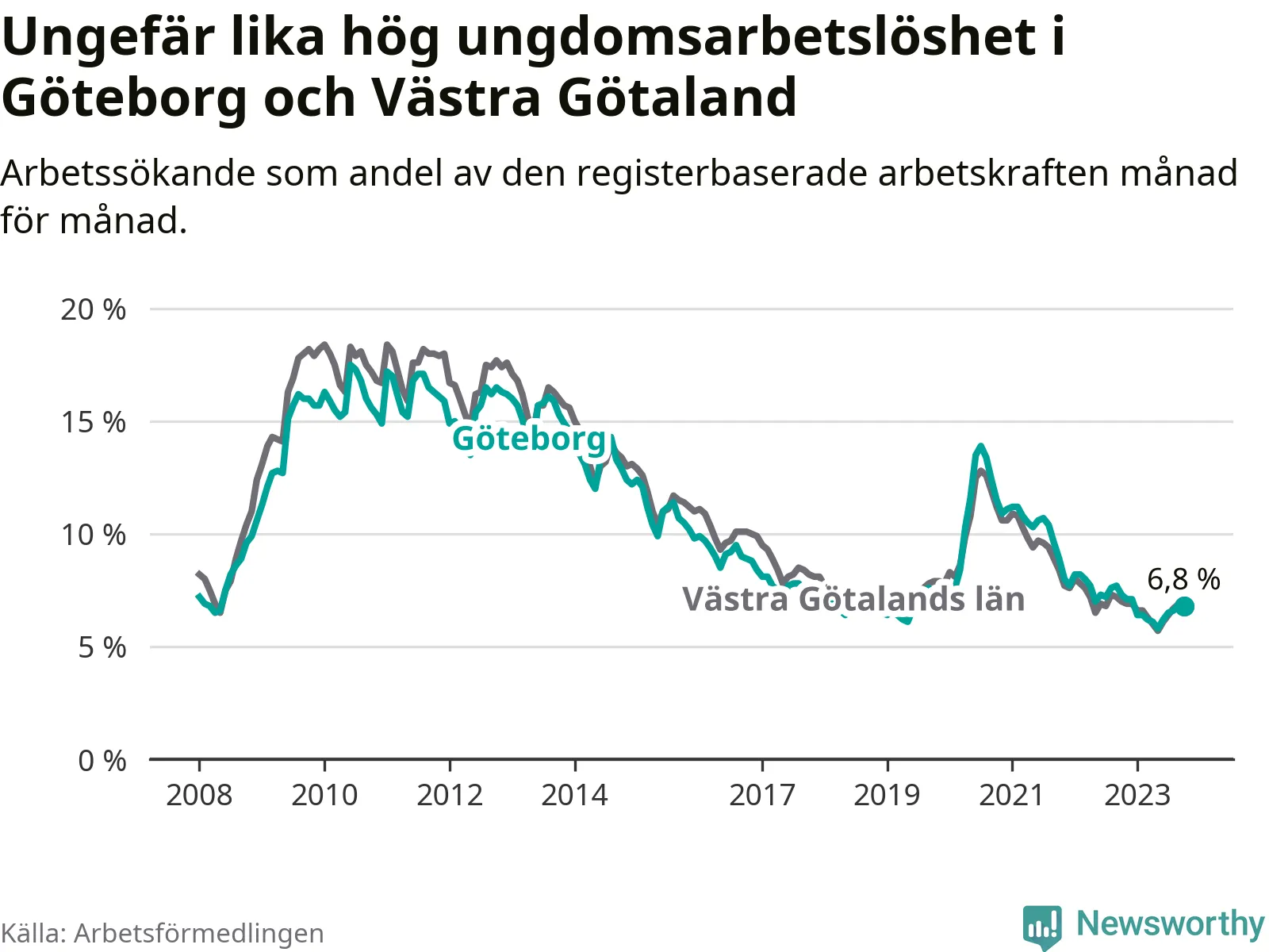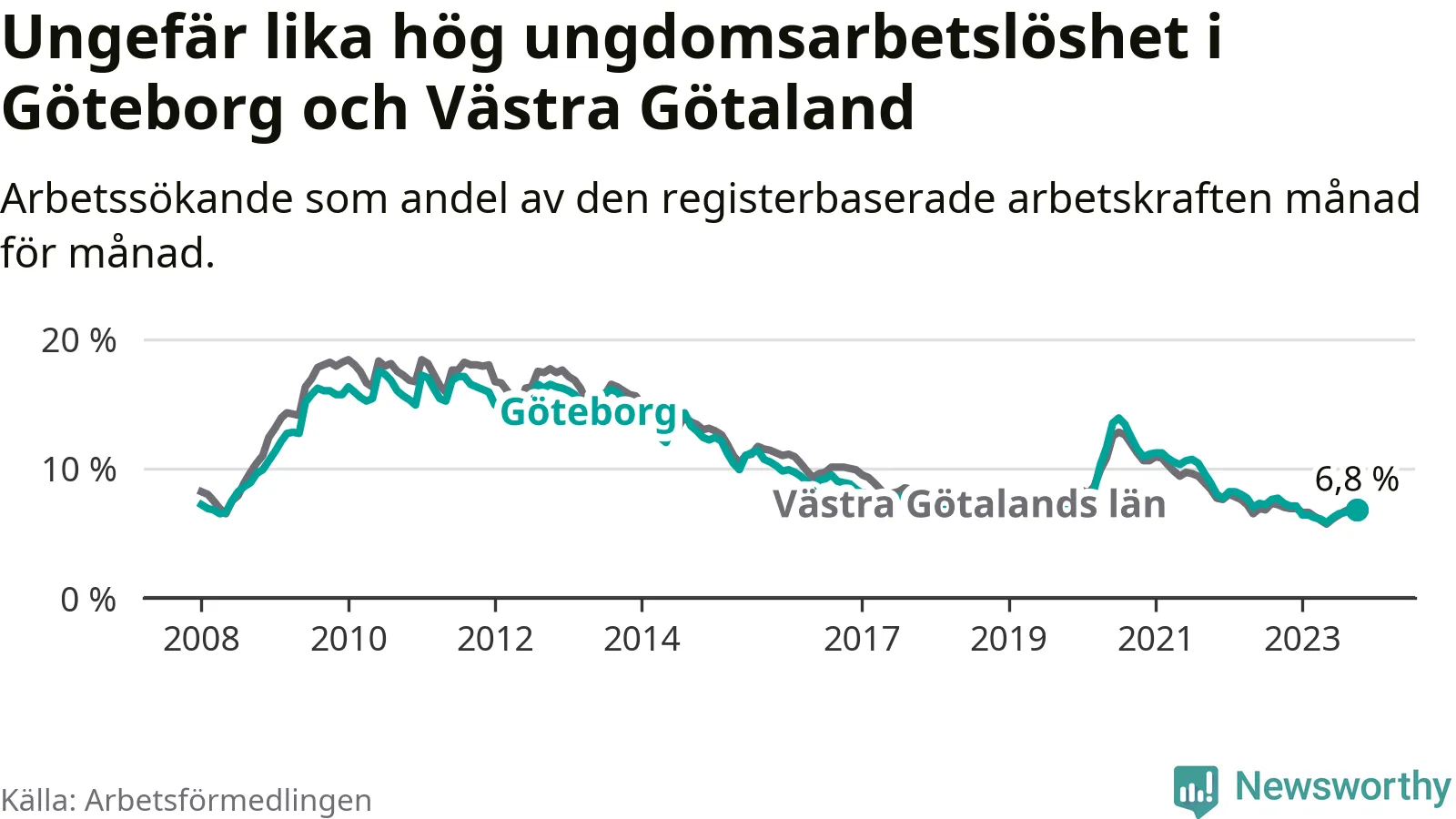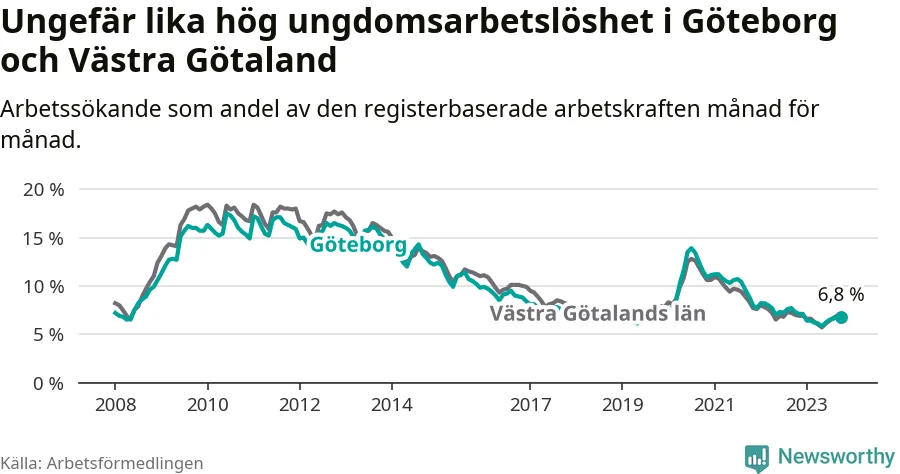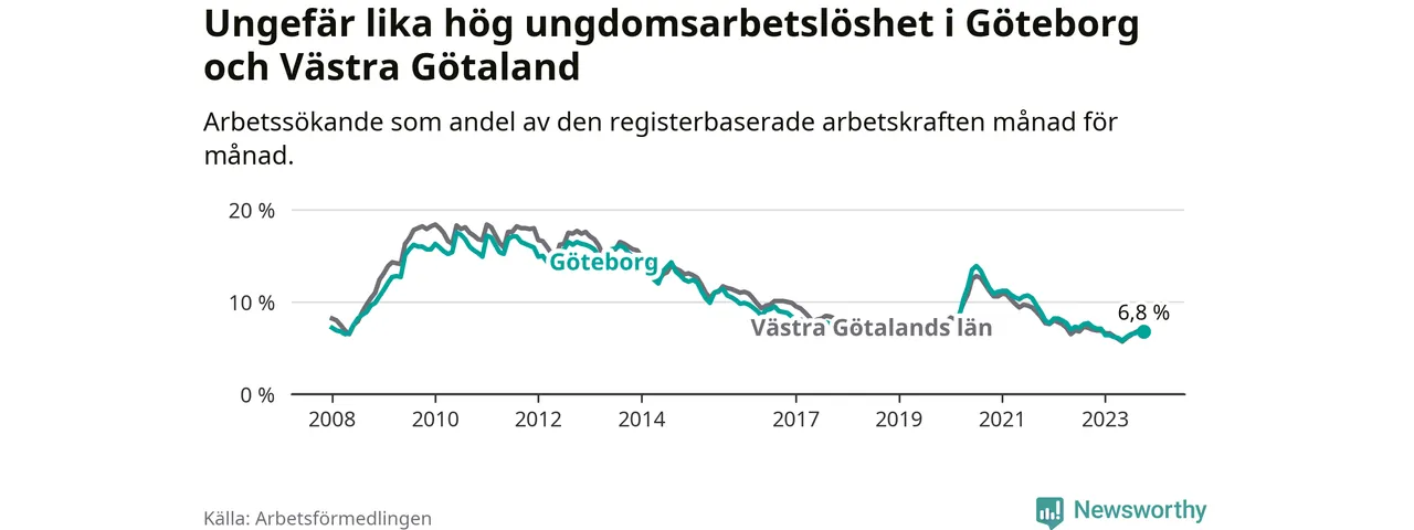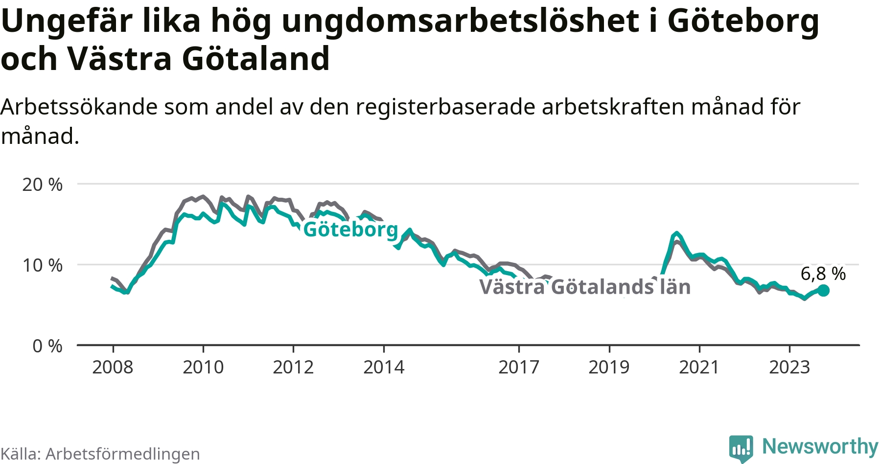 Medan Göteborg har högre total arbetslöshet än Västra Götaland, ligger ungdomsarbetslösheten på i stort sett samma nivå.