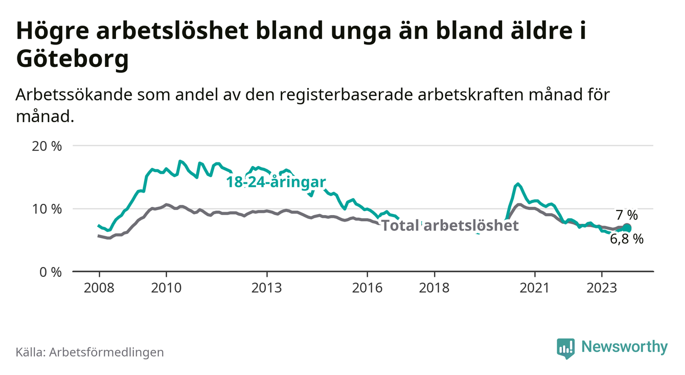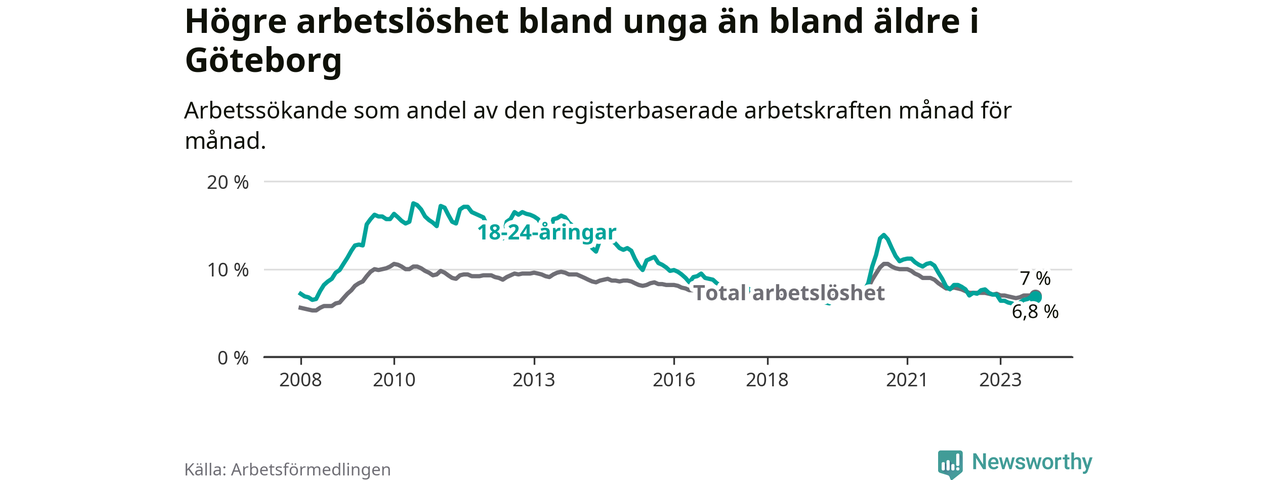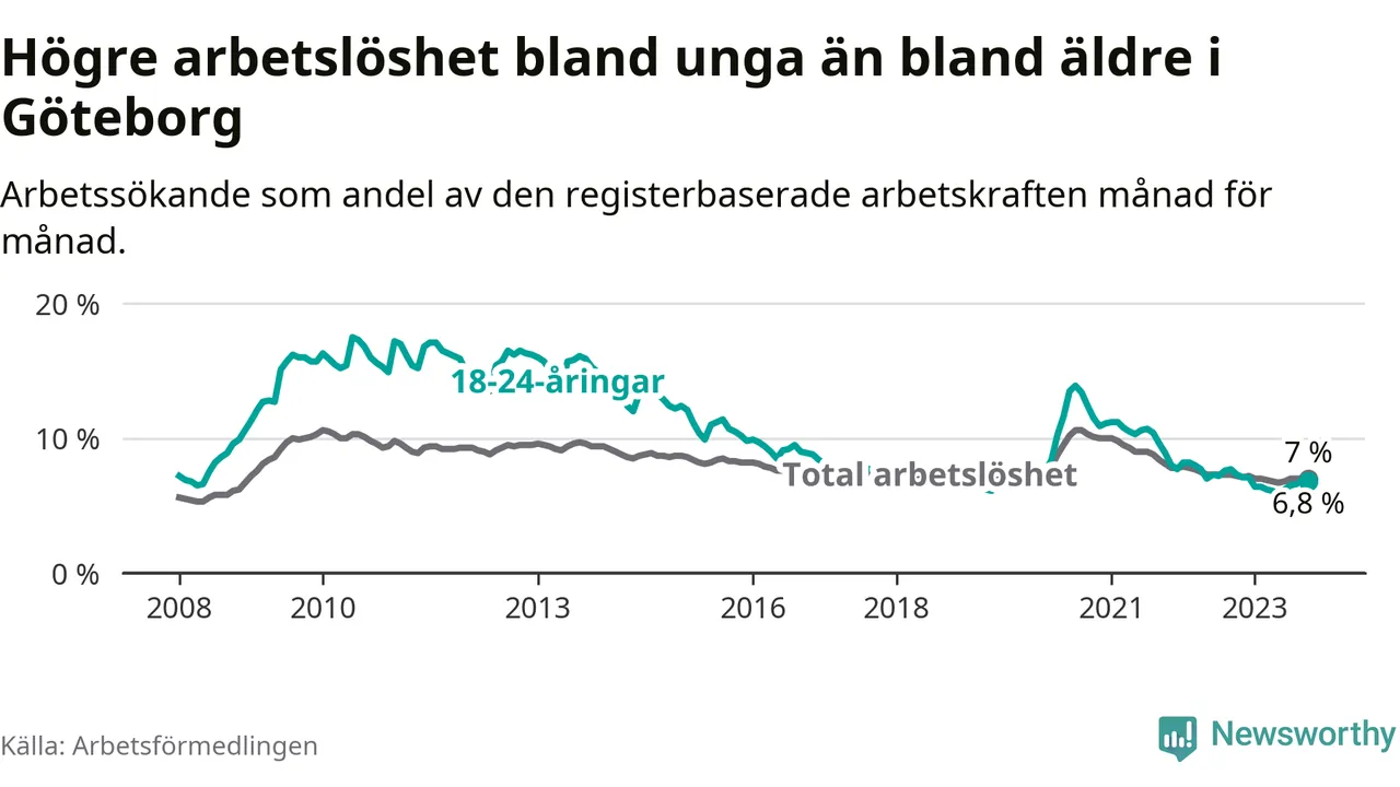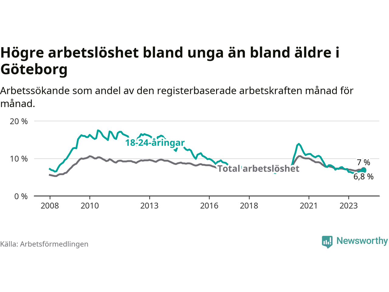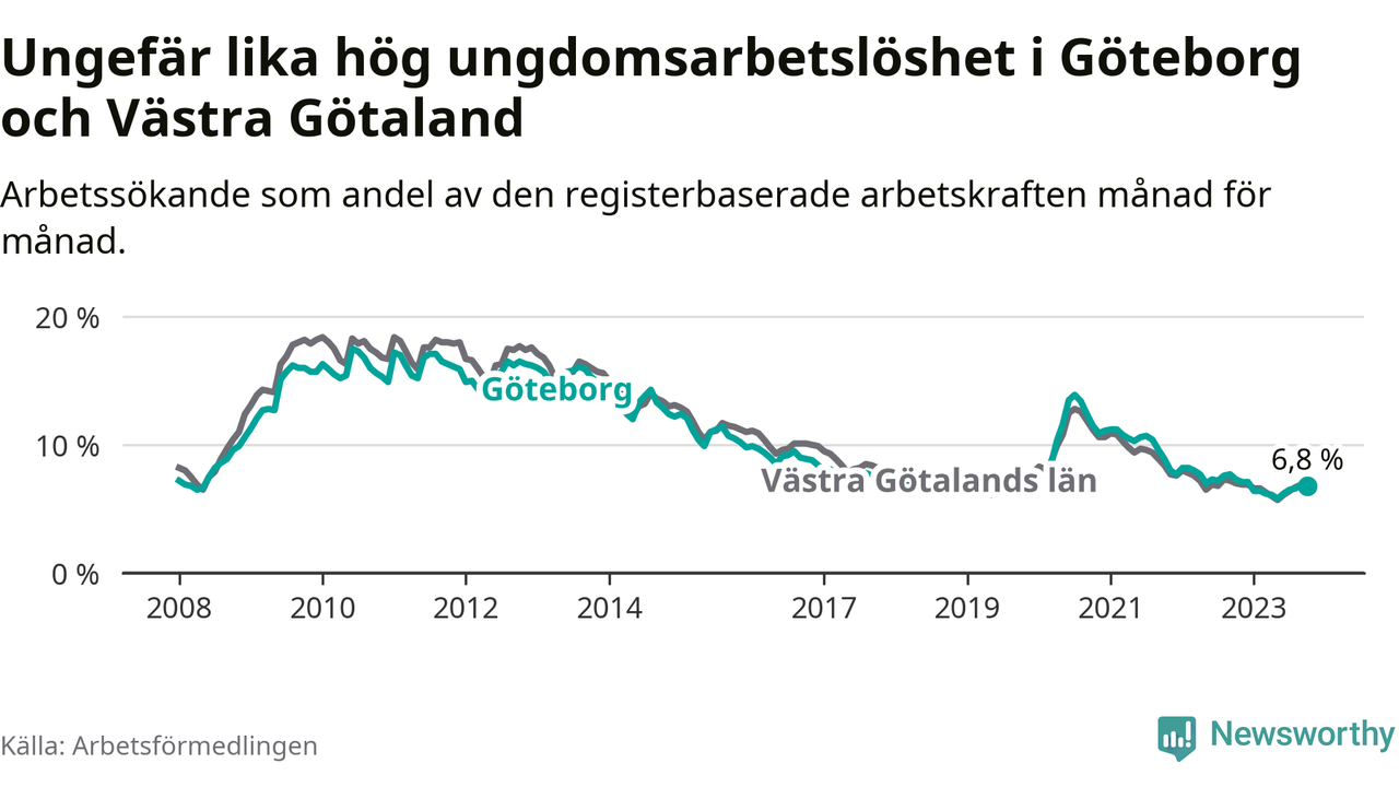 Medan Göteborg har högre total arbetslöshet än Västra Götaland, ligger ungdomsarbetslösheten på i stort sett samma nivå.