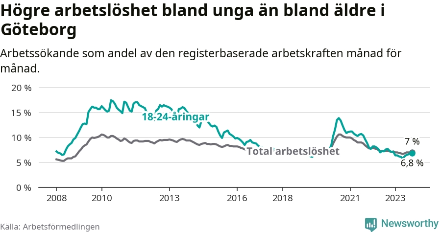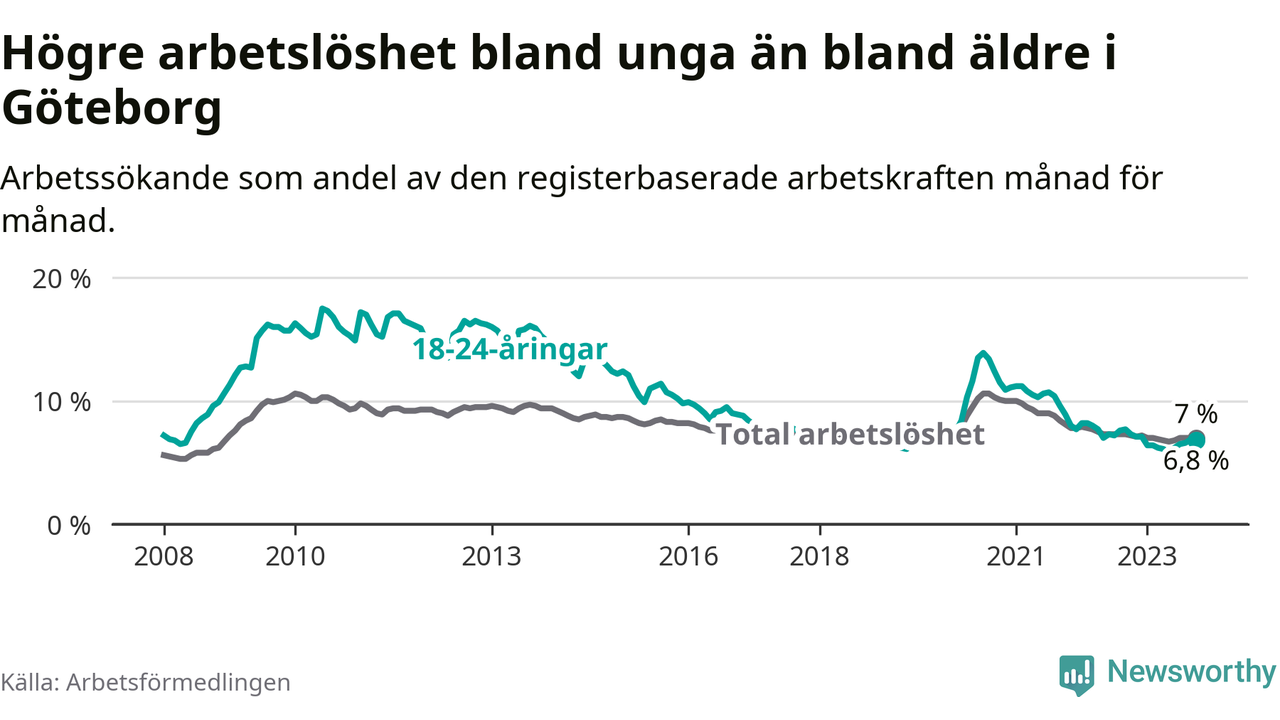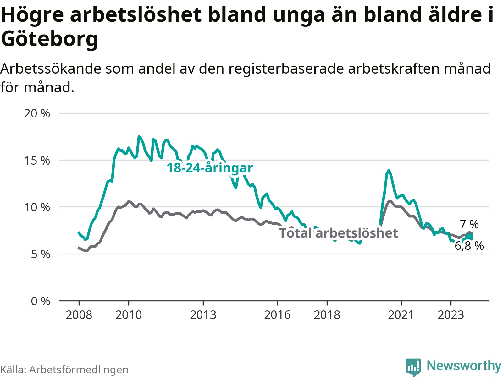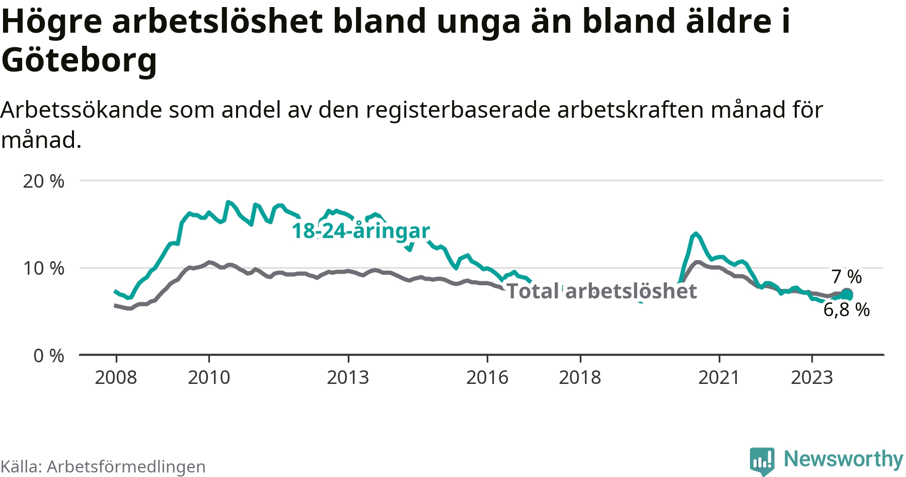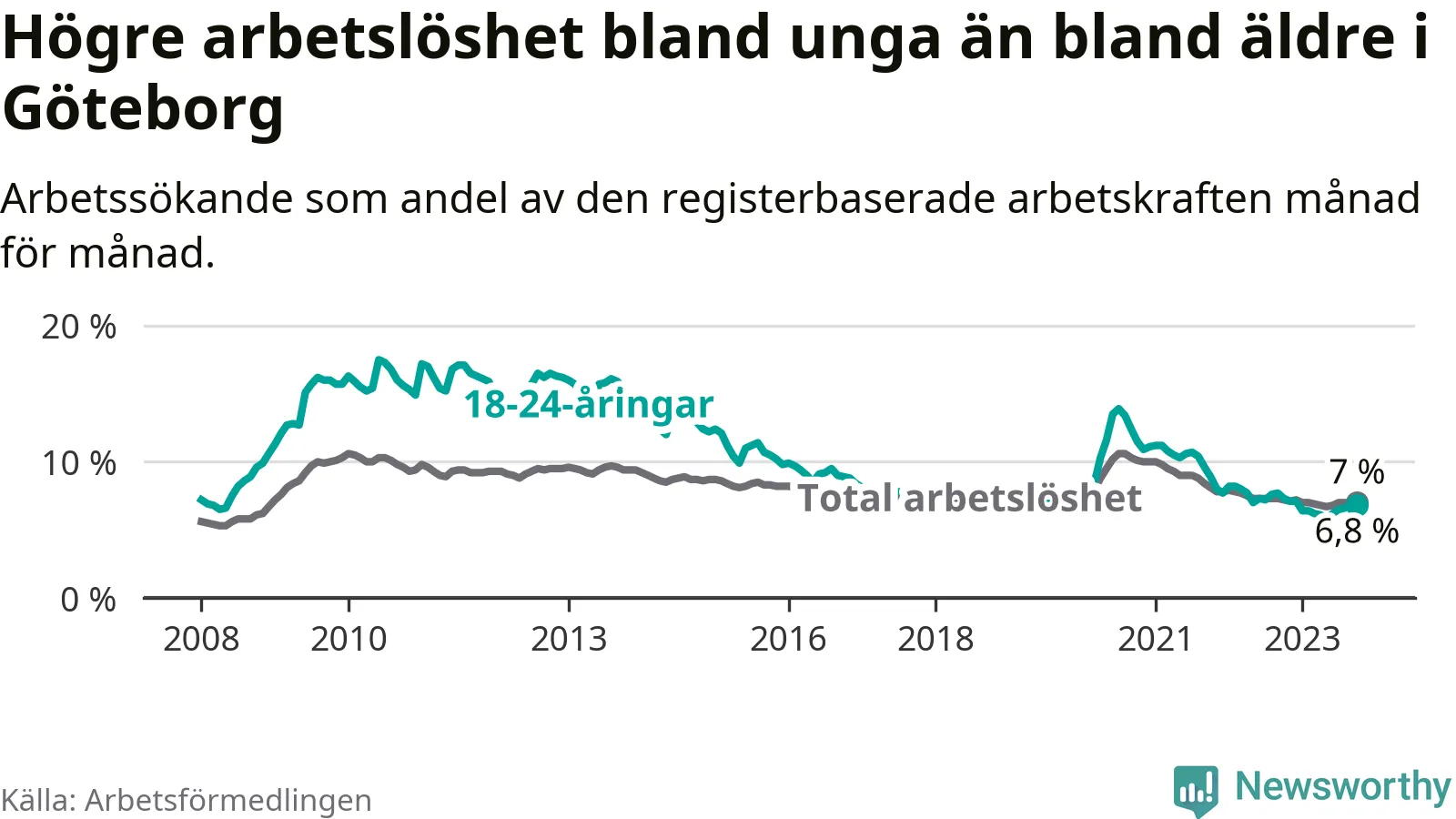Medan Göteborg har högre total arbetslöshet än Västra Götaland, ligger ungdomsarbetslösheten på i stort sett samma nivå.