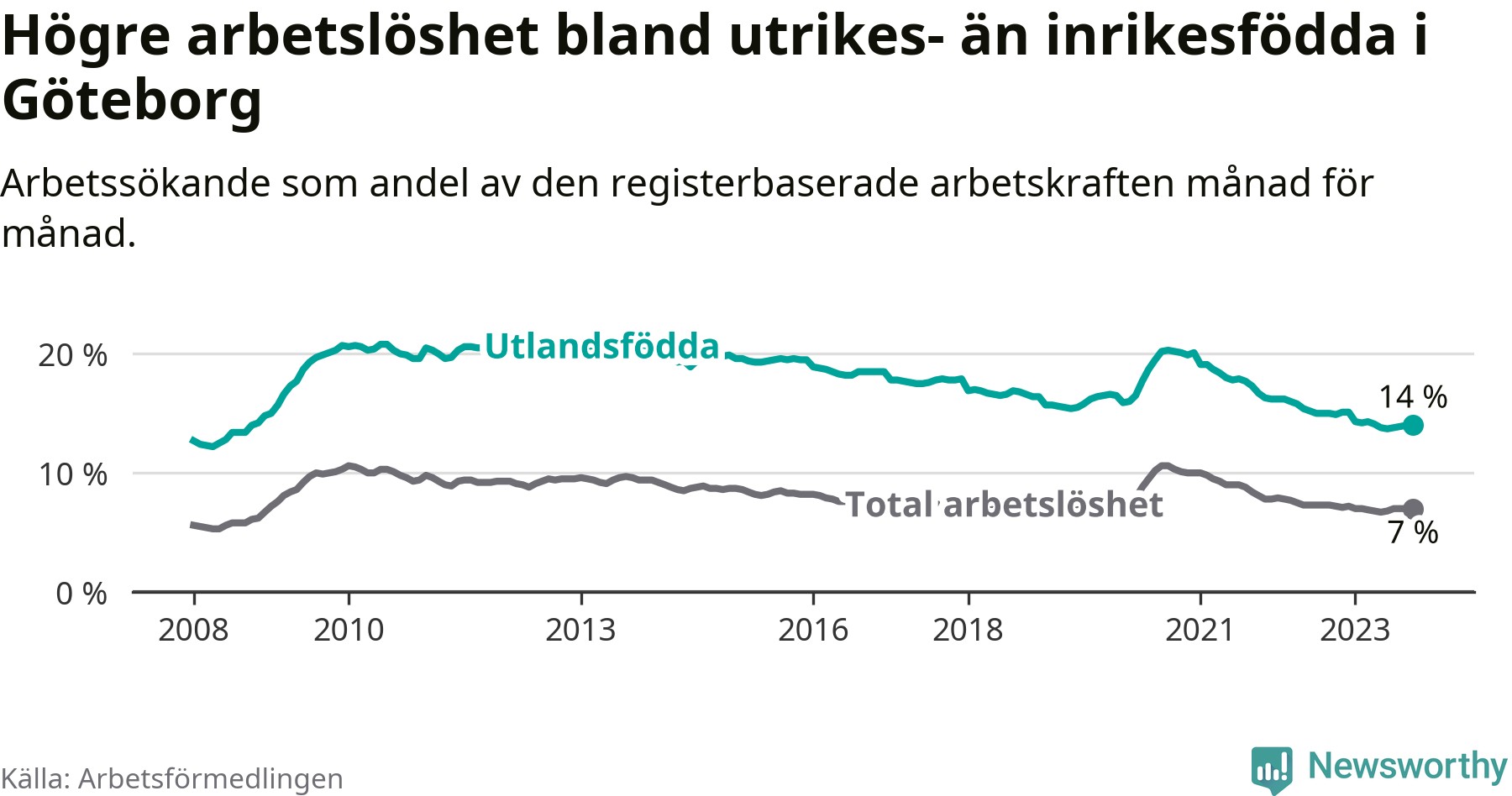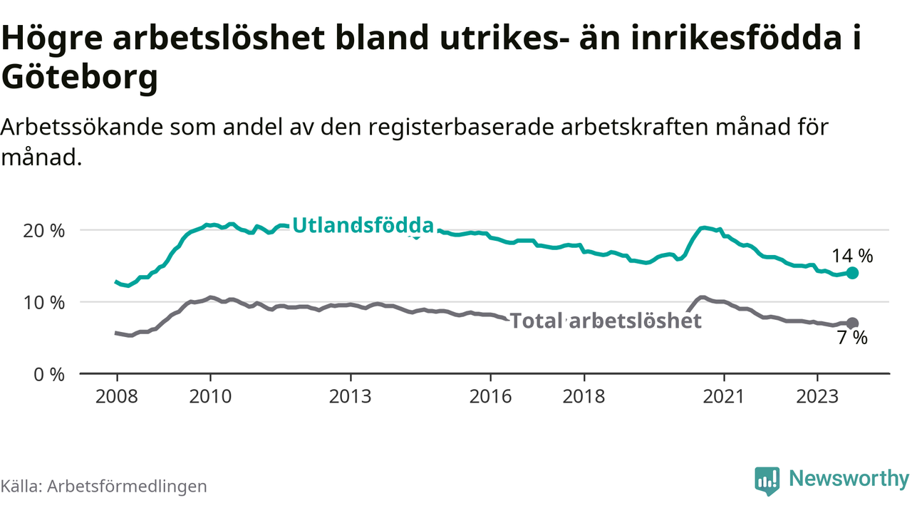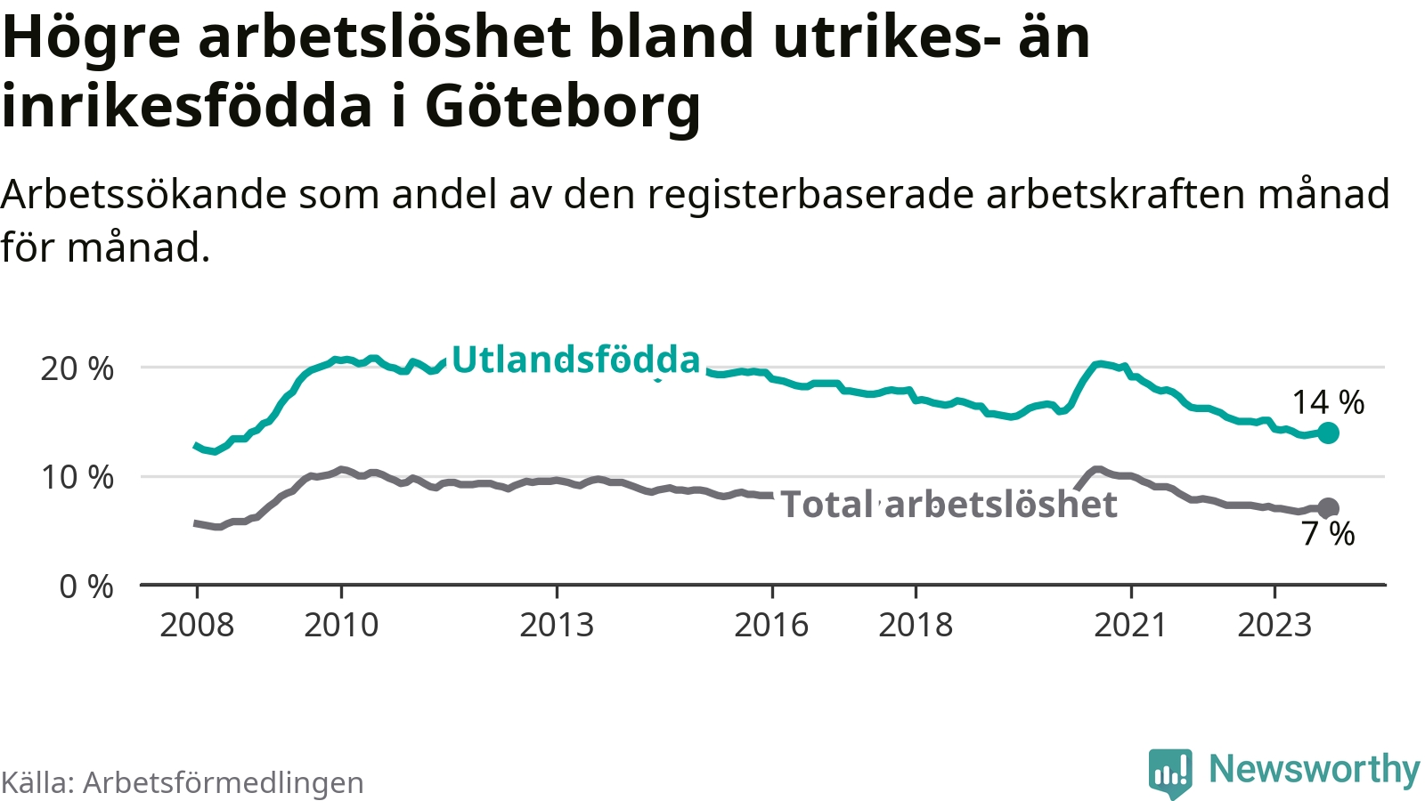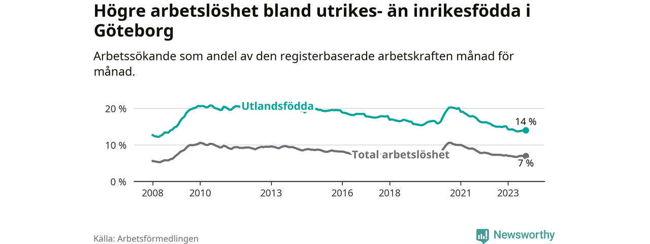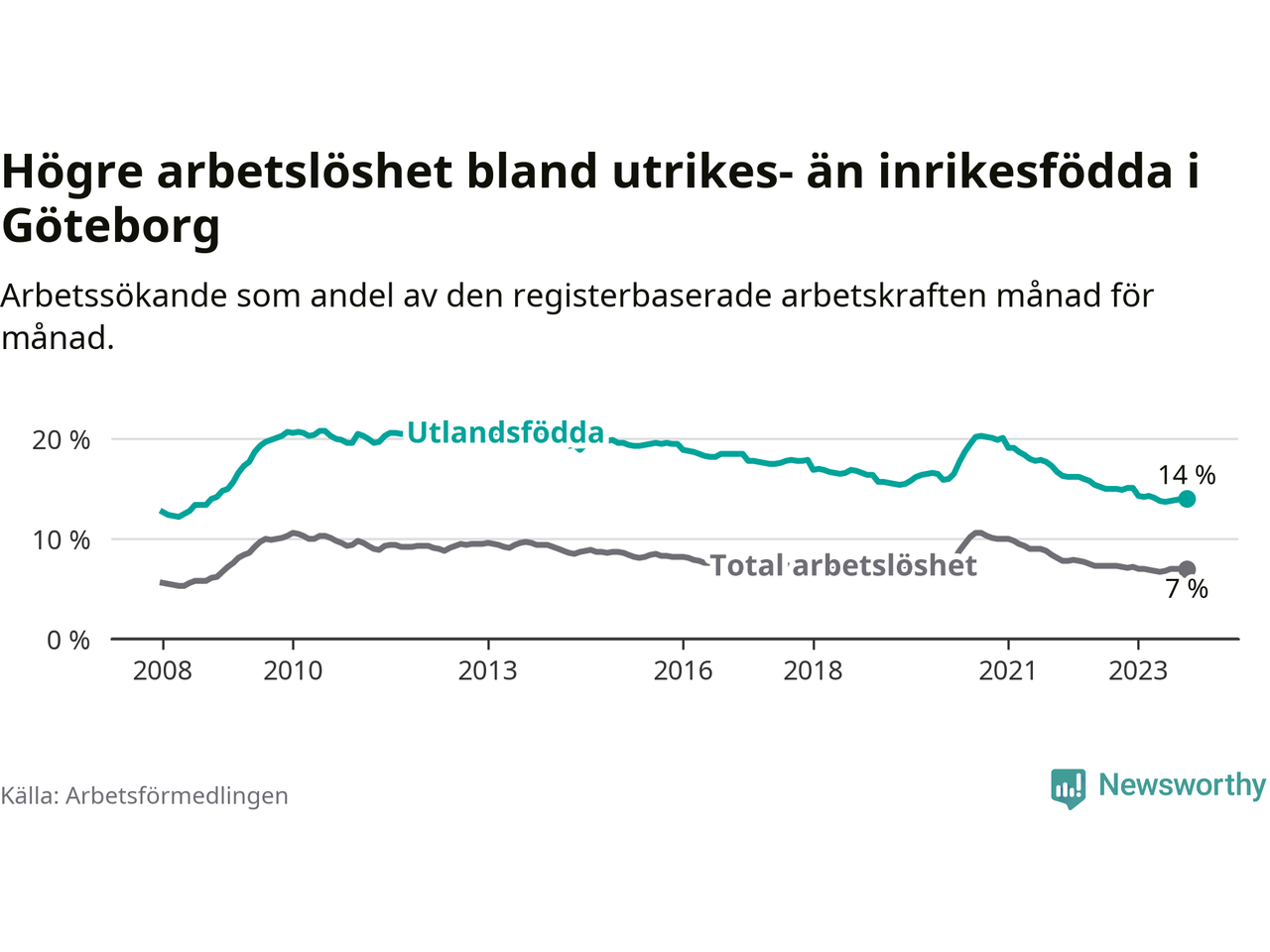 Arbetslösheten bland utlandsfödda var 14,0 procent i Göteborg under oktober månad, motsvarande 14 225 av 101 607 personer. Det är 0,9 procentenheter färre än vid samma tidpunkt i fjol (+20 om man räknar personer). Därmed har de utlandsföddas arbetslöshet varit lägre än vid samma tidpunkt i fjol i över två år i sträck. Sedan april 2021 har arbetslösheten bland utlandsfödda minskat från 18,4 till 14,0 procent.