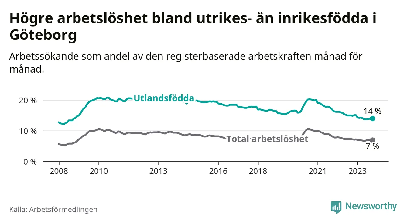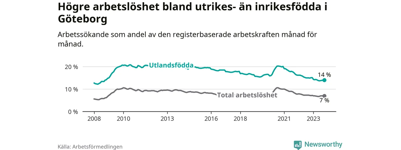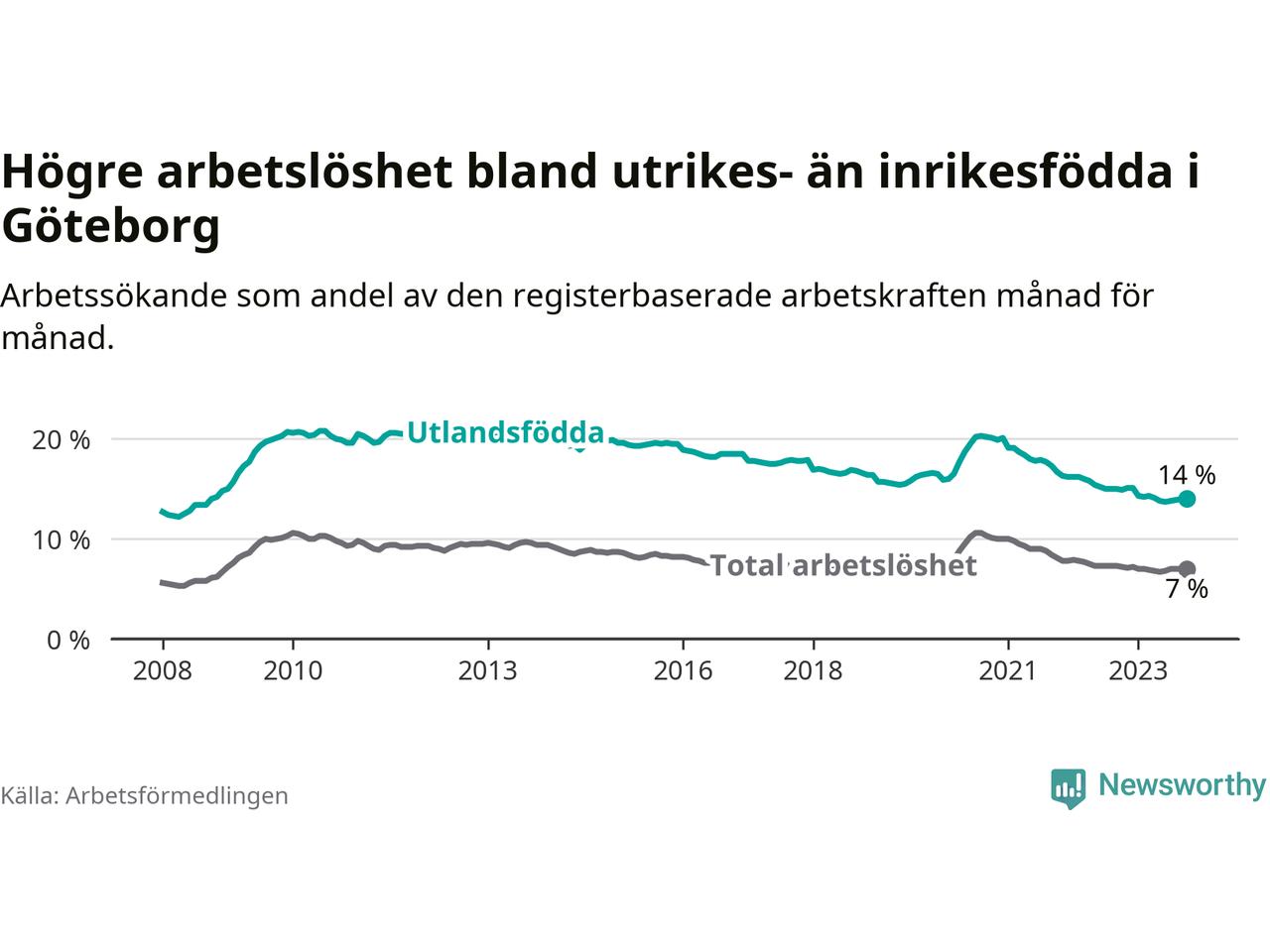 Skillnaden i arbetslöshet mellan utrikesfödda och hela befolkningen är 7,0 procentenheter i Göteborg. Det är en mindre skillnad än för ett år sedan (−0,7 procentenheter).