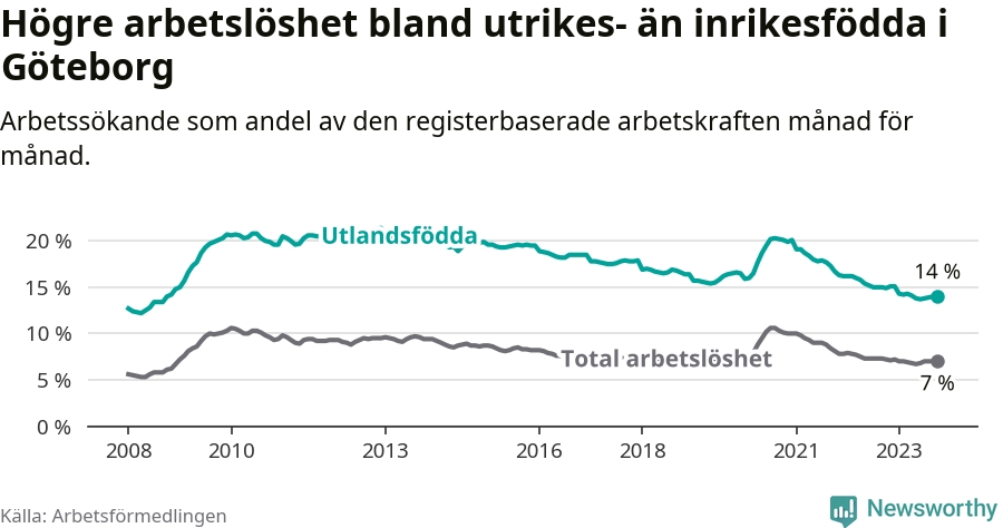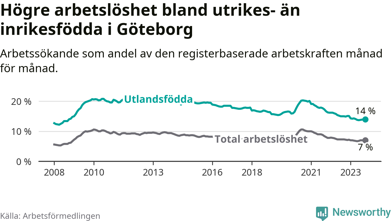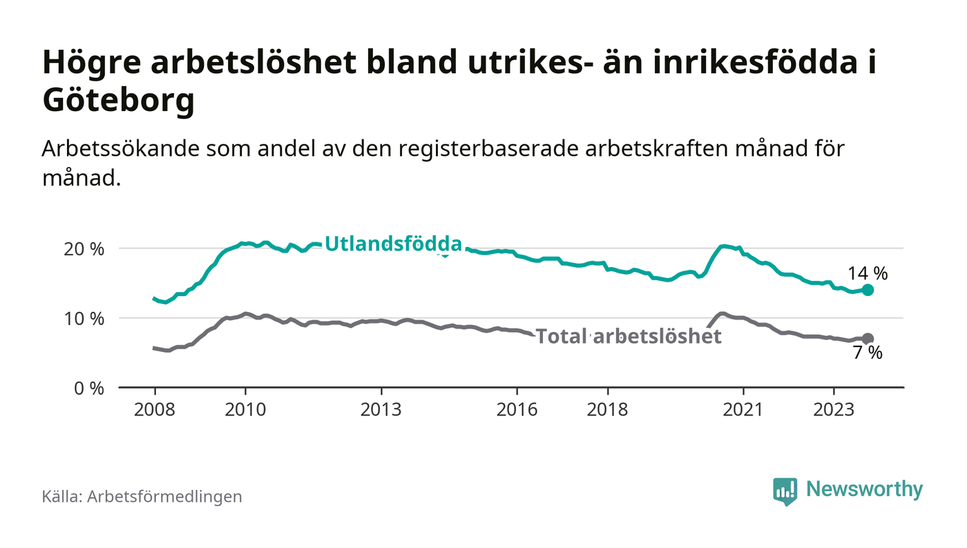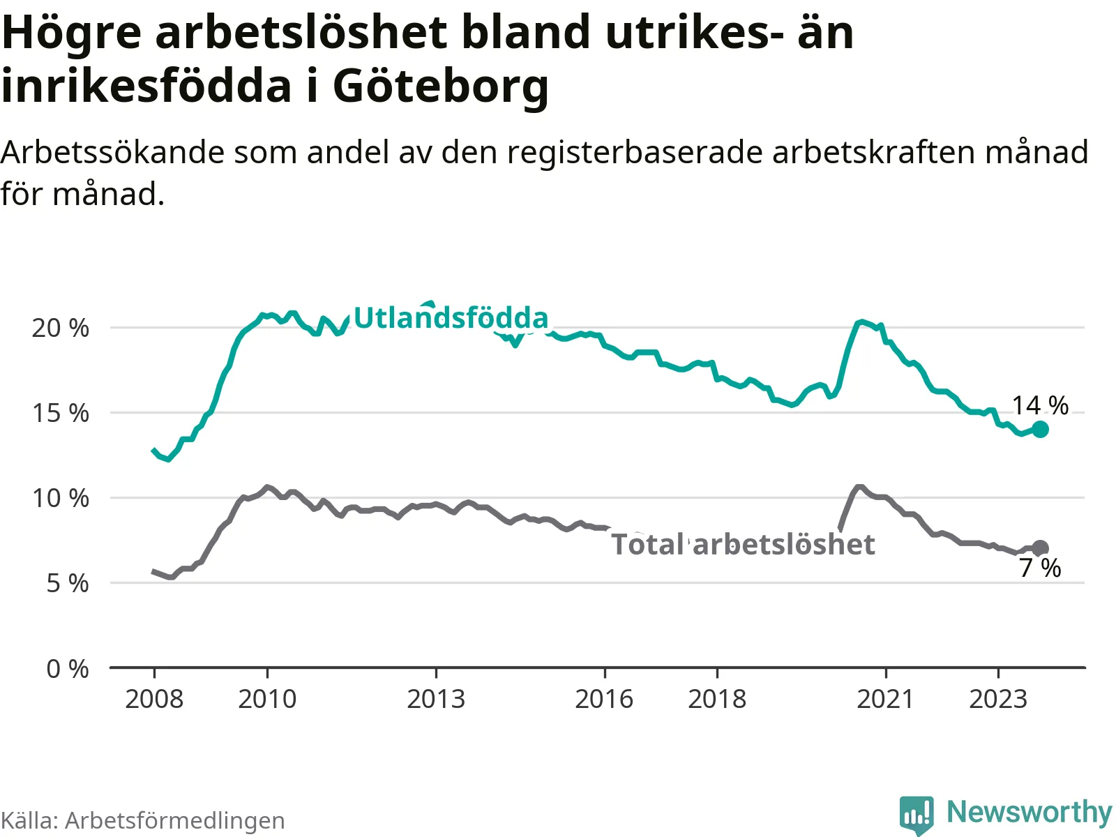 Skillnaden i arbetslöshet mellan utrikesfödda och hela befolkningen är 7,0 procentenheter i Göteborg. Det är en mindre skillnad än för ett år sedan (−0,7 procentenheter).