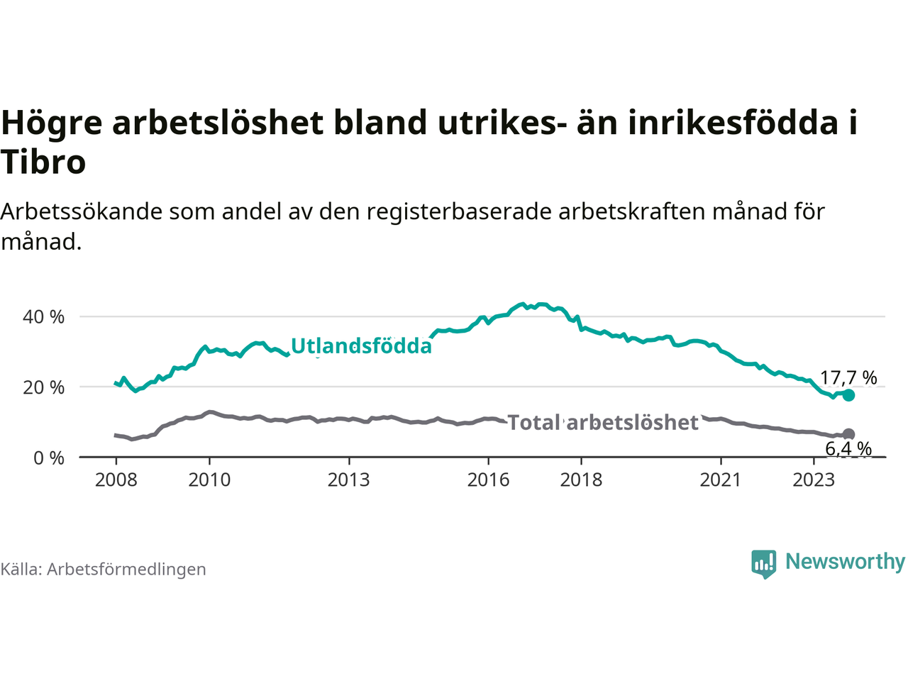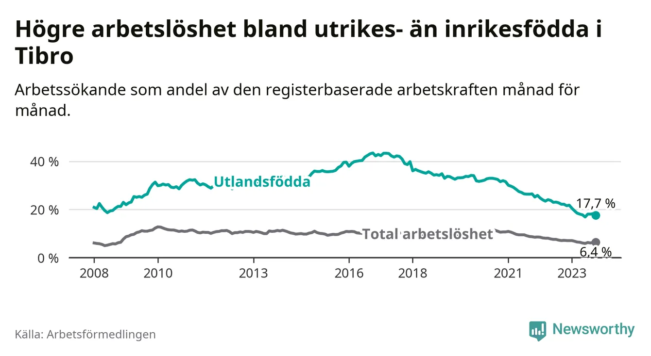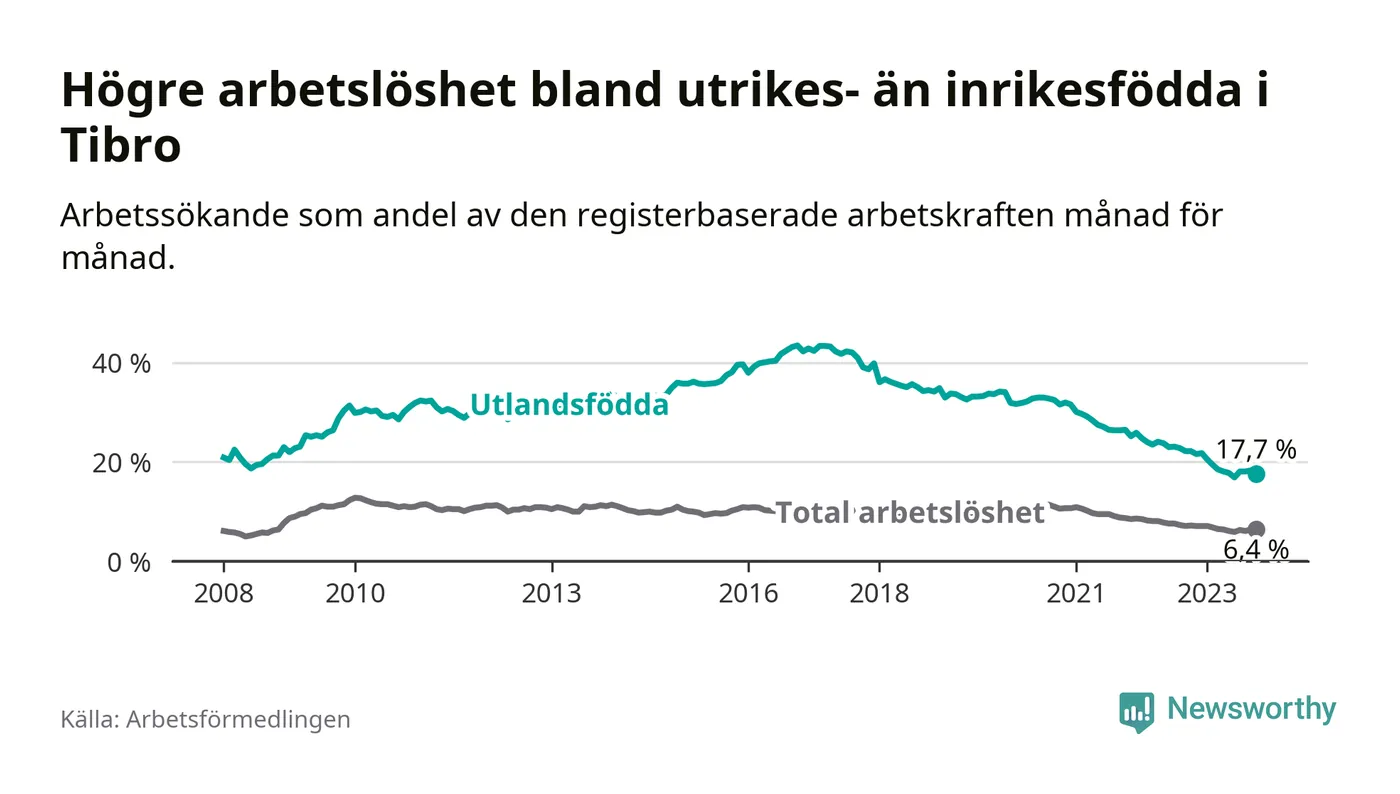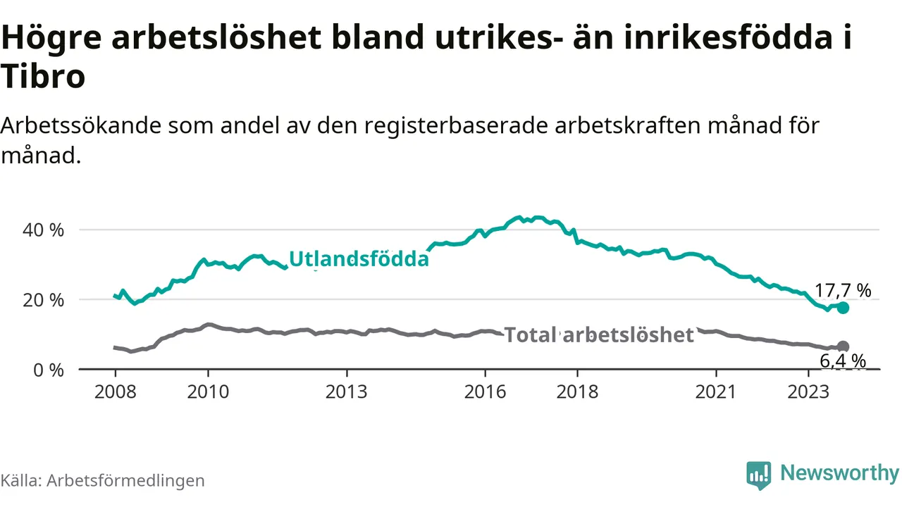 Skillnaden i arbetslöshet mellan utrikesfödda och hela befolkningen är 11,3 procentenheter i Tibro. Det är en betydligt mindre skillnad än för ett år sedan (−3,7 procentenheter).
