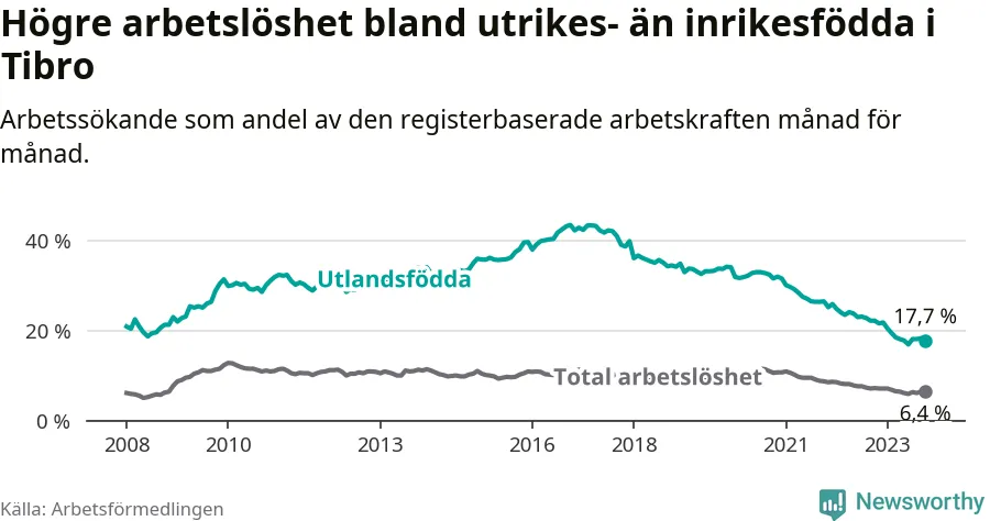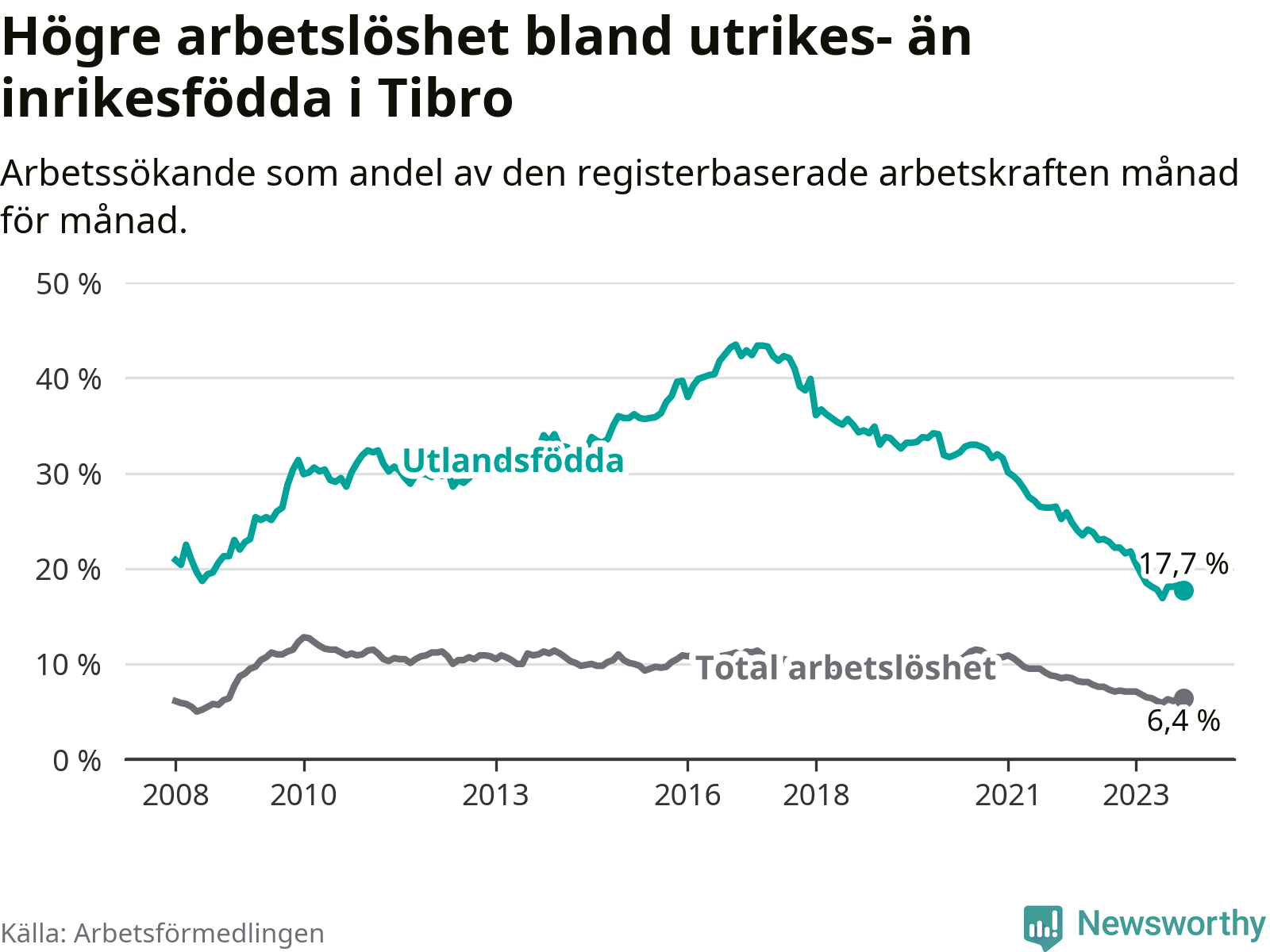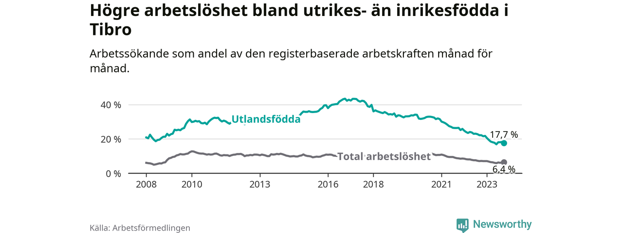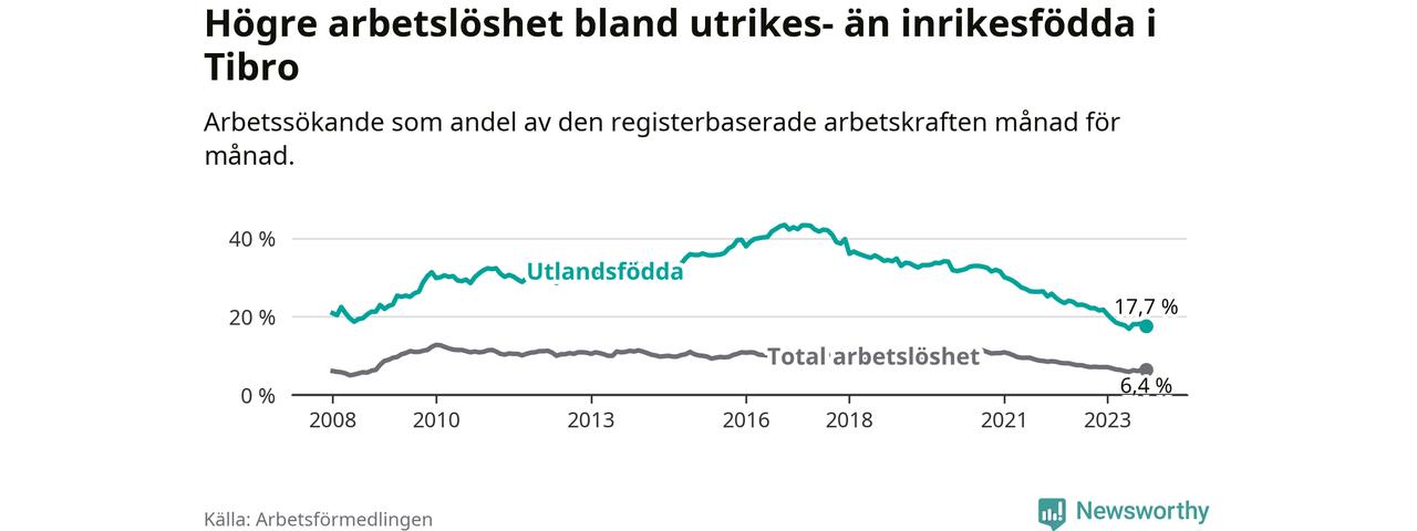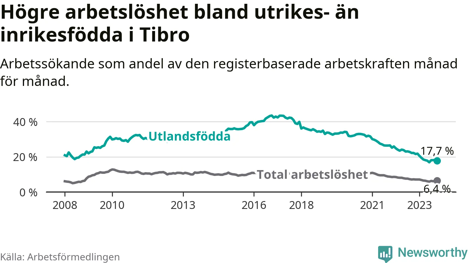Skillnaden i arbetslöshet mellan utrikesfödda och hela befolkningen är 11,3 procentenheter i Tibro. Det är en betydligt mindre skillnad än för ett år sedan (−3,7 procentenheter).