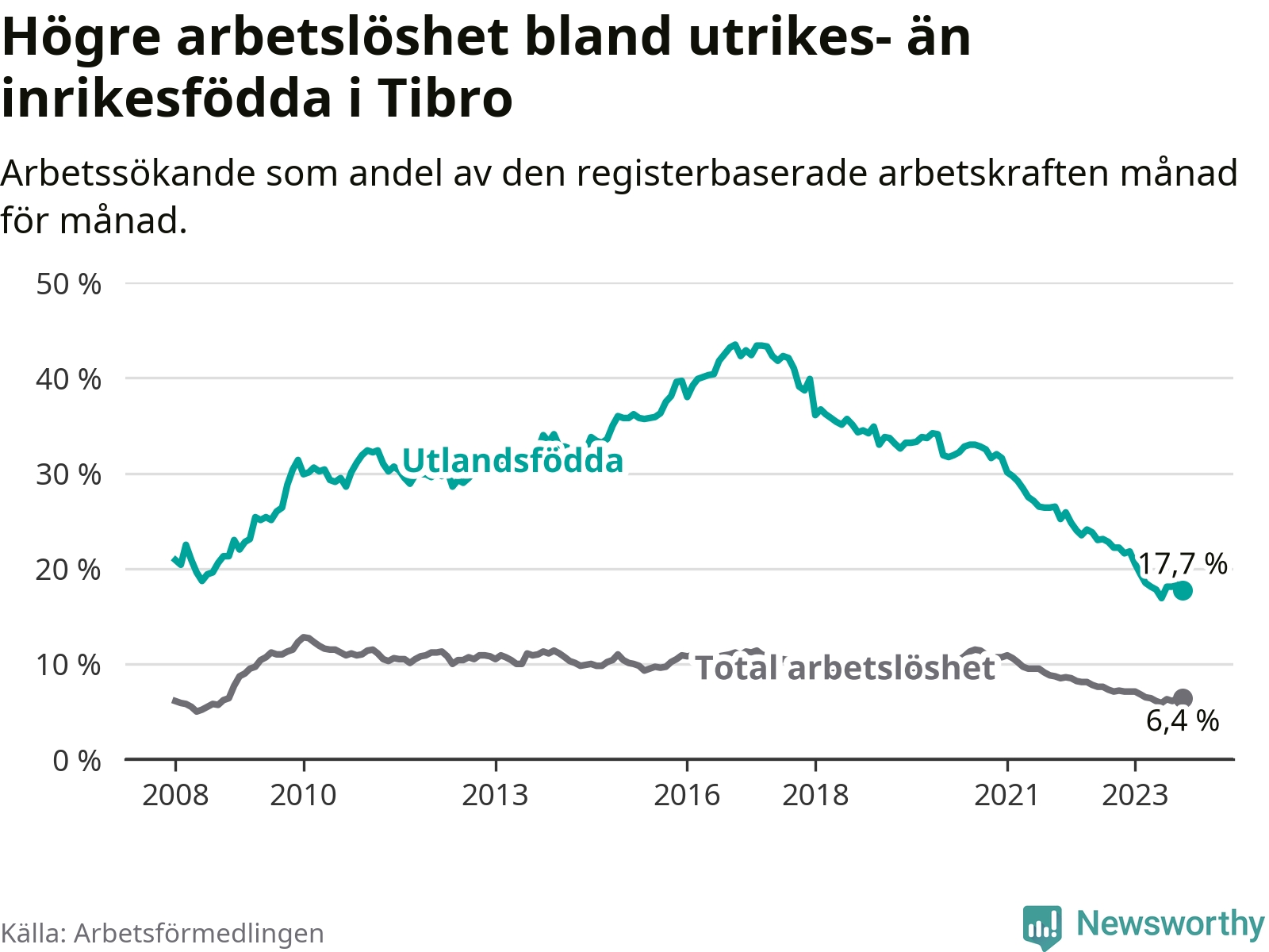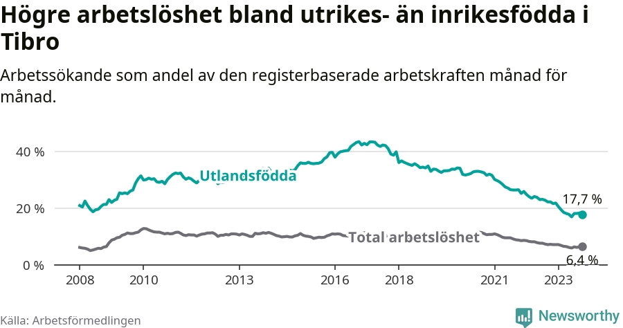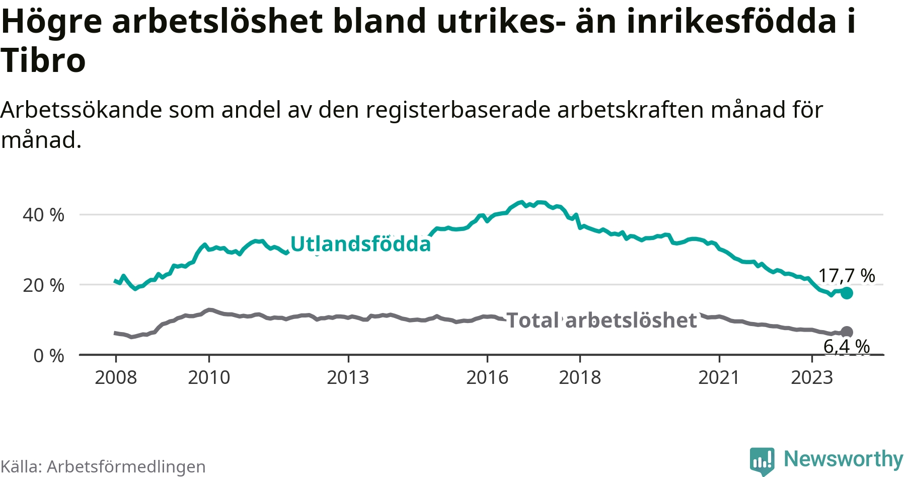 Arbetslösheten bland utlandsfödda var 17,7 procent i Tibro under oktober månad, motsvarande 183 av 1 034 personer. Det är 4,5 procentenheter färre än vid samma tidpunkt i fjol (−33 om man räknar personer). Därmed har de utlandsföddas arbetslöshet varit lägre än vid samma tidpunkt i fjol i över tre år i sträck. Sedan maj 2020 har arbetslösheten bland utlandsfödda minskat från 32,8 till 17,7 procent.