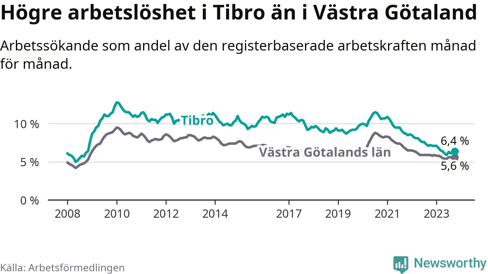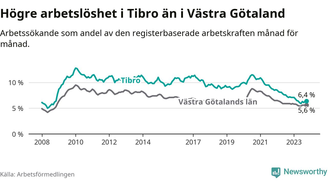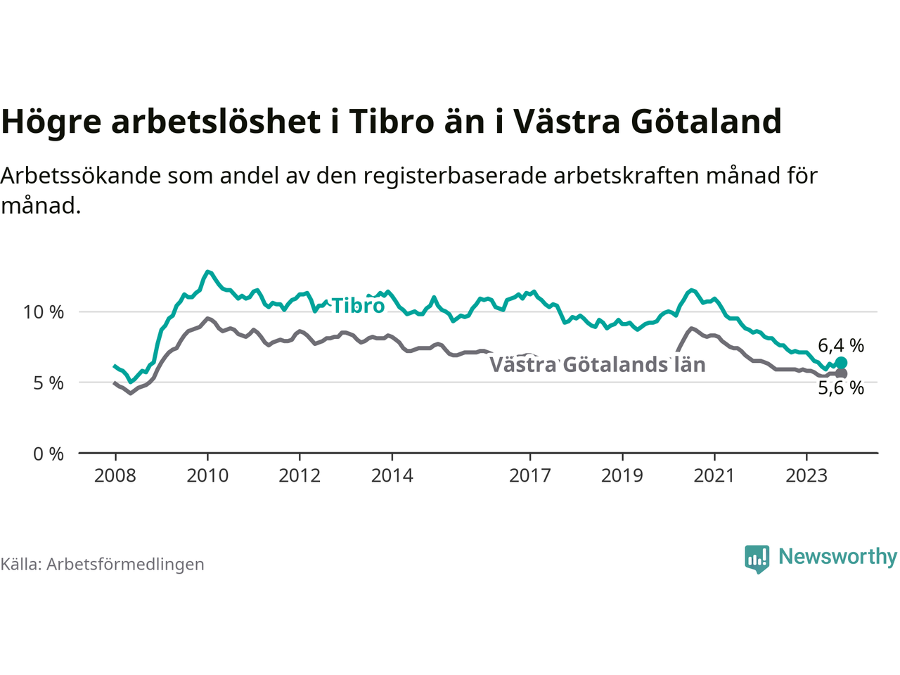 Graf: Arbetslöshet i Tibro kommun och Västra Götalands län