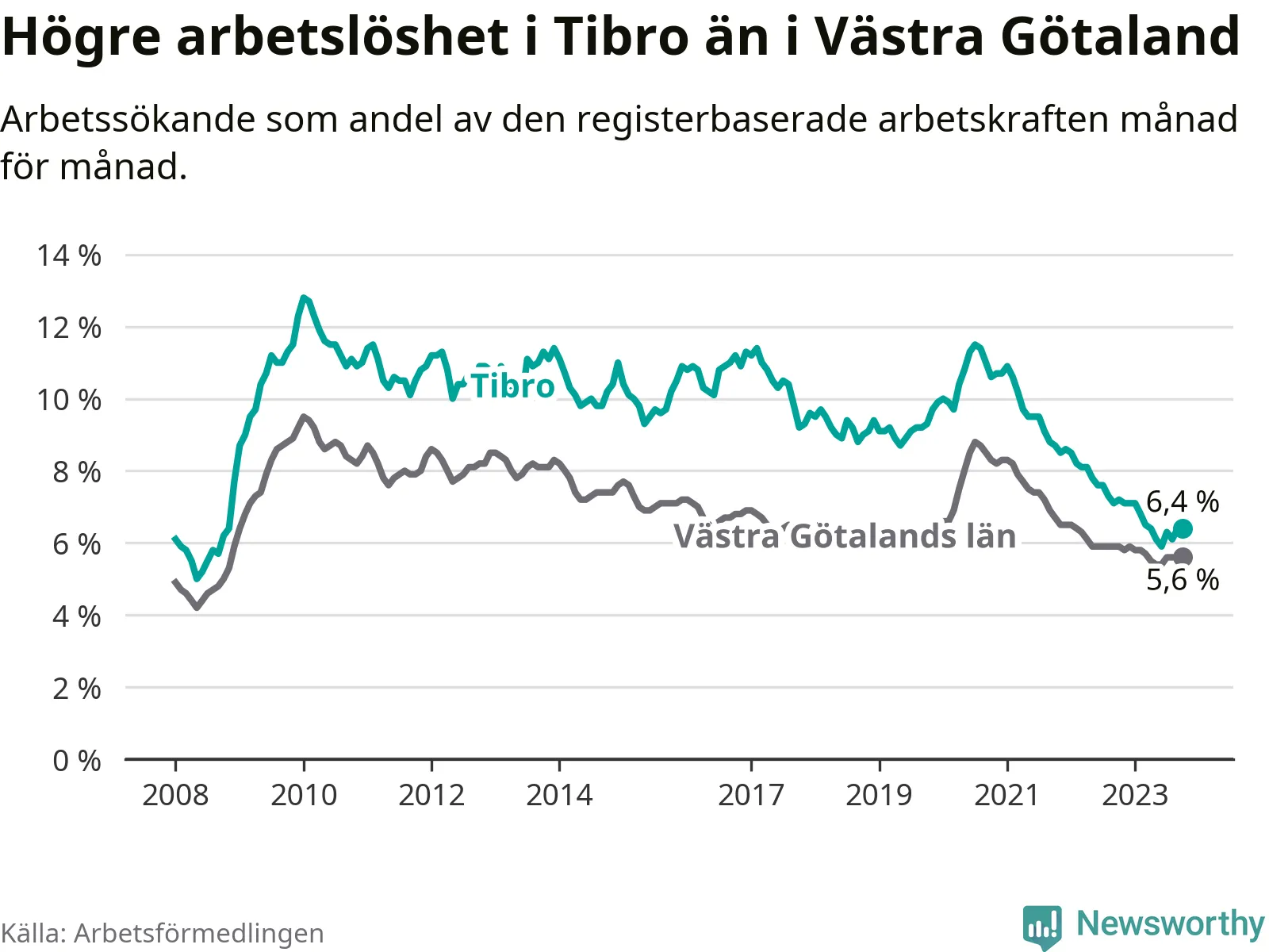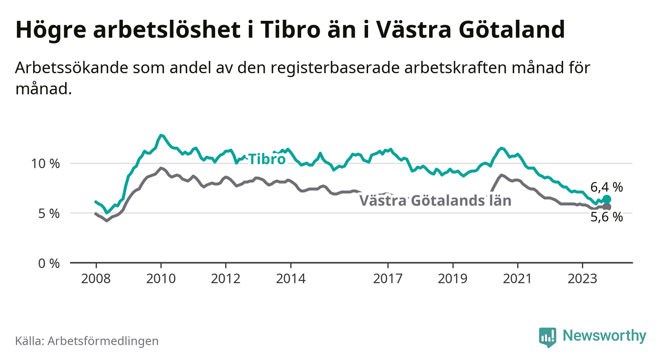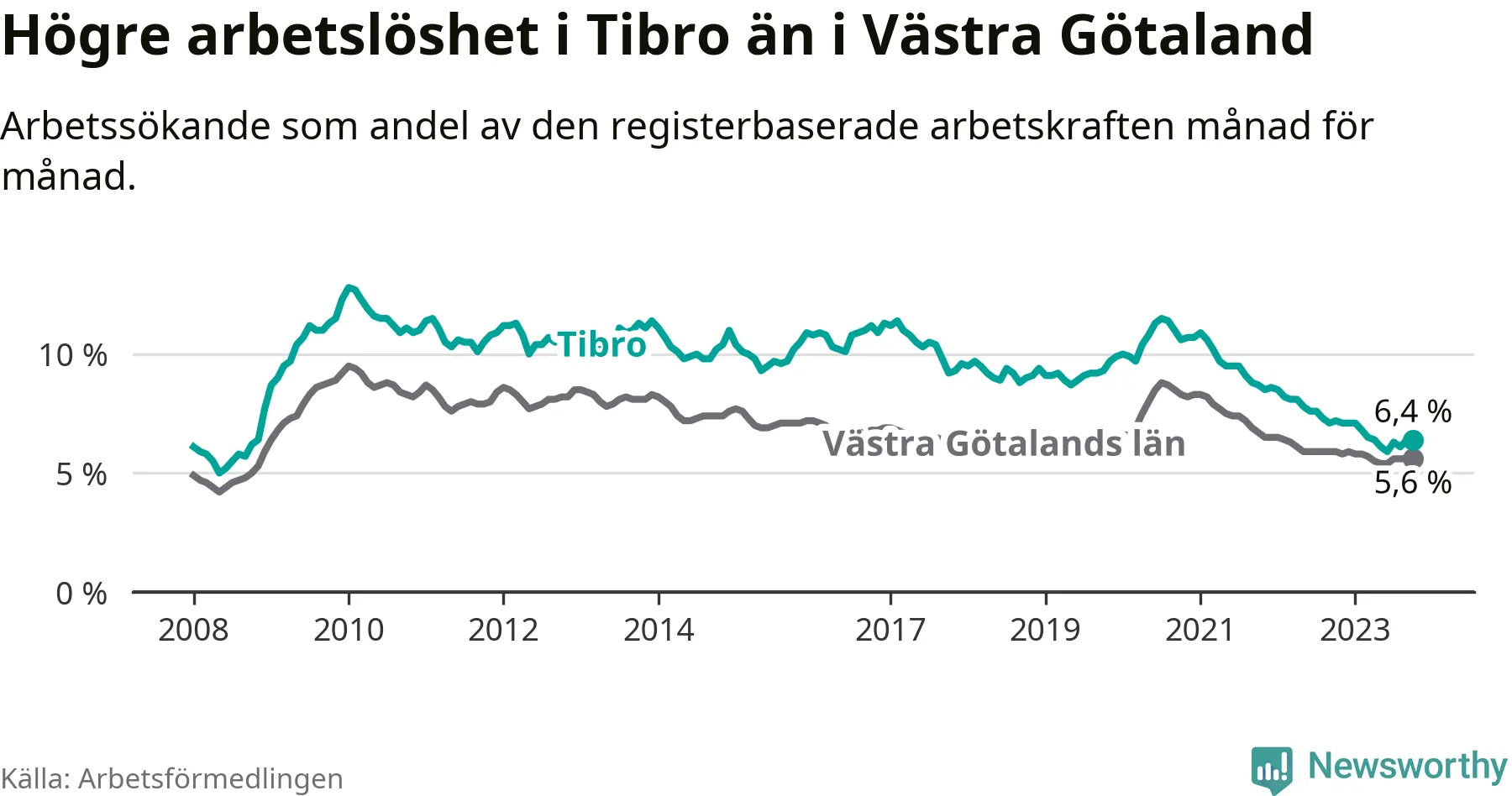 Graf: Arbetslöshet i Tibro kommun och Västra Götalands län