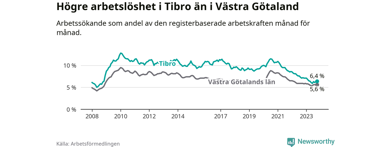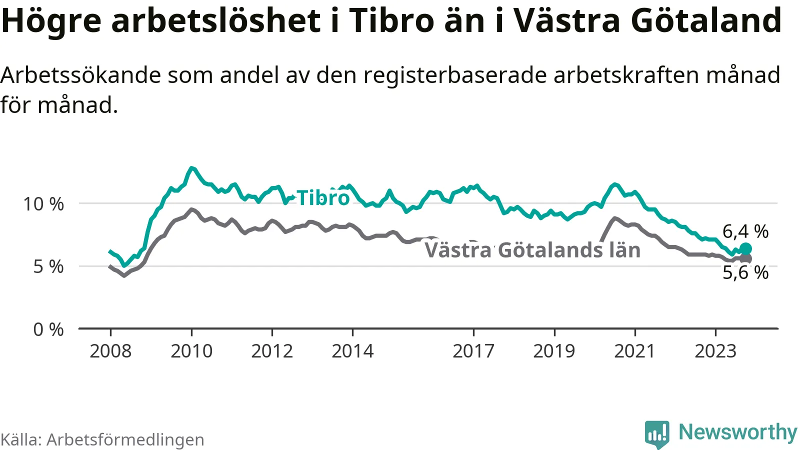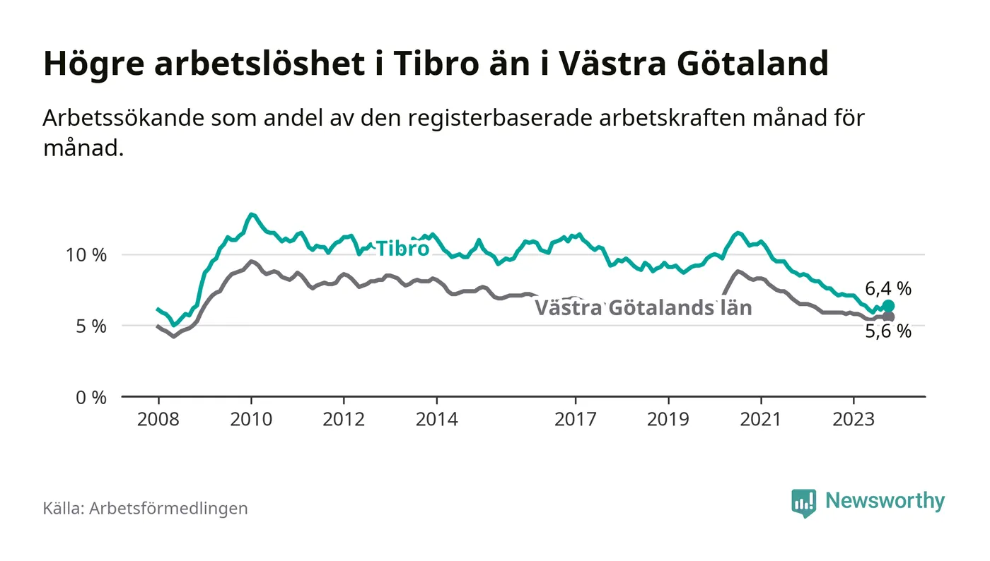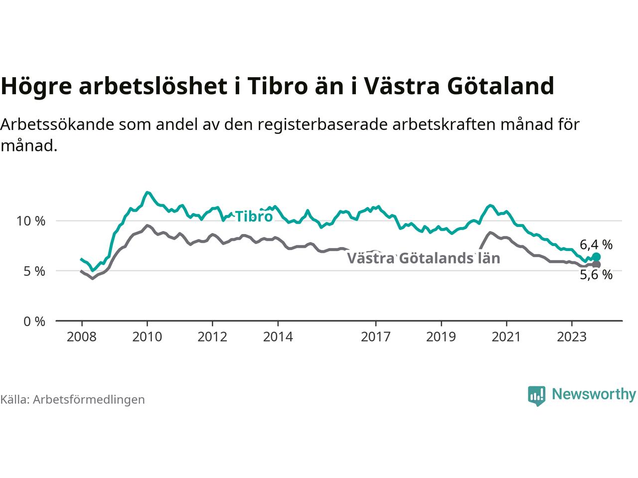 Under oktober månad rapporterade Tibro kommun en total arbetslöshet på 6,4 procent. Det är en minskning jämfört med samma tidpunkt i fjol (−0,8 procentenheter). Även i Västra Götalands län sjunker arbetslösheten .