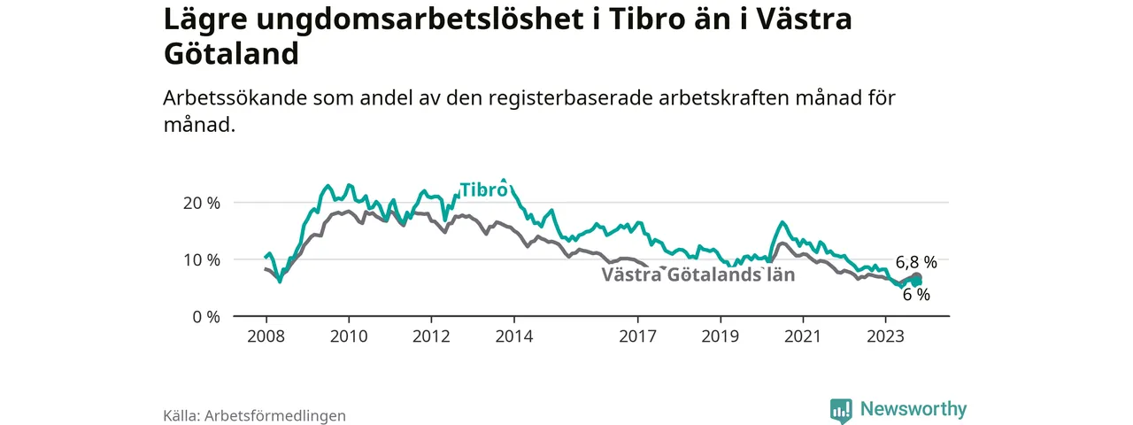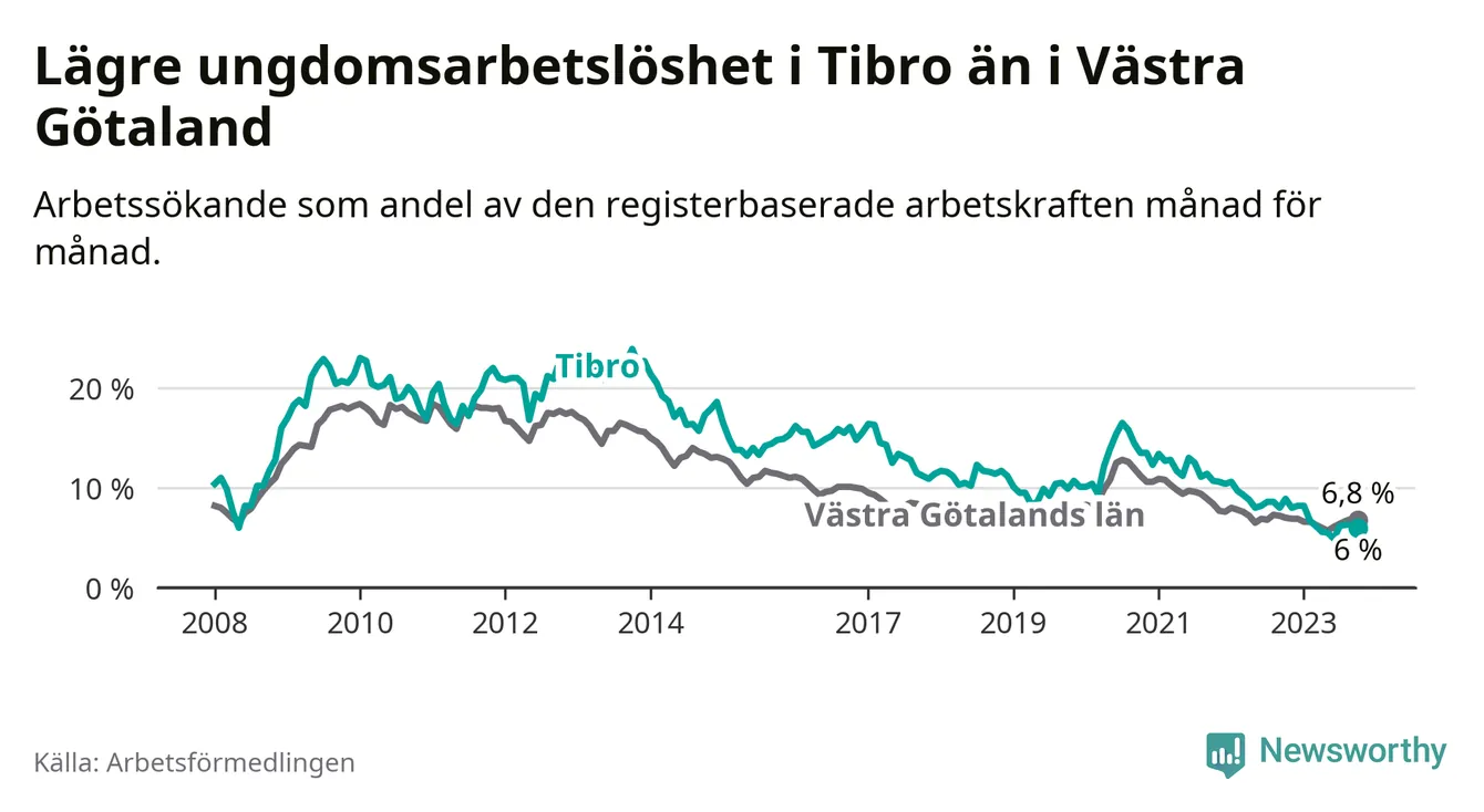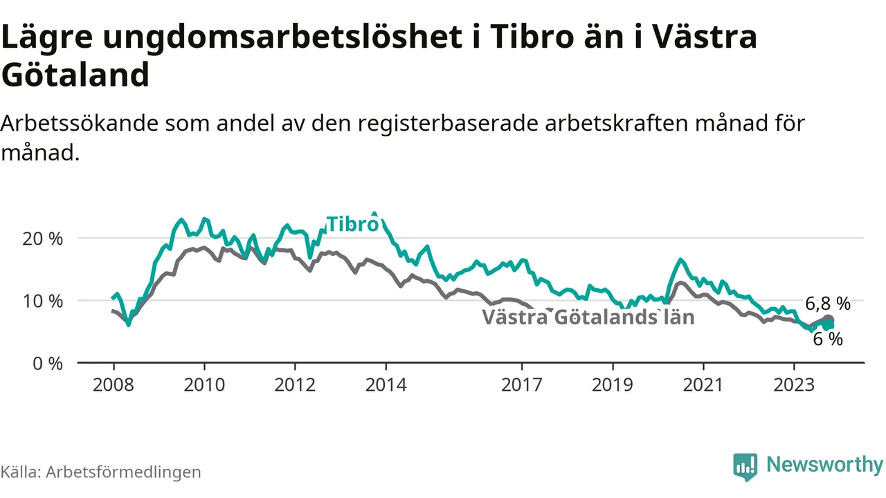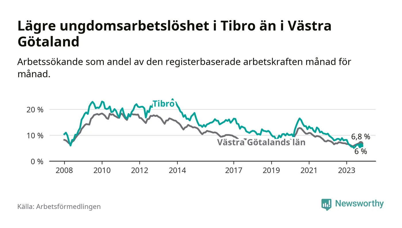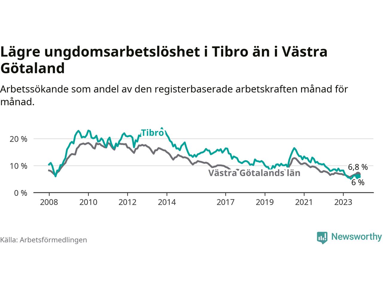 Medan Tibro har högre total arbetslöshet än Västra Götaland, ligger ungdomsarbetslösheten 0,8 procentenheter lägre i Tibro.